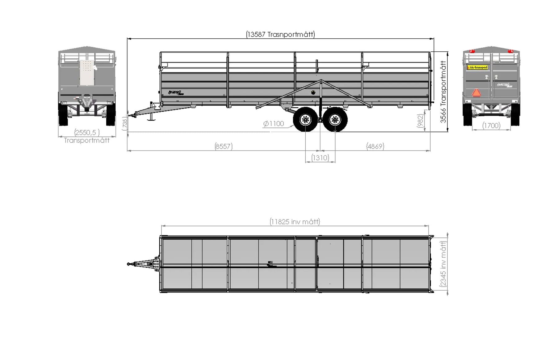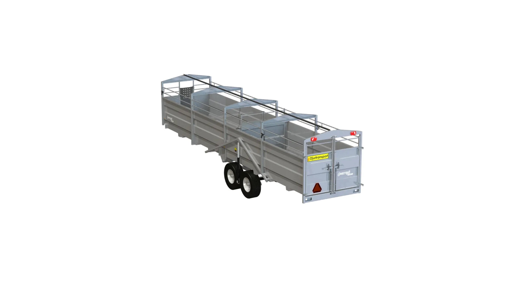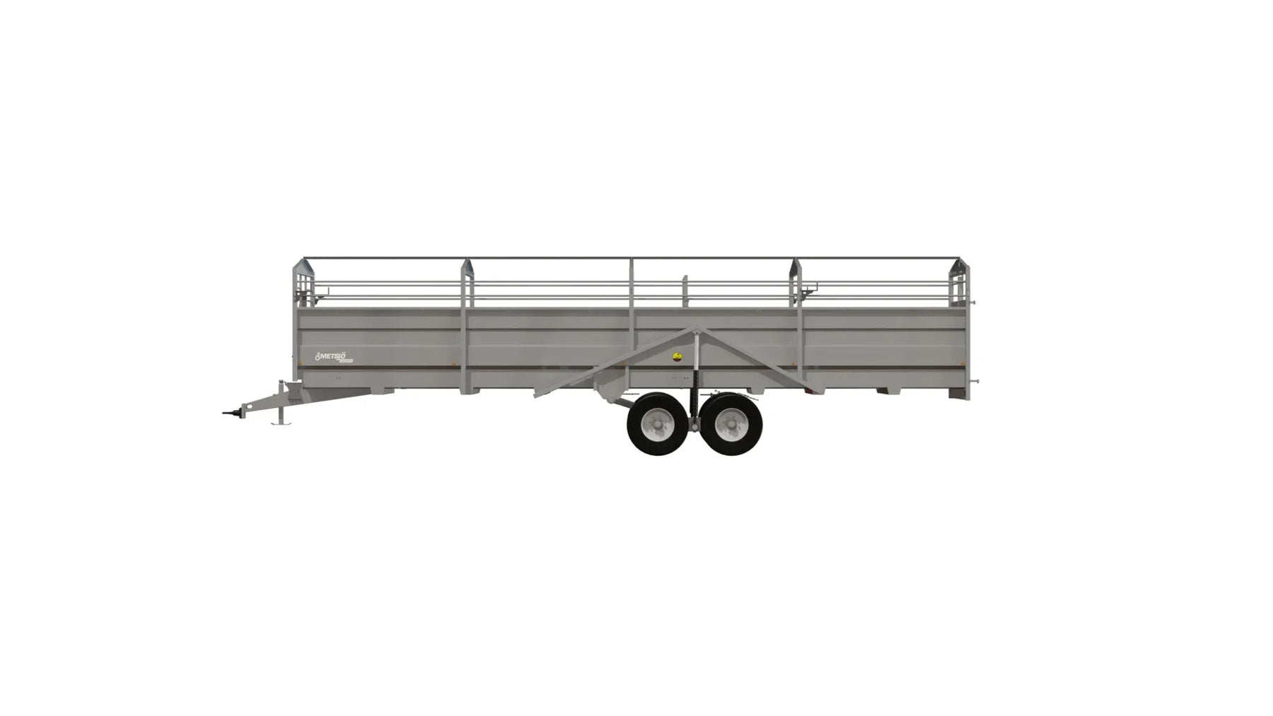 MetaMove 12m Hjul 385/65x22,5 Artikelnummer komplett: 158460 Längd 13 600mm (lastplan 12000mm ) Bredd 2550mm (inv 2350mm raka sidor) Flakhöjd Kör läge 1050mm, Last läge 250mm Hydraulisk reglerbart från förarplats. Total höjd 3450mm (kör höjd in dragna hjul) Golv plan Halksäkrad stålplåt, Bomberad för tysttrafik Pendelboggi cc 1310 mm, Max belastning 6 500 ton/axel Avstånd över navflänsar 1850 mm. Anslutning 220x275x8 mutter öppen Bromsar: hydrauliska på alla hjul - enligt VVFS 2003: 20, 5 Kap. 12 § Atomatisk justerbara bromsarmar Max 110 bar hydraultryck. Skyddsplåt förhindrar smuts i trumma Slagport bak 270” excenterhängda. Med möjlighet att öppna 50% höjd 2150mm Främre evakueringsdörr Bultbart mellandörrar 1st standard (inv. avskiljning). Hänge för yttre djurgrindar standard 1+1 Fäste för extra yttre djurgrind 1+1 Fäste för valbart drag. Hitchögel standard. Stödlast 3 000kg Teleskop stödben Belysning enligt TSV Diod 12/24 Volt 7 pol Hydraulik 1 DV med hydraullås säker trafik. Färg Metsjö Grå Chassivikt 4 700 kg, Teknisk belastning 17 000 kg, Nyttolast 12 000 kg Tak ingår EJ som standard Ytbehandling: Förbehandling med alkalisk avfettning och blästring Sa 2,5 Karosseri kittas. Lackerat enl. ISO 12944 A3.09. Färgsystem: Epoxiprimer 2 x 70 μm. Täckfärg: Polyuretan 1 x 60 μm totalskikt ca. 200μm. Korrosivitetklass C4 L