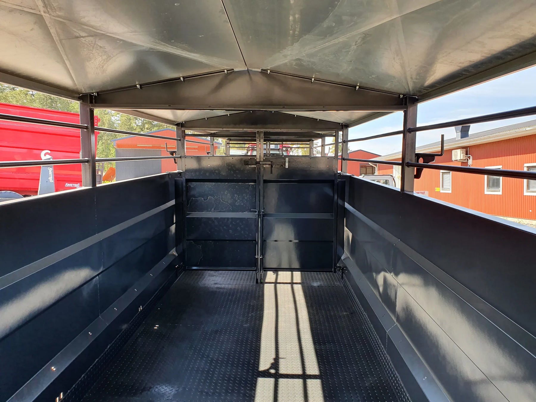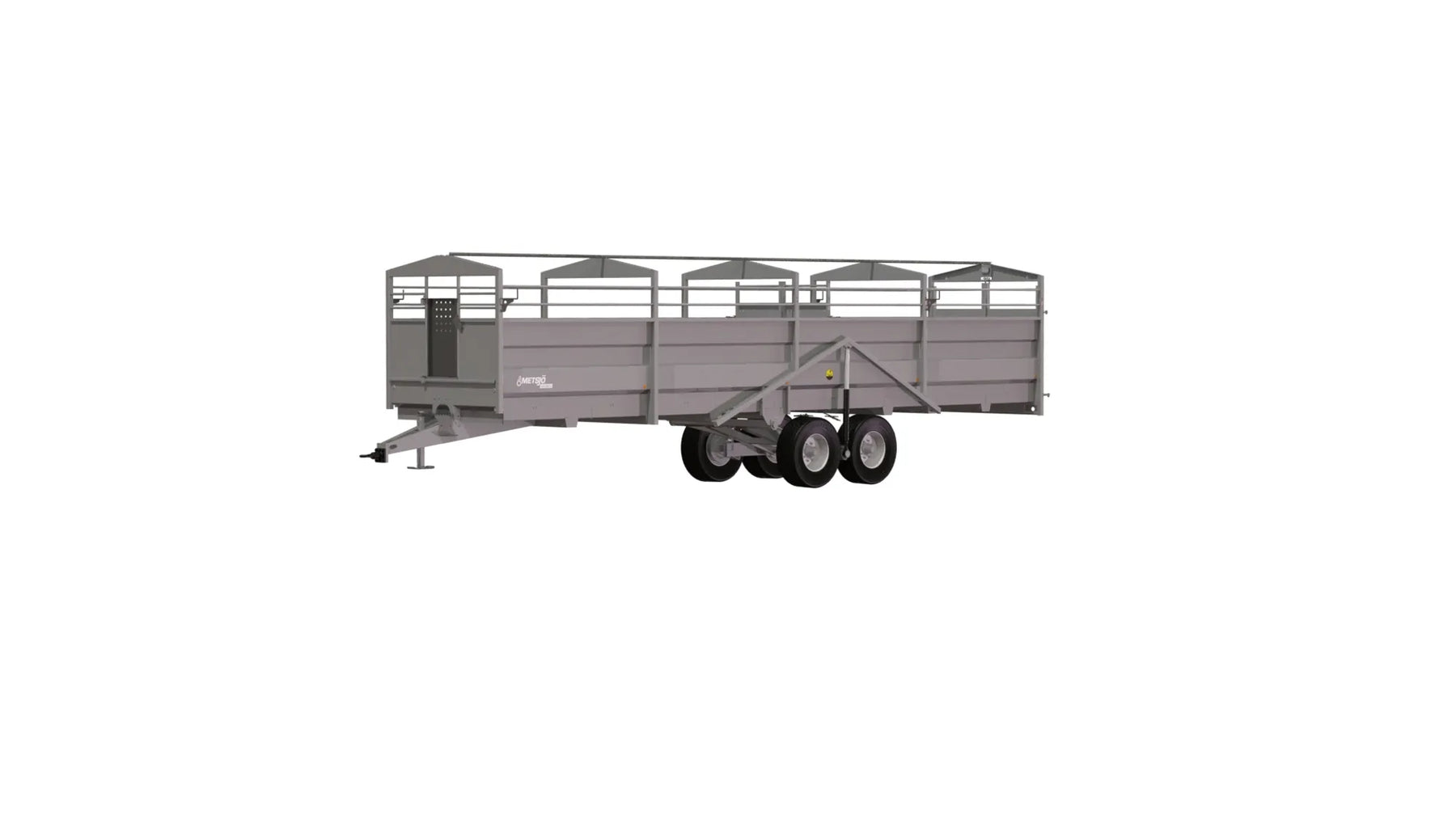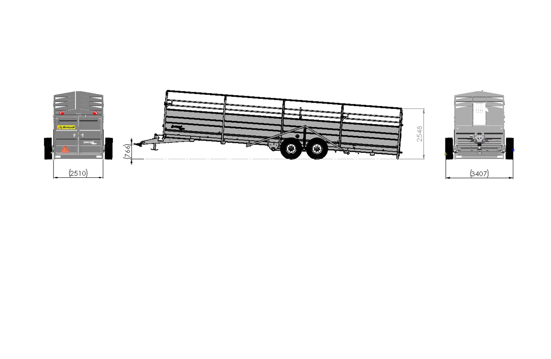 MetaMove 12m Hjul 385/65x22,5 Artikelnummer komplett: 158460 Längd 13 600mm (lastplan 12000mm ) Bredd 2550mm (inv 2350mm raka sidor) Flakhöjd Kör läge 1050mm, Last läge 250mm Hydraulisk reglerbart från förarplats. Total höjd 3450mm (kör höjd in dragna hjul) Golv plan Halksäkrad stålplåt, Bomberad för tysttrafik Pendelboggi cc 1310 mm, Max belastning 6 500 ton/axel Avstånd över navflänsar 1850 mm. Anslutning 220x275x8 mutter öppen Bromsar: hydrauliska på alla hjul - enligt VVFS 2003: 20, 5 Kap. 12 § Atomatisk justerbara bromsarmar Max 110 bar hydraultryck. Skyddsplåt förhindrar smuts i trumma Slagport bak 270” excenterhängda. Med möjlighet att öppna 50% höjd 2150mm Främre evakueringsdörr Bultbart mellandörrar 1st standard (inv. avskiljning). Hänge för yttre djurgrindar standard 1+1 Fäste för extra yttre djurgrind 1+1 Fäste för valbart drag. Hitchögel standard. Stödlast 3 000kg Teleskop stödben Belysning enligt TSV Diod 12/24 Volt 7 pol Hydraulik 1 DV med hydraullås säker trafik. Färg Metsjö Grå Chassivikt 4 700 kg, Teknisk belastning 17 000 kg, Nyttolast 12 000 kg Tak ingår EJ som standard Ytbehandling: Förbehandling med alkalisk avfettning och blästring Sa 2,5 Karosseri kittas. Lackerat enl. ISO 12944 A3.09. Färgsystem: Epoxiprimer 2 x 70 μm. Täckfärg: Polyuretan 1 x 60 μm totalskikt ca. 200μm. Korrosivitetklass C4 L