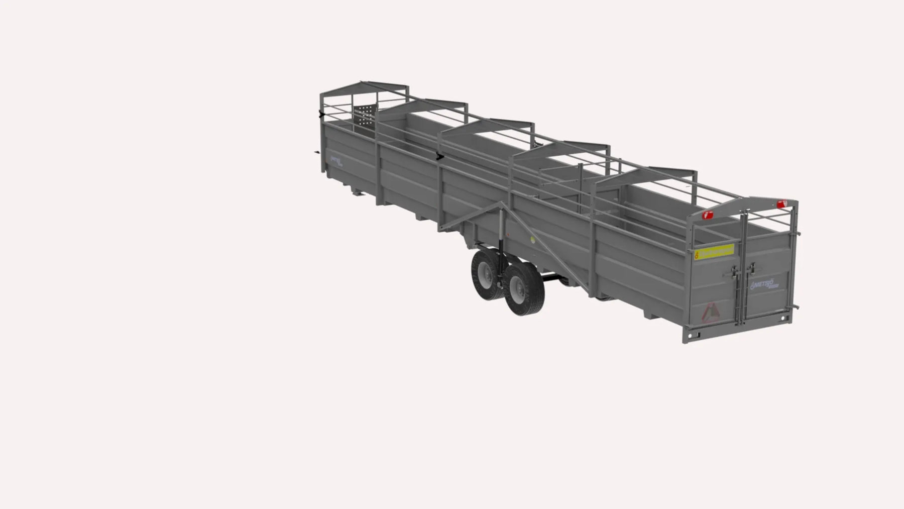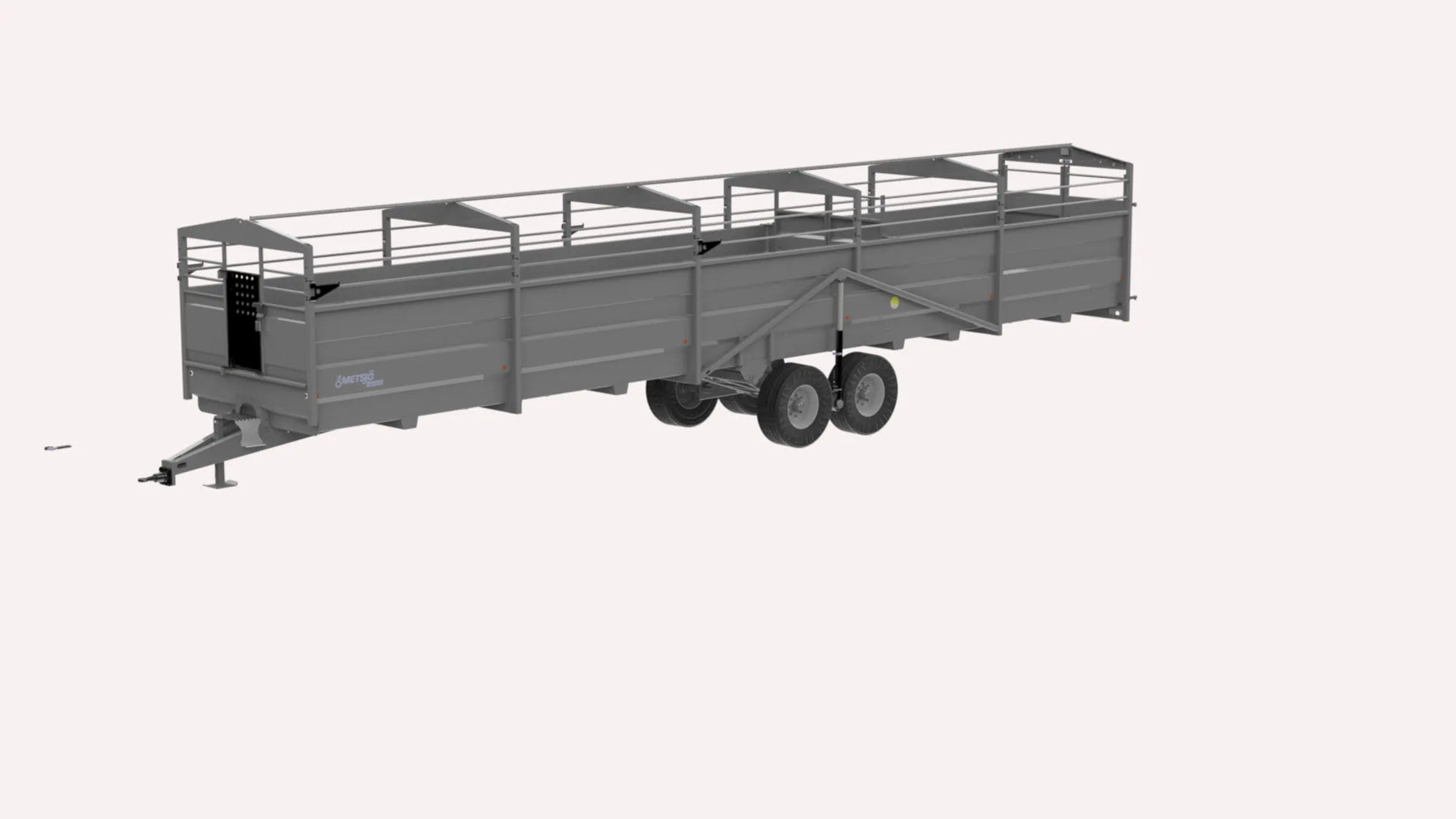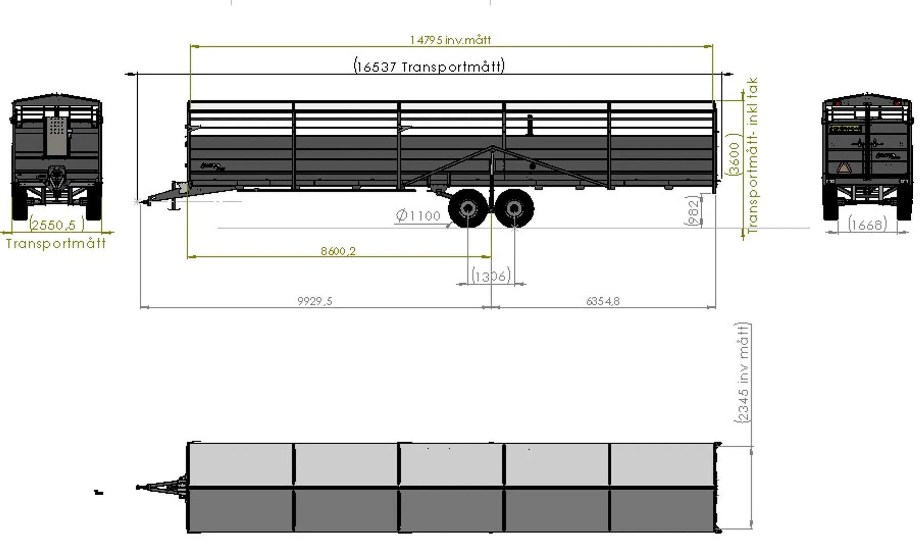 MetaMove 15m Hjul 385/65x22,5 Artikelnummer komplett: 175171 Längd 16 600mm (lastplan 15000mm ) Bredd 2550mm (inv 2350mm raka sidor) Flakhöjd Kör läge 1050mm, Last läge 250mm Hydraulisk reglerbart från förarplats. Total höjd 3450mm (kör höjd in dragna hjul) Golv plan Halksäkrad stålplåt, Bomberad för tysttrafik Pendelboggi cc 1310 mm, Max belastning 9 ton/axel Avstånd över navflänsar 1850 mm. Anslutning 220x275x8 mutter öppen Bromsar: hydrauliska på alla hjul - enligt VVFS 2003: 20, 5 Kap. 12 § Atomatisk justerbara bromsarmar Max 110 bar hydraultryck. Skyddsplåt förhindrar smuts i trumma Slagport bak 270” excenterhängda. Med möjlighet att öppna 50% höjd 2150mm Främre evakueringsdörr Bultbart mellandörrar 1st standard (inv. avskiljning). Hänge för yttre djurgrindar standard 1+1 Fäste för extra yttre djurgrind 1+1 Fäste för valbart drag. Hitchögel standard. Stödlast 3 000kg Teleskop stödben Belysning enligt TSV Diod 12/24 Volt 7 pol Hydraulik 1 DV med hydraullås säker trafik. Färg Metsjö Grå vikt 5000 kg, Teknisk belastning 21 000 kg, Nyttolast 16 000 kg Tak ingår EJ som standard Ytbehandling: Förbehandling med alkalisk avfettning och blästring Sa 2,5 Karosseri kittas. Lackerat enl. ISO 12944 A3.09. Färgsystem: Epoxiprimer 2 x 70 μm. Täckfärg: Polyuretan 1 x 60 μm totalskikt ca. 200μm. Korrosivitetklass C4 L