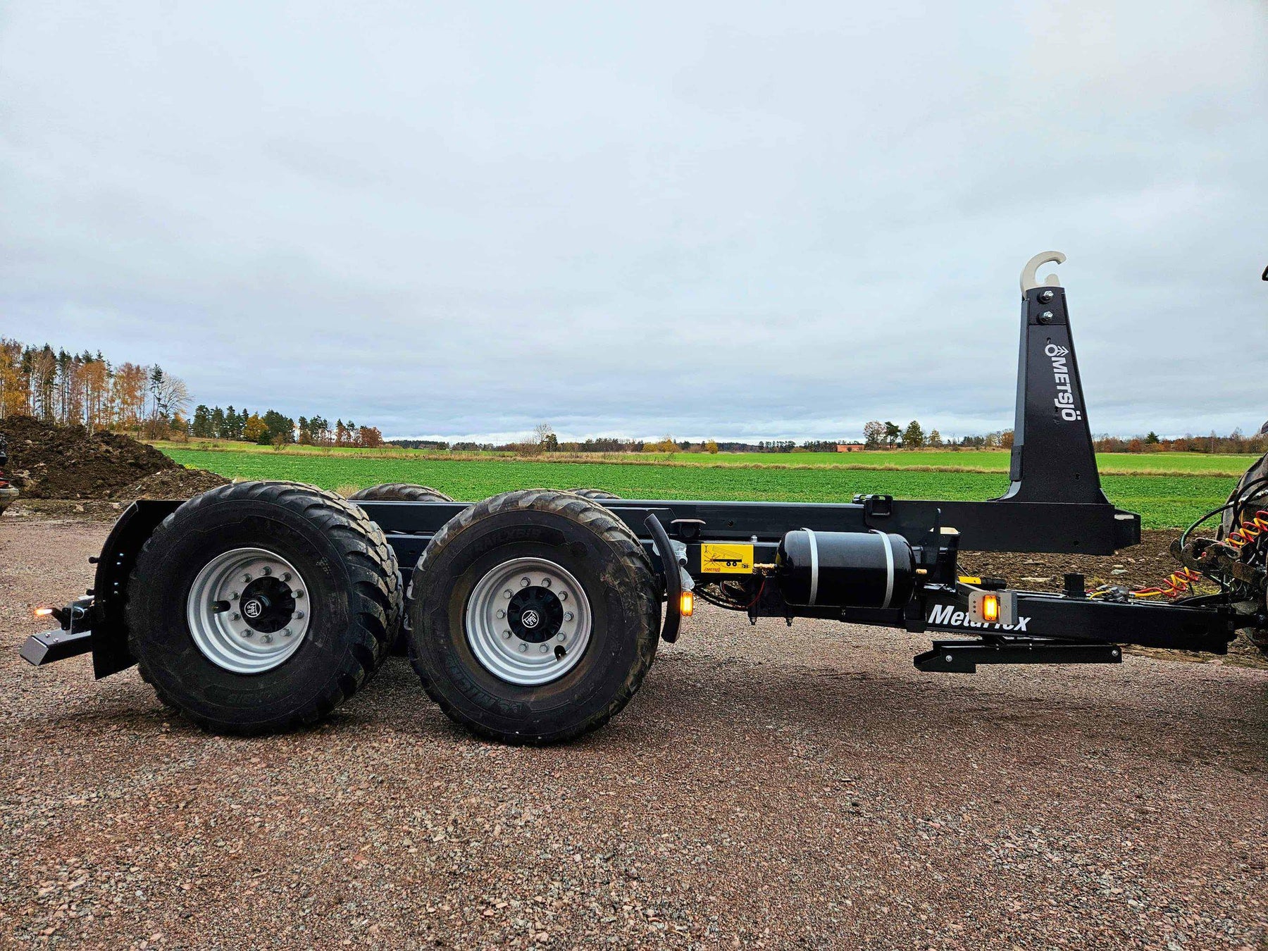 Artikelnummer: 172270 Rullflak SIS 3021, SS 3659, DIN 30722. Lyftbygelhöjd fast krok 1450mm - 1570mm Rullflaklängder 4000mm - 6000mm, Optimerad för 5,2m container Teleskopiskt torn (1050mm) med valfri stödlast mot dragare Främre drag med möjlighet för drag-höjds justering (tillval hydrauliskt vikbar) Axlar: Hel axelkropp 110x110, Avstånd över navflänsar 1800 mm Belastning 8,5 ton vid 60 km. Laserriktade. Ytbehandlade enligt KTL- metoden, svart Avstånd mellan boggiaxlar cc 1350 mm (17 ton). Axelupphängning "Road" Anslutning 220x275 x8 öppen mutter Kommunicerande kärl: Hydrauliskt reglerbart chassi 350 mm vid chassit. Bromsstorlek: 340x110. Hydrauliska bromsar på alla hjul - enligt VVFS 2003: 20, 5 Kap. 12 § Brake N3411- 1 Manuel bromsarmar . Max 110 bar hydraultryck. Skyddsplåt förhindrar smuts i trumma Hydrauluttag mot traktorn: 3 DV + fri retur + broms, Elsystem 12 Volt Tippkraft 17 ton vid 5,2m container, fullt framskjuten vid 210 bars tryck Tippvinkel 55º. Oljevolym vid tippning 18 liter Växlingskraft 18 ton. Oljevolym vid växling 20 liter Oljevolym traktor: 16L/210 bar, Oljetank i traktor: min. 20L Belysning enligt TSV Diod 12/24 Volt 7 pol Hydrauliskt skifte mellan tipp och växling Fäste för valbart drag. Standard hitch ögel Fäste för tillval hydrauliskt markstöd Fäste för bakre Hydraulik / el-uttag och på gaffel (torn) Förberett för tillval reglering av chassihöjd från förarplats Fäste för tillval Hydrauliskt utskjuktbar underkörningsskydd Färg Metsjö grå Chassivikt 3 100 kg, Teknisk belastning 20 000 kg, Nyttolast 16 900 kg Ytbehandling: Förbehandling med alkalisk avfettning och blästring Sa 2,5 Karosseri kittas. Lackerat enl. ISO 12944 A3.09. Färgsystem: Epoxiprimer 2 x 70 µm. Täckfärg: Polyuretan 1 x 60 µm totalskikt ca. 200µm. Korrosivitetklass C4 L Kringutrustning: Hydrauliskt stödben