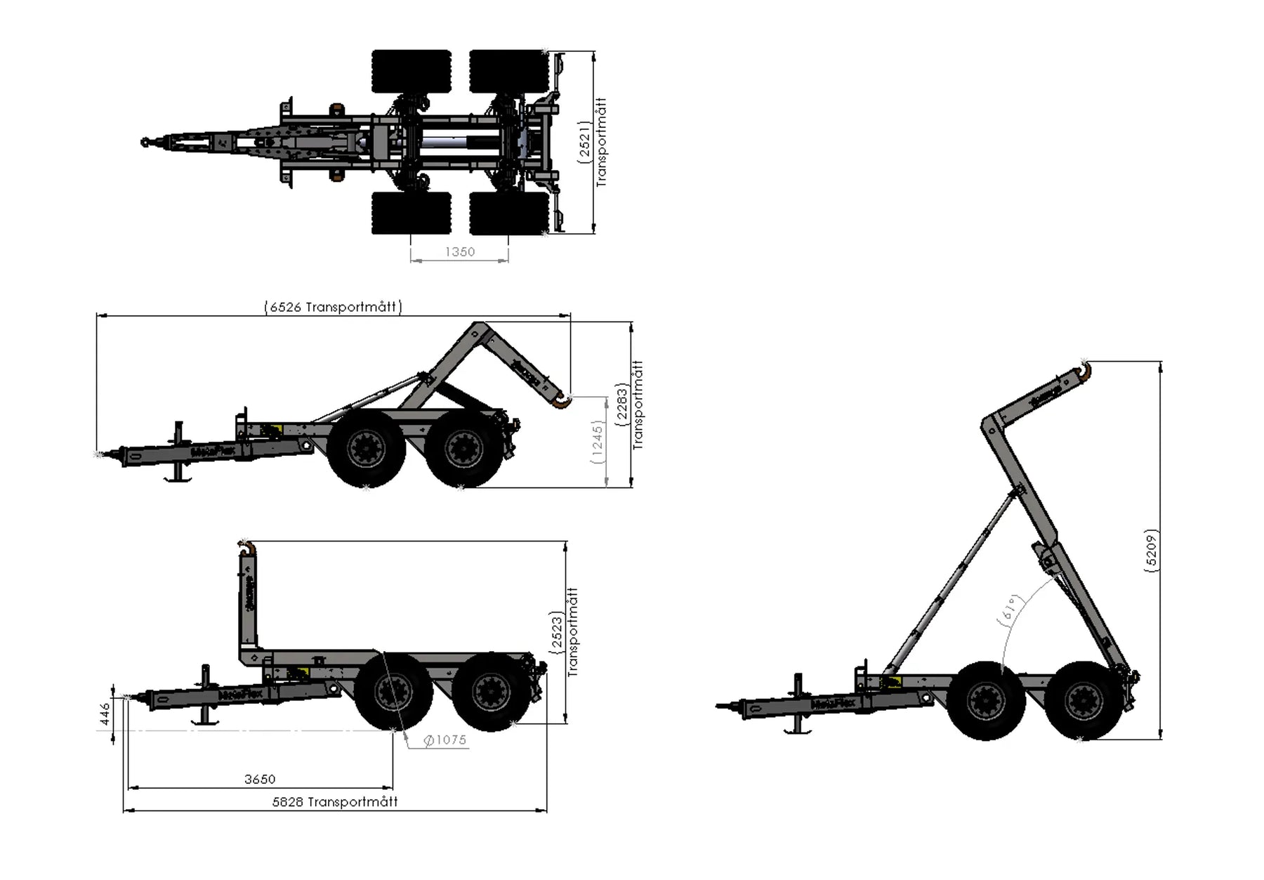 Artikelnummer: 171586 Rullflak SIS 3021, SS 3659, DIN 30722. Lyftbygelhöjd fast krok 1450mm - 1570mm Rullflaklängder 4000 mm - 4500 mm Axlar: Hel axelkropp 120x120, Avstånd över navflänsar 2 000 mm Belastning 10,5 ton vid 62 km. Laserriktade. Ytbehandlade enligt KTL- metoden, svart Avstånd mellan boggiaxlar cc 1350 mm. Axelupphängning "Road" Medspårande axel med hydraulisk låsning vid backning (axel 2) Anslutning 280x335x10 kupolmutter Kommunicerande kärl: Hydrauliskt reglerbart chassi 350 mm från förarplatsen Bromsstorlek: 410x120. Hydrauliska bromsar på alla hjul - enligt VVFS 2003: 20, 5 Kap. 12 § Automatbromsarmar AGS. Max 110 bar hydraultryck. Skyddsplåt förhindrar smuts i trumma Hydrauluttag mot traktorn: 2 DV + 1 EV + fri retur + broms, Elsystem 12 Volt Extra Tippkraft 18 ton, tippvinkel 61º. Oljevolym vid tippning 23 liter 138/60 -2830 Extra Växlingskraft 18 ton, vinkel max 28º. Oljevolym vid växling 3 liter 138 Oljevolym traktor: 23L/210 bar, Oljetank i traktor: min. 26L Belysning enligt TSV Diod 12/24 Volt 7 pol Manuell skiftning mellan tipp och växling Fäste för valbart drag Fäste för tillval hydraulisk skiftning mellan tipp och växling Fäste för tillval hydrauliskt markstöd Färg Metsjö grå Chassivikt 2 300 kg, Teknisk belastning 19 000 kg, Nyttolast 16 700 kg Ytbehandling: Förbehandling med alkalisk avfettning och blästring Sa 2,5 Karosseri kittas. Lackerat enl. ISO 12944 A3.09. Färgsystem: Epoxiprimer 2 x 70 µm. Täckfärg: Polyuretan 1 x 60 µm totalskikt ca. 200µm. Korrosivitetklass C4 L Kringutrustning: Hydrauliskt uttag på tornet, dubbelverkande 1/4, 129935