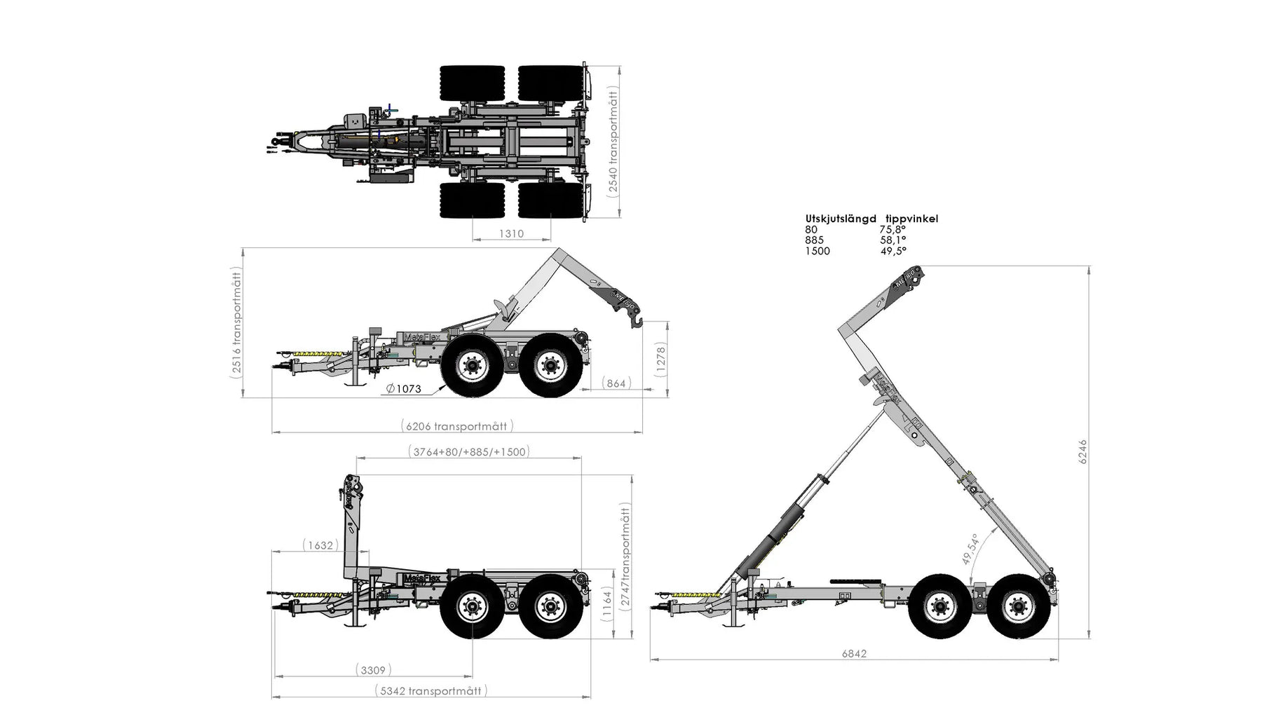 Artikelnummer: 105454 Rullflak SIS 3021, SS 3659, DIN 30722. Lyftbygelhöjd krok 1450mm - 1570mm Rullflaklängder 4500 mm - 5050 mm - 6000 mm, Hydraulisk längdreglering Pendelboggi avstånd 1310 mm, Max belastning 9 ton/axel Avstånd över navflänsar 1780 mm. Ytbehandlas enligt KTL- metoden, svart Axel profil 120. Anslutning 220x275x8 mutter öppen Hydrauliska bromsar på alla hjul - enligt VVFS 2003: 20, 5 Kap. 12 § Automatbromsarmar AGS. Max 110 bar hydraultryck. Skyddsplåt förhindrar smuts i trumma Hydrauluttag mot traktorn: 2 DV + broms, Elsystem 12 Volt El. panel förarplats: Ramspärrs diod indikering/Elektrisk parkeringsbroms/Frigöra ramspärren Tippkraft 14 ton, tippvinkel 75º-62º-50º Växlingskraft 14 ton Oljevolym traktor: 12L/210Bar Belysning enligt TSV Diod 12/24 Volt 7 pol Fäste för tillval boggilift Fäste för valbart drag Färg Metsjö grå Chassivikt 3400 kg, Teknisk belastning 21 000 kg, Nyttolast 17 600 kg Ytbehandling: Förbehandling med alkalisk avfettning och blästring Sa 2,5 Karosseri kittas. Lackerat enl. ISO 12944 A3.09. Färgsystem: Epoxiprimer 2 x 70 µm. Täckfärg: Polyuretan 1 x 60 µm totalskikt ca. 200µm. Korrosivitetklass C4 L Kringutrustning: Hydrauliskt uttag på tornet, dubbelverkande 1/4, 108066 Bultbart bakdrag + eluttag 7 pol, 105366