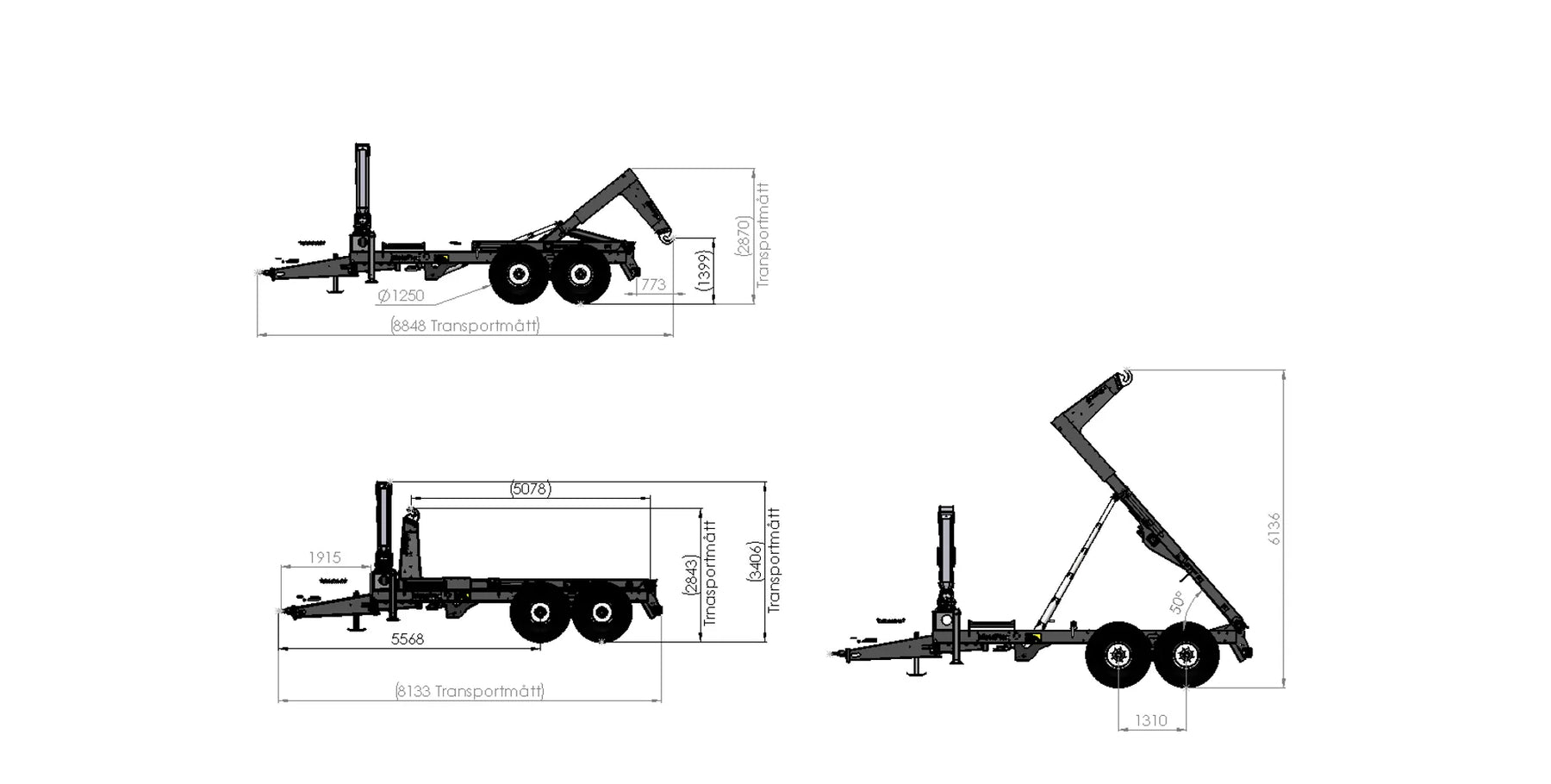 Artikelnummer: 151642 Rullflak SIS 3021, SS 3659, DIN 30722. Lyftbygelhöjd fast krok 1450mm - 1570mm Rullflaklängder 5000 - 5500 mm (Mekanisk begränsning) Ramstyrningsled/Dragögla cc 1488mm Styrvinkel 40". Dubbelverkande funktion med hydraullås Kranfäste Cranab + montering Kranfot 350x350/8 Höjd rullramsannlägg/kranfot215mm Cranab EC8 / 9,2 m // 1800 pelare Hydrauliska stödben vagns monterade (ventil dito från Kran) Skjutbart torn Mekanisk begränsning Rullflaks längd 5500 Pendelboggi cc 1310 mm, Max belastning 9 ton/axel Avstånd över navflänsar 1780 mm. Ytbehandlas enligt KTL- metoden, svart Axel profil 120. Anslutning 220x275x8 mutter öppen Bromsar: hydrauliska på alla hjul - enligt VVFS 2003: 20, 5 Kap. 12 § Automatbromsarmar AGS. Max 110 bar hydraultryck. Skyddsplåt förhindrar smuts i trumma Hydrauluttag mot traktorn: 2 DV + friretur + broms, Elsystem 12 Volt Tippkraft 20 ton, tippvinkel 52º. Oljevolym vid tippning 29L Växlingskraft 20 ton. Oljevolym vid växling 18L Oljevolym traktor: 29L/210 bar, Oljetank i traktor: min. 47L Max Oljeflöde ½ 6o liter Belysning enligt TSV Diod 12/24 Volt 7 pol Mekanisk skiftning mellan tipp och växling Fäste för tillval boggilift Fäste för valbart drag Fäste för tillval hydraulisk skiftning mellan tipp och växling Fäste för ökat Flöde Tipp-växling Fäste för tillval hydrauliskt markstöd Fäste för tillval yttre hydraulisk låsning/mekanisk DK låsning Färg Metsjö grå Chassivikt 4400 kg, Teknisk belastning 21 000 kg, Nyttolast 16 600 kg Ytbehandling: Förbehandling med alkalisk avfettning och blästring Sa 2,5 Karosseri kittas. Lackerat enl. ISO 12944 A3.09. Färgsystem: Epoxiprimer 2 x 70 µm. Täckfärg: Polyuretan 1 x 60 µm totalskikt ca. 200µm. Korrosivitetklass C4 L