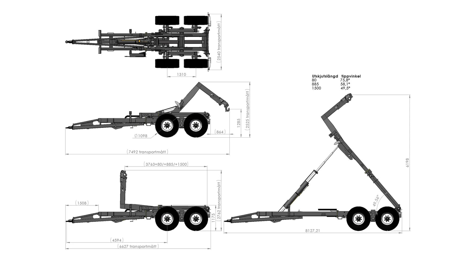 Artikelnummer: 105907 Rullflak SIS 3021, SS 3659, DIN 30722. Lyftbygelhöjd krok 1450mm - 1570mm Rullflaklängder 4500 mm - 5050 mm - 6000 mm, Hydraulisk längdreglering Palfingerfäste Pendelboggi avstånd 1310 mm, Max belastning 9 ton/axel Avstånd över navflänsar 1780 mm. Ytbehandlas enligt KTL- metoden, svart Axel profil 120. Anslutning 220x275x8 mutter öppen Hydrauliska bromsar på alla hjul - enligt VVFS 2003: 20, 5 Kap. 12 § Automatbromsarmar AGS. Max 110 bar hydraultryck. Skyddsplåt förhindrar smuts i trumma Hydrauluttag mot traktorn: 1 DV + broms, Elsystem 12 Volt El. panel förarplats: Ramspärrs diod indikering/Elektrisk parkeringsbroms/Frigöra ramspärren Tippkraft 14 ton, tippvinkel 75º-62º-50º Växlingskraft 14 ton Oljevolym traktor: 12L/210Bar Belysning enligt TSV Diod 12/24 Volt 7 pol Fäste för tillval boggilift Fäste för valbart drag Färg Metsjö grå Chassivikt 3750 kg, Teknisk belastning 21 000 kg, Nyttolast 17 250 kg Ytbehandling: Förbehandling med alkalisk avfettning och blästring Sa 2,5 Karosseri kittas. Lackerat enl. ISO 12944 A3.09. Färgsystem: Epoxiprimer 2 x 70 µm. Täckfärg: Polyuretan 1 x 60 µm totalskikt ca. 200µm. Korrosivitetklass C4 L