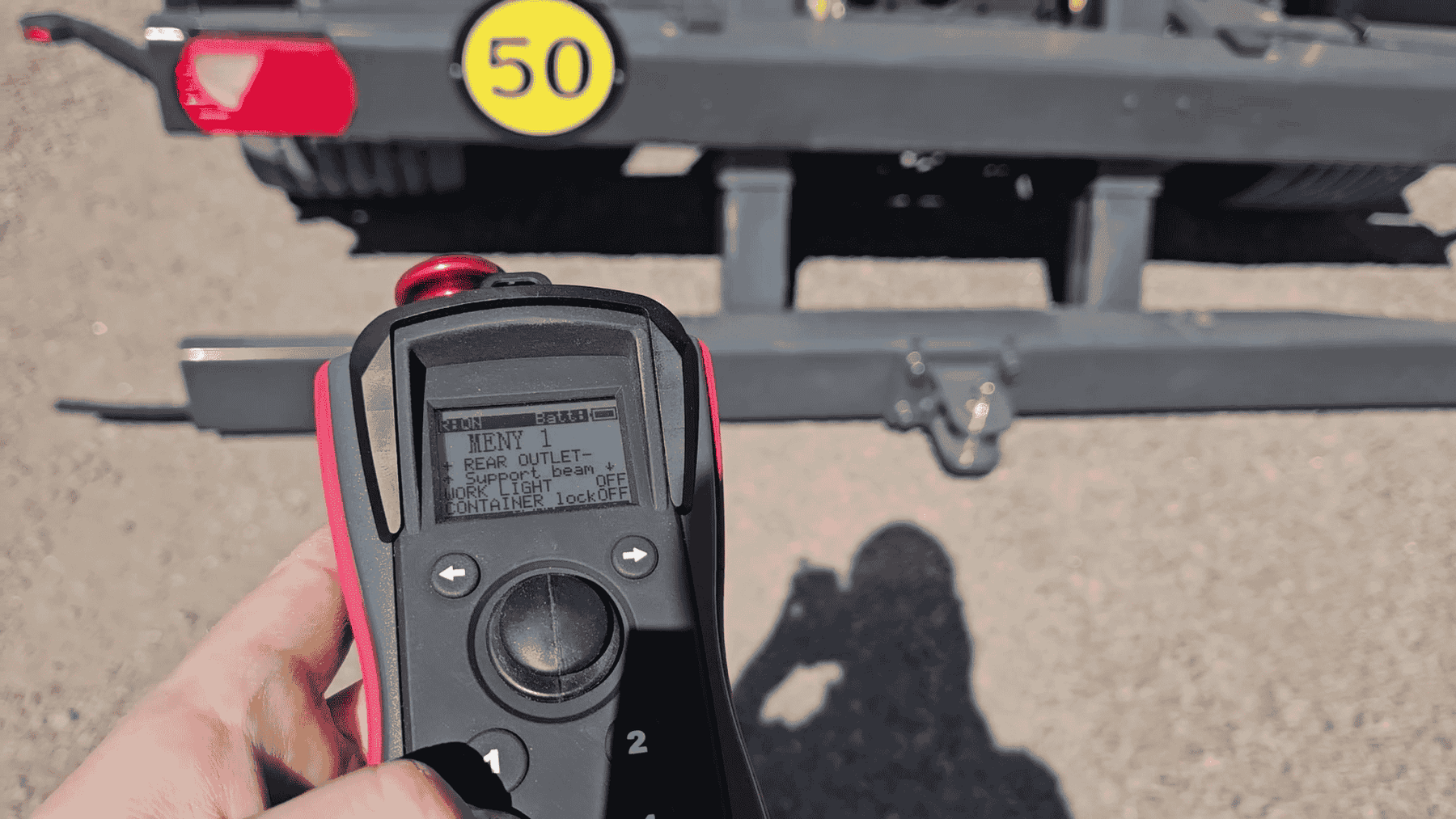 Reglering från förarplats: tipp/växling - skjutbart torn/dubbeluttag bak - markstöd/styrlås (höjd- och sid reglering)