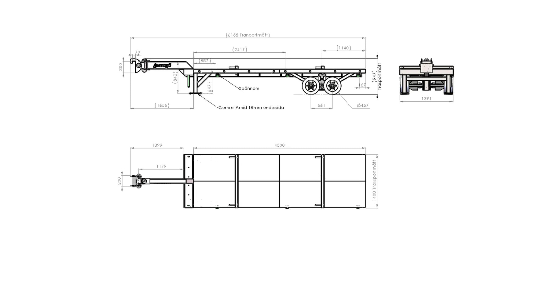 Matrialvagn art 154867 Längd 4500 Bredd 1400 Flak höjd 650 Pendelbogg o-bromsade axelar profil 70x70 tapp lastar i bogie i 25 km/h 2750 kgx4 ger 11 ton Hjul Massiva banor på stålfälg med 6-bults hålning.161-205-6 Diameter: 457 mm Bredd: 229 mm Belastning 2475 Kg/st vid 16 km/h Flakplan av tårplåt hacksäkrad. CC 555 uttag för spänband. Förvarings fack drenerade Bankar med stackhylsor Färg Metsjö grå Chassivikt 1500 kg Ytbehandling: Förbehandling med alkalisk avfettning och blästring Sa 2,5 Karosseri kittas. Lackerat enl. ISO 12944 A3.09. Färgsystem: Epoxiprimer 2 x 70 µm. Täckfärg: Polyuretan 1 x 60 µm totalskikt ca. 200µm. Korrosivitetklass C4 L