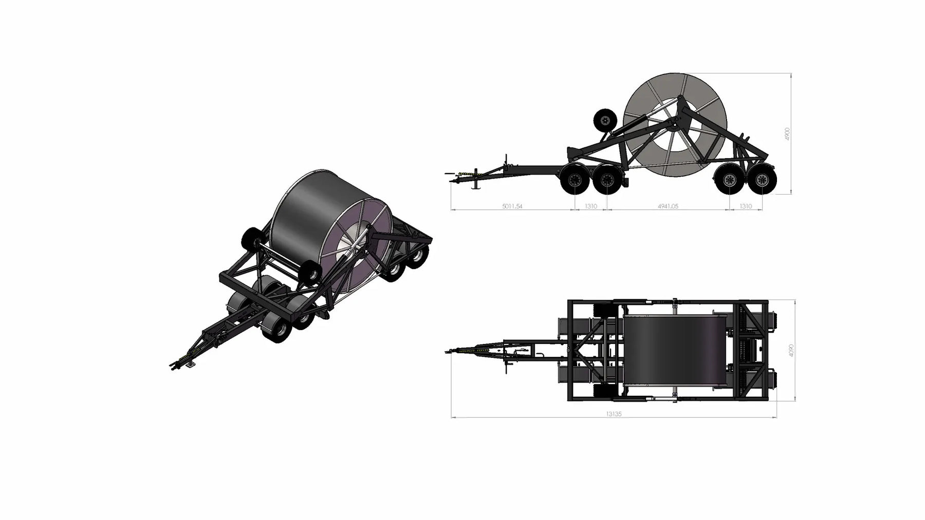 Hanterar kabeltrumma Dia 4500 Bredd 3700 Vilkt 35,5ton Centumhål 150 Greppbredd mellan skänkel 3680 Hjul: 600/50 R22,5 Längd11 500 Bredd 3500 Höjd 3900 Dolly girohängd dragstång. Dolly stödvikt 3 ton. Drag bultad hitchögel Boggi på dolly: kommunicerande kärl - olja reglerbar 350 mm Axlar: Hel axelkropp 120x120, Avstånd över navflänsar 2 000 mm Belastning 10,5 ton vid 62 km Laserriktade. Anslutning 280x335x10 kupolmutter Avstånd mellan boggiaxlar cc 1540 mm (18t ) Axelupphängning Road Broms 410x120.2 axl hyd. 50% Enl VVFS 2003 :6 Max 110 bars hydraultryck Automatbromsarmar AGS. Skyddsplåt förhindrar smuts i trumma Boggi på trumvagn Pendelboggi cc 1310, max belastning 10,5 ton/axel Avstånd över navflänsar 2375 mm UTV hjul 2970. Ytbehandlade enligt KTL- metoden svart Axel profil 120. Anslutning 220x275x8 mutter öppen Broms 2 axl hyd. 50% Enligt VVFS 2003 :6 Max 130 bar hydraultryck Automatbromsarmar AGS. Skyddsplåt förhindrar smuts i trumma Hydrauluttag 1st dubel verkande .Oljevolym 20 l /250 bar.Oversenterventil.Tryckreducerad - sida 110bar. Mekanisk låssäkring vid transport. Manuell 1st per sida Egen vikt 9500 kg Teknisk belastning 45 000 kg Ytbehandling: Förbehandling med alkalisk avfettning och blästring Sa 2,5 Karosseri kittas. Lackering: C2 i BSK 99 tvåkomponent, rostskyddspigmenterad blank polyuretan med god väder-och nötningsbeständighet. Metsjö BlyersGrå Kringutrustning Höjd sidreglering från förarplats (dolly), 117381 12 volt.. Boggispärr axel 2 på Dolly Då bakereboggi lyfts (elektron öga iVÄ cahssistöd) 12 volt Handpump För att bromsa Kabbeltruma. tank 2L dubbelverkande- 3-vägs kran. Funktion:1 annsätta bromshjul 2 Annstäbroms. manometer båda funktioner. Skärmar 4 axlar Dolly och PendellBoggi, 10521 Bakljusarmatur Diode underhållsfri 12/24 volt., 109601