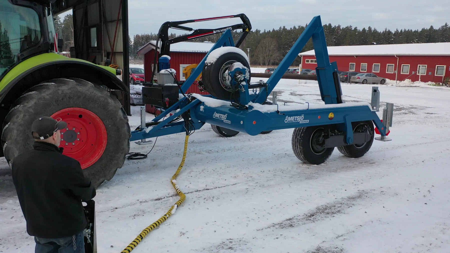 Hanterar kabeltrumma Dia 4100 Bredd 2400 Vilkt 16ton Rek Traktor 300 HK 8 tons vikt Centumhål 125 Greppbredd mellan skänkel 2750 Hydralik av lastad med hydraullås ventil.(säkerställer avlastning av hydralik - dragaren kan frigöras) Sidkorrigering av kabeltrumma hö-vä sida om terräng lutar med göres till 10 %. Strypkran monterad i krets. Längd 6150 Bredd 3900 Avstånd över navflänsar 3000 mm UTV 3350 hjul Pendelboggi cc 1310, max belastning 9 ton/axel Hjul 385/65x22,5 R Dia 1100 Bredd 385.Grus mönster Axel profil 120. Anslutning 220x275x8 mutter öppen Broms 2 axl hyd. 50% Enligt VVFS 2003 :6 Max 130 bar hydraultryck Automatbromsarmar AGS. Skyddsplåt förhindrar smuts i trumma Bakere stödben manuella Teleskåp.VÄ-HÖ sida (stabelisering då traktor ej är kopplad) Dragögel för hitch Teleskåpben för uppställning av vagnen Belysning ENL TSV Diode Bredlastskyltar belysta. Chassi vikt 4500 kg Teknisk belastning 21 000 kg Centrum axel 120599 Dia 125L3050 Vikt 175kg" Tp fäste för vila Vä-Hö sida..(2 st).. Centrumaxel har inv med bringare samt yttere låsning Kran Monterad på höger sida K20 Längd 4,5 Lyft 350kg enkel vridmotor, med flerspaksventil (5 sektioner) Utan grip och rotator Manöverpodier mobil 5m .Funktion hydrauliskt broms / Driv (fram/ bak) Funktionerna blir 2st spakar ( 1st 3-lägesfastalägen fram- bak- neutral= frihjul. 1st Broms återfjädrande) Spak för driv med fastläge flödes regulator Bromskretsen bromsar lite hårt( regulator) Hydraulisk driv BBC 05 Black Bruin på en stödrulle. 180bar max belastning 10 000kg Eldrivet Hydraulaggregat 10 liters tank 4 KW pump 20l/min 380Volt Motorskydd knapp 2,5KW PKZM01-2,5 274881 Väggintag IP44 416BS6 16-32A Går att använda utan ström dock utan broms och driv. CE dokumentation Ytbehandling: Förbehandling med alkalisk avfettning och blästring Sa 2,5 Karosseri kittas. Lackering: C2 i BSK 99 tvåkomponent, rostskyddspigmenteradblank polyuretan med god väder-och nötningsbeständighet. Kulör Metsjö Grå