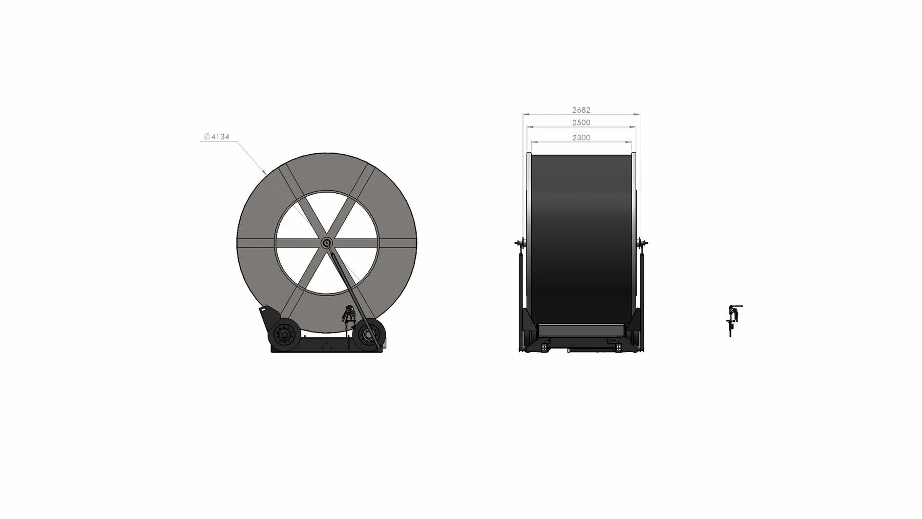 Underrullare Kabeltrumma Dia 4200 Bredd 2500 Vikt 34 ton. max vikt 36 ton Kabeltrumman är för illustrationssyfte Kabel beräknad max erforderlig dragkraft 8ton Utrullnings hastighet max 15m/min. Längd 3500. Bredd 2550 Höjd 800 Tom vikt 2500 kg Teknisk belastning 36 000 kg 4 st lyftfästen för 4 parts kätting Tippskydd. Utdragbart i kabel vänster - höger sid Skydd mellan rullar (skonar utrullande kabel) Broms 1 axel (den som inte har driv) Axlar fattning 280x335/10 Klämskydd Trumsäkring Manöverpodier mobil 5m .Funktion hydrauliskt broms / Driv . fram/ bak Funktionerna blir 2st spakar ( 1st 3-lägesfastalägen fram- bak- neutral= frihjul. 1st Broms återfjädrande) Hydraulisk driv BBC 05 Black Bruin på en stödrulle. 180bar max belastning 10 000kg Eldrivet Hydraulaggregat 10 liters tank 4,5KW pump 20l/min 380Volt Motorskydd knapp 2,5KW PKZM01-2,5 274881 Väggintag IP44 416BS6 16-32A Går att använda utan ström dock utan broms och driv. Lackas Metsjö Grå Körinstruktion/reservdels lista Dokumentation ce Engelsk/svenska