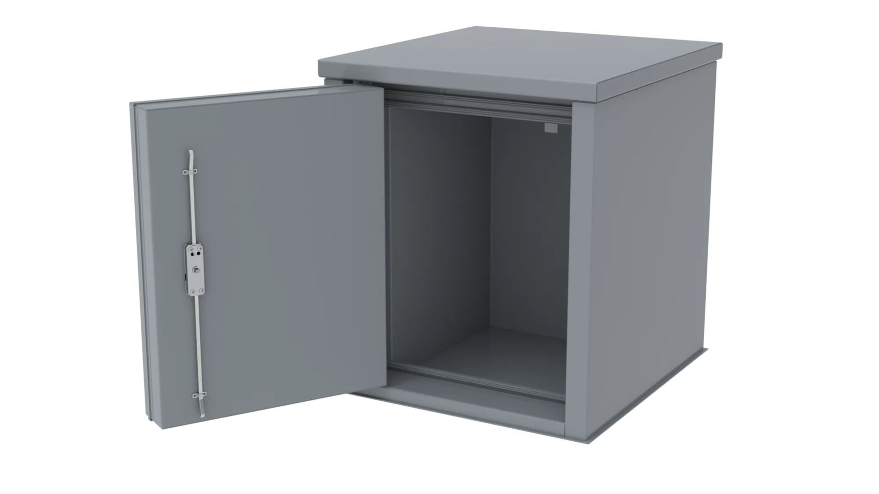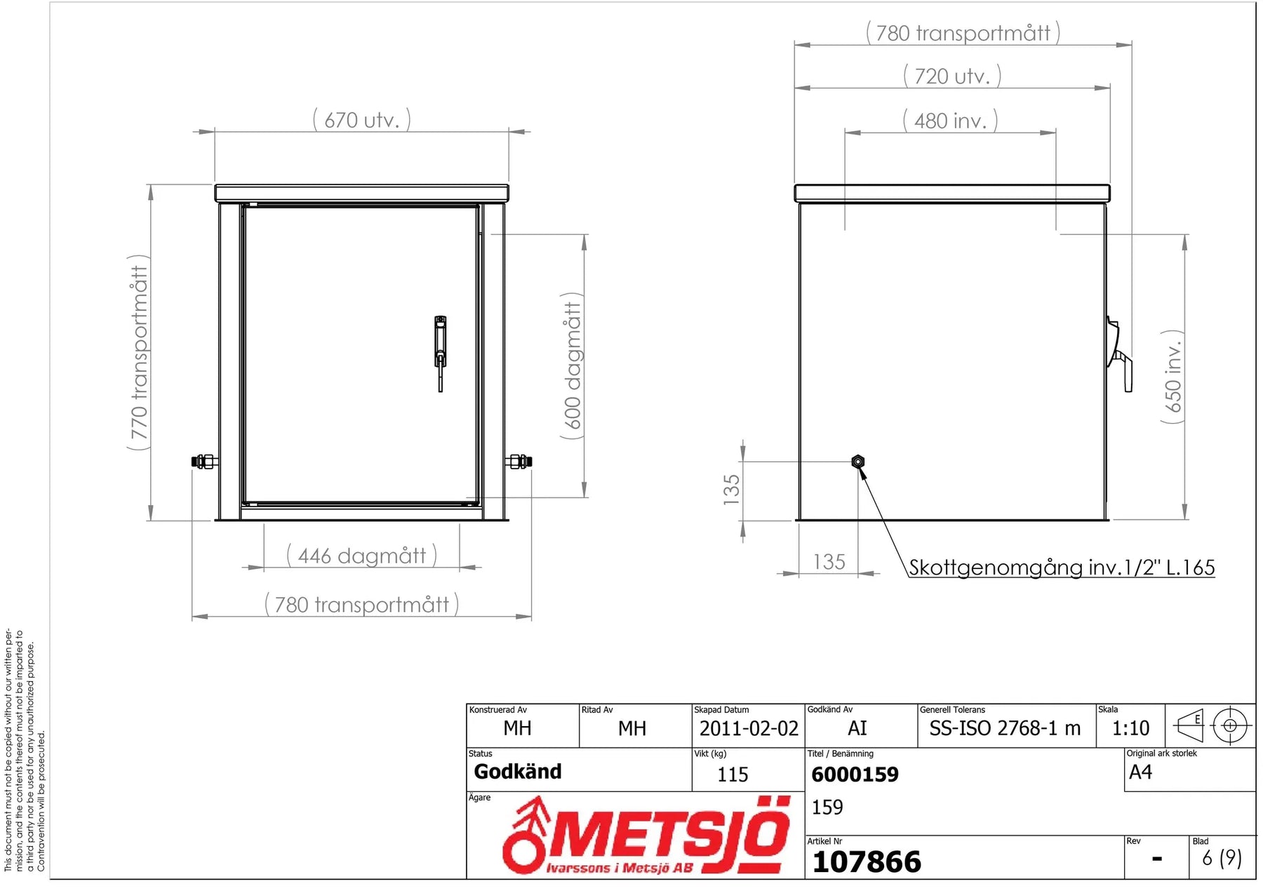 Invändigt mått B.H.D 446x650x480 mm. Transportmått B.H.D 670x770x780 mm. Isolerad enl kravet för EI30 avskiljning. Konstruktionen är testad enligt NT Fire 017. Konstruktion av 1,5 mm stålplåt svetsad. Vikt 120 kg. Godkänd försäkringsklass 2. Dörröppning öppnas 100º, cylinderlås typ spanjolett. Värmeexpanderande packning runt dörren. 2 st ventilationsstosar placerade diagonalt i bakstycket. Option kabel- eller rörgenomföring anges vid beställning. Ytbehandling enligt ISO 12944: Förbehandling med alkalisk avfettning och blästring Sa 2,5 Kittning sker där konstruktion ej medger helsvetsning C4-Med. Totalskikt ca 200µm. Epoxi grundfärg, Polyuretan täckfärg ger 15 år Inv. skåp C3 enl. Metsjö standard. Bildar en yta som väl bibehåller glans och kulör samt är lätt att rengöra.