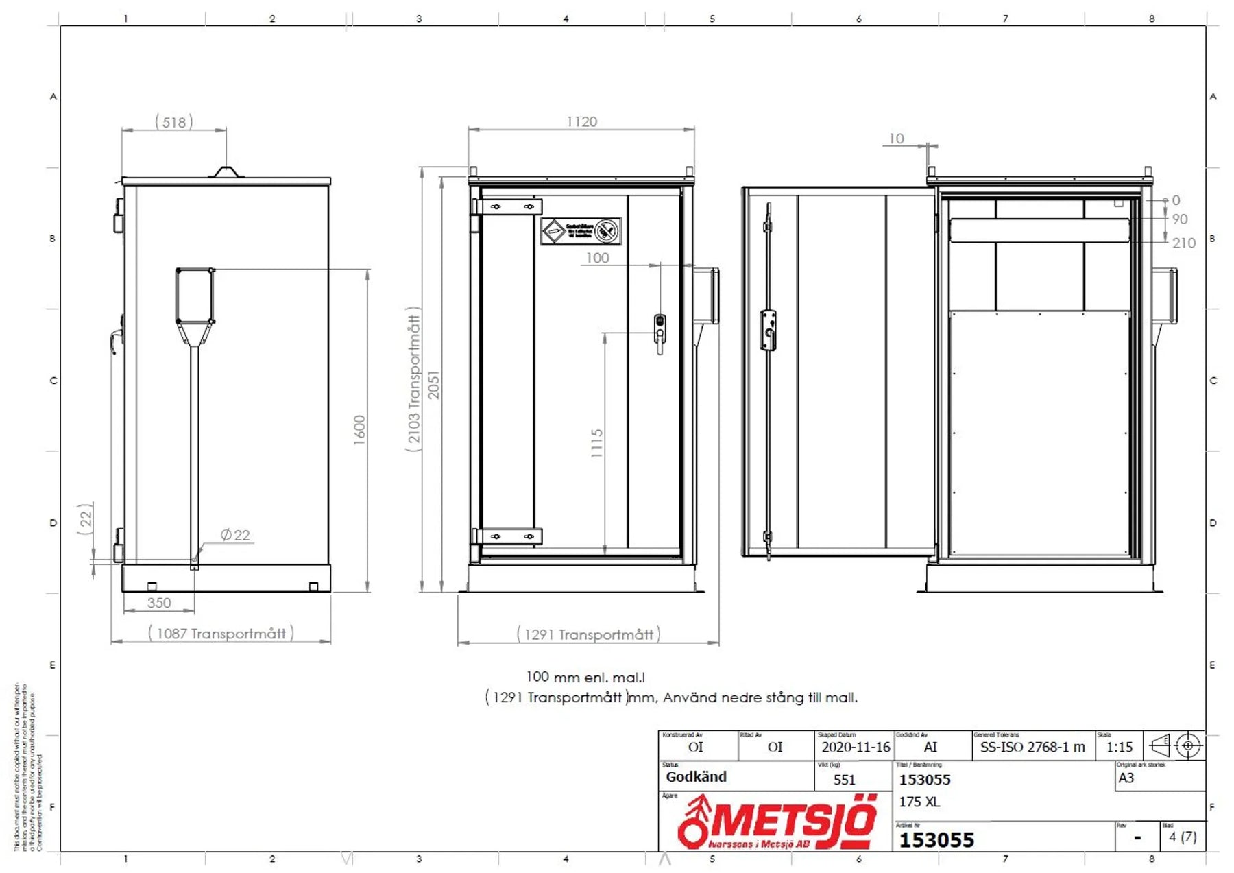 Invändigt mått B.H.D 900x1797x794 mm. Transportmått B.H.D 1230x2110x1090 mm. OBS! Vid tillval golvvärme kommer invändigt mått på djupet att bli 770 mm. Isolerat enligt kravet för EI30 avskiljning. Konstruktionen är testad enligt NT Fire 017. Konstruktion av 1,5 mm stålplåt svetsad. Vikt 520 kg. Godkänd försäkringsklass 2. Dörröppning 160º cylinderlås typ spanjolett. Värmeexpanderande packning runt dörren. Invändigt placerad armaturbalk för montering av gasutrustning. Ventilation naturligt självdrag, ≥1% av golvyta under och över dörrblad. Option kabel- eller rörgenomföring anges vid beställning. Ytbehandling enligt ISO 12944: Förbehandling med alkalisk avfettning och blästring Sa 2,5 Kittning sker där konstruktion ej medger helsvetsning C4-Med. Totalskikt ca 200µm. Epoxi grundfärg, Polyuretan täckfärg ger 15 år Inv. skåp C3 enl. Metsjö standard. Bildar en yta som väl bibehåller glans och kulör samt är lätt att rengöra.