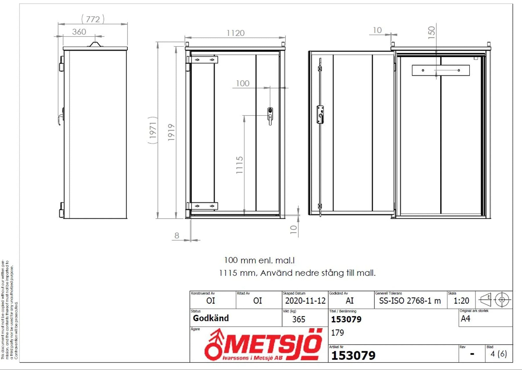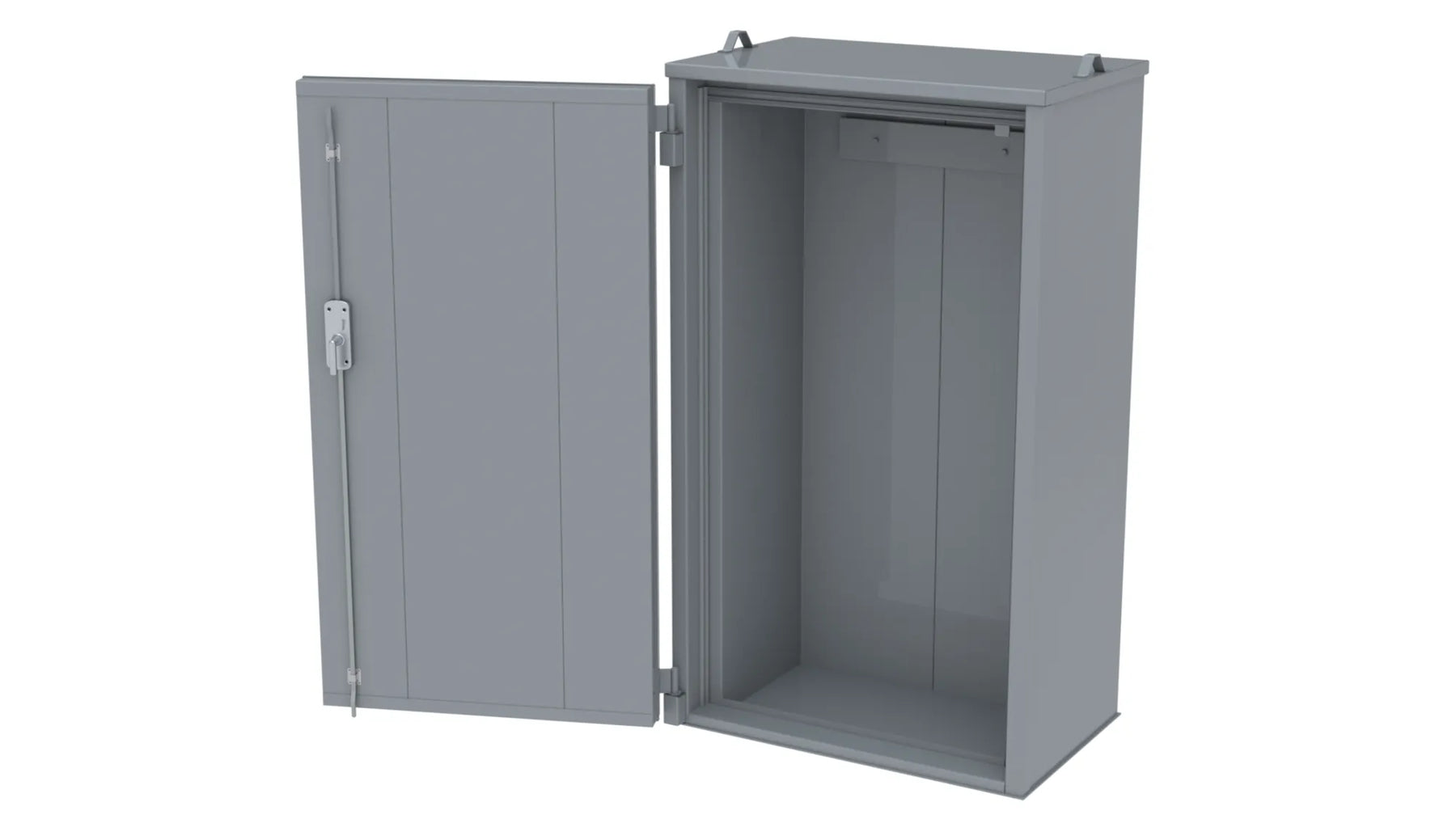 Invändigt mått B H D 900x1800x480 mm. Transportmått B H D 1120x1980x770 mm. Isolerad enligt kravet för EI30 avskiljning. Placeras på brandfast underlag, exempelvis betong-golv. Konstruktionen är testad enligt NT Fire 017. Konstruktion av 1,5 mm stålplåt helsvetsad. Vikt 365 kg. Godkänd försäkringsklass 2. Dörröppning öppnas 160º, cylinderlås, typ spanjolett. Värmeexpanderande packning runt dörren. Invändigt placerad armaturbalk för montering av gasutrustning. 2 st ventilationsstosar placerade diagonalt i bakstycket. SKOTTGENOMGÅNG ELLER HÅLTAGNING ÄR TILLVAL OCH MÅSTE ANGES VID BESTÄLLNING OBS! Ytbehandling enligt ISO 12944: Förbehandling med alkalisk avfettning och blästring Sa 2,5 Kittning sker där konstruktion ej medger helsvetsning C3-Med. Totalskikt ca 120µm. Epoxi grundfärg, Polyuretan täckfärg ger 15 år Inv. skåp C3 enl. Metsjö standard. Bildar en yta som väl bibehåller glans och kulör samt är lätt att rengöra.