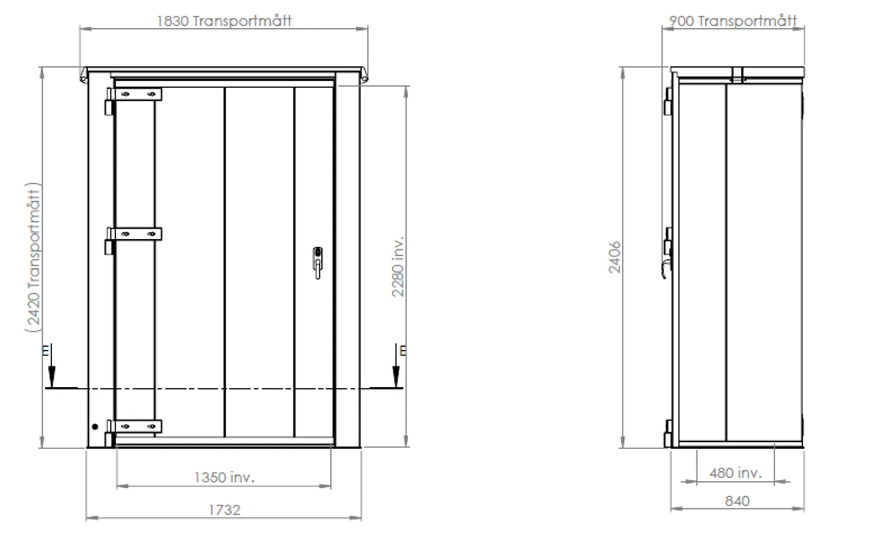 Invändigt mått B.H.D 1350x2235x480 mm. Transportmått B.H.D 1830x2420x900 mm. Isolerad enligt kravet för EI60 avskiljning. Konstruktionen är testad enligt NT Fire 017. Konstruktion av 1,5 mm stålplåt svetsad. Vikt 670 kg. Godkänd försäkringsklass 2. Dörröppning 160°, cylinderlås typ spanjolett. Värmeexpanderande packning i dörr. Invändigt placerad armaturbalk för montering av gasutrustning. Ventilation: 2st diagonalt placerade kanaler dia.100mm, i bakstycke. Placeras på brandfast underlag, exempelvis betong-golv. Extra hyllplan finns att tillgå. Option kabel- eller rörgenomföring anges vid beställning. Ytbehandling enligt ISO 12944: Förbehandling med alkalisk avfettning och blästring Sa 2,5 Kittning sker där konstruktion ej medger helsvetsning C3-Med. Totalskikt ca 120µm. Inv. skåp C3 enl. Metsjö standard. Bildar en yta som väl bibehåller glans och kulör samt är lätt att rengöra.