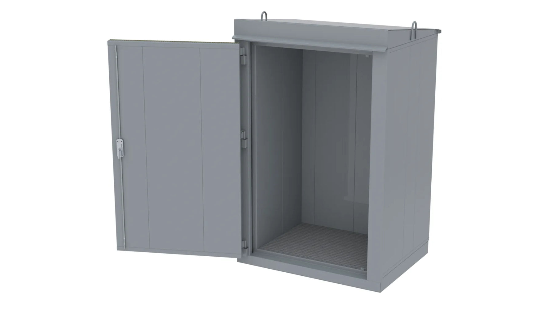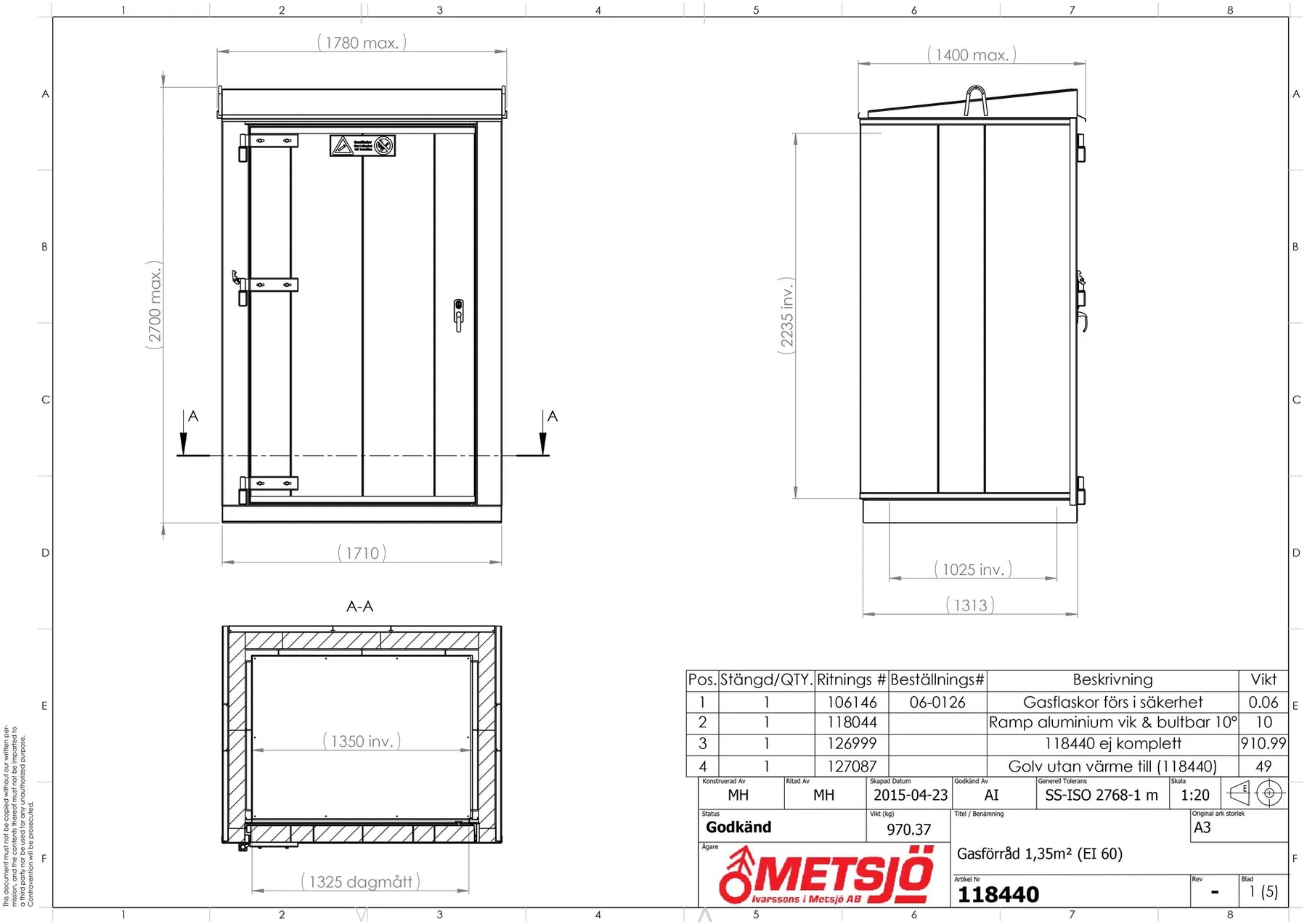 Invändigt mått B.H.D 1350x2235x1025 mm. Transportmått B.H.D 1800x2700x1400 mm. OBS! Vid tillval golvvärme kommer invändigt mått på djupet att bli 1000 mm. Isolerad enligt kravet för EI60 avskiljning. Konstruktionen är testad enligt NT Fire 017. Konstruktion av 1,5 mm stålplåt svetsad. Golv av halkfri tårplåt. Vikt 1000 kg. Godkänd försäkringsklass 2. Dörröppning 160°, cylinderlås typ spanjolett. Värmeexpanderande packning i dörr. Vänsterhängd dörr är standard! Går att få högerhängd. Väljs vid beställning. Takrila för vattenavledning åt höger och vänster sida. Ventilation naturligt självdrag, ≥1% av golvarea., under och över dörrblad. Extra hyllplan finns att tillgå. Option kabel- eller rörgenomföring anges vid beställning. Ytbehandling enligt ISO 12944: Förbehandling med alkalisk avfettning och blästring Sa 2,5 Kittning sker där konstruktion ej medger helsvetsning C4-Med. Totalskikt ca 200µm. Epoxi grundfärg, Polyuretan täckfärg ger 15 år Inv. skåp C3 enl. Metsjö standard. Bildar en yta som väl bibehåller glans och kulör samt är lätt att rengöra.