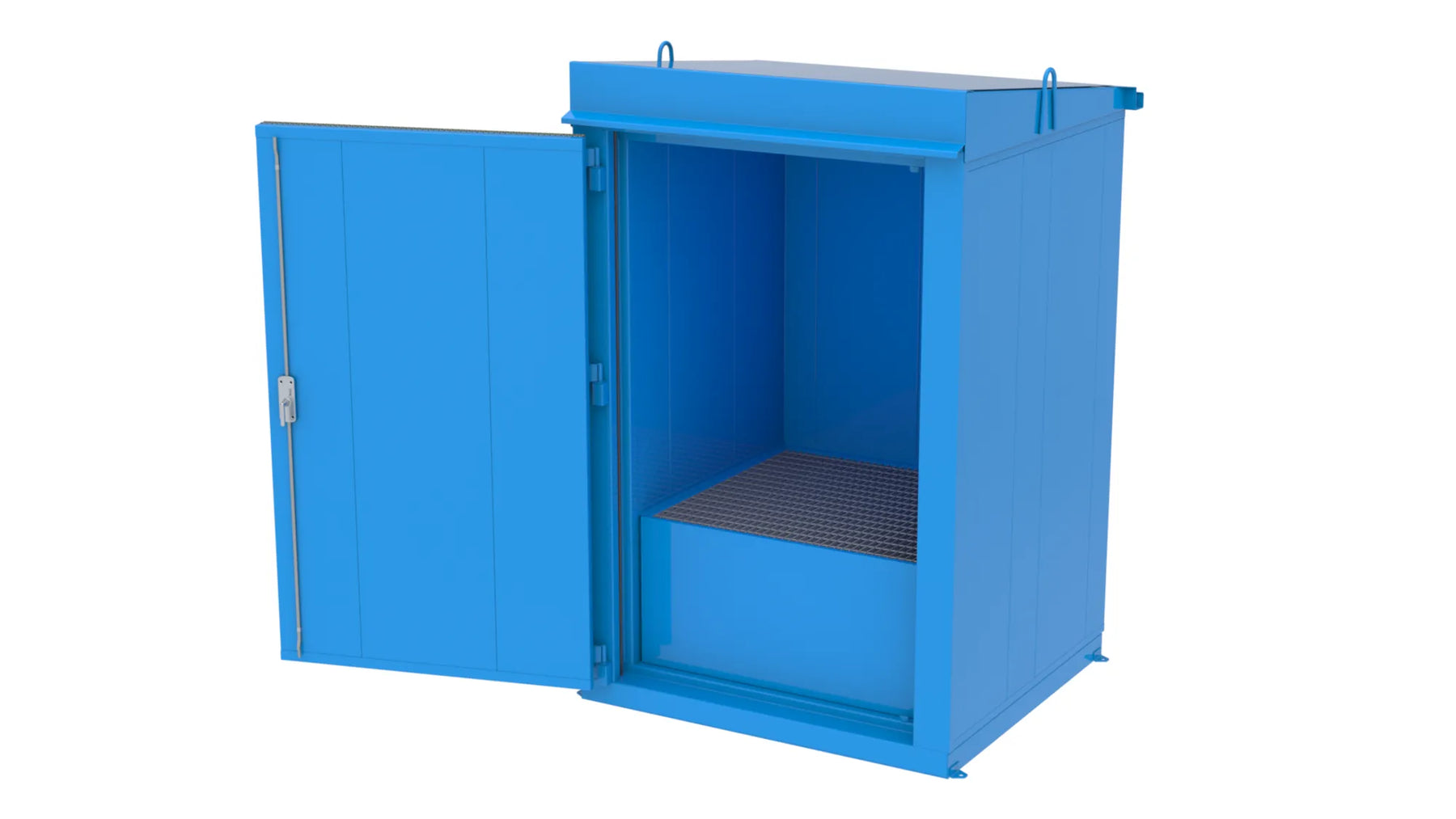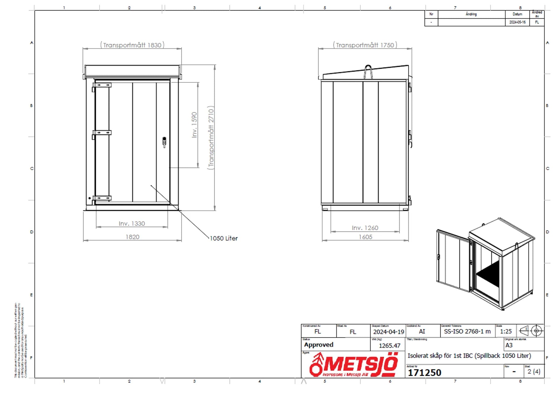 Invändigt mått B.H.D 1350x1590x1260 mm. Transportmått B.H.D 1830x2710x1750 mm. Skåpets vikt: 1300 kg. Spillback 1050 liter För 1st IBC, 1st europapall eller 4st 200L fat direkt på golvplan. Isolerad enligt kravet för EI60 avskiljning. Konstruktionen är testad enligt NT Fire 017. Konstruktion av 1,5 mm stålplåt helsvetsad. Golvplan av gallerdurk, höjd 800mm från marknivå. Godkänd försäkringsklass 2. Dörröppning 160°, cylinderlås typ spanjolett. Takrila för vattenavledning åt höger och vänster sida. Ventilation naturligt självdrag, ≥1% av golvarea., under och över dörrblad. Värmeexpanderande packning i dörr. Extra hyllplan finns att tillgå. Option kabel- eller rörgenomföring anges vid beställning. Ytbehandling enligt ISO 12944: Förbehandling med alkalisk avfettning och blästring Sa 2,5 Kittning sker där konstruktion ej medger helsvetsning C4-Med. Totalskikt ca 200µm. Epoxi grundfärg, Polyuretan täckfärg ger 15 år Inv. skåp C3 enl. Metsjö standard. Bildar en yta som väl bibehåller glans och kulör samt är lätt att rengöra.
