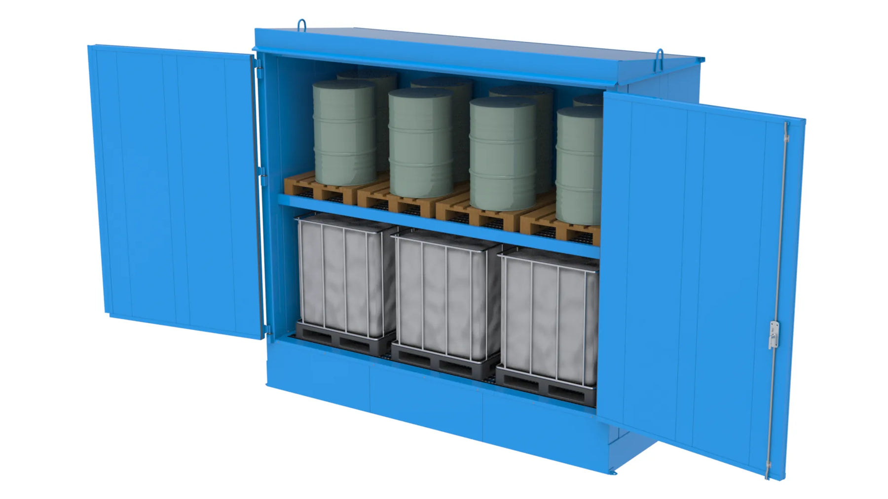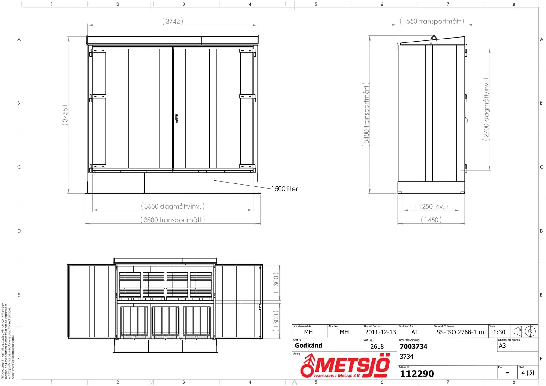 Invändigt mått B.H.D 3530x2700x1250 mm. Transportmått B.H.D 3880x3480x1550 mm. Isolerad enl kravet för EI60 avskiljning. Konstruktionen är testad enligt NT Fire 017. Fat 200 liters 8 europapallar (16 fat) eller direkt på galler 20 st. IBC/cipax 6 st. Vikt 2600 kg. (Största kärlets volym + 10 % av resterande). 2 st golvplan av gallerdurk, bärlast hyllplan 4000 kg. Första plan 500 mm andra plan 1900 mm. Frihöjd mellan plan 1300 mm. Konstruktion av 1,5 mm stålplåt intermittent svetsad. Godkänd försäkringsklass 2. Slagport öppnas 170°. Spanjolett med cylinderlås. Portblad med avhakningssäkring. Ventilationen är självdrag och 1% av golvytan under taksprång och under dörrblad. Ytbehandling enligt ISO 12944: Förbehandling med alkalisk avfettning och blästring Sa 2,5 Kittning sker där konstruktion ej medger helsvetsning C4-Med. Totalskikt ca 200µm. Epoxi grundfärg, Polyuretan täckfärg ger 15 år Inv. skåp C3 enl. Metsjö standard. Bildar en yta som väl bibehåller glans och kulör samt är lätt att rengöra.