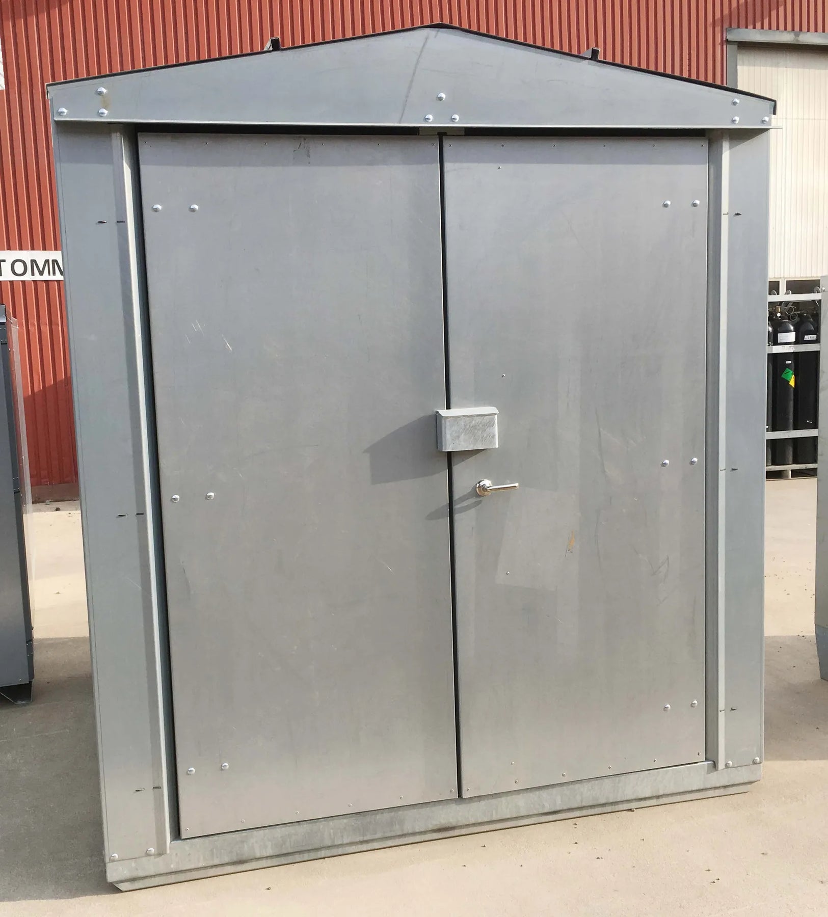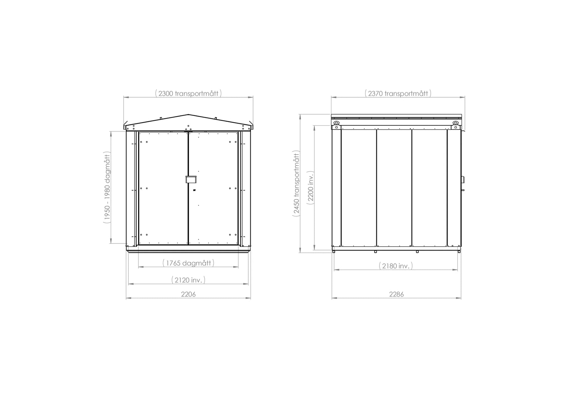Miljöskåp Typ 310 för utomhusbruk 2 dörrar med låskåpa ZnAIMg (136970). Invändigt mått B.H.D 2120x2200x2180 mm. Transportmått B.H.D 2300x2450x2370 mm. Konstruktionen är av 1,5 mm Zinkbelagd stålkärna ZnAlMg detta är en metallbeläggning som ger skydd i de tuffaste miljöerna. ZnAlMg har avsevärt bättre korrosionsmotstånd än varmförzinkat stål. En av ZnAlMg stora fördelar är dess förmåga att självläka klippta och perforerade kanter. Plåten har en hårdare yta och är reptåligare än traditionellt varmgalvat material. Skåpet bultas och nitas ihop. Låsning sker med spanjolett och hänglås (bygelhöjd 25mm). Godkänd försäkringsklass 2. Dörröppning 100º. Ventilation naturligt självdrag, ≥1% av golvarea., under och över dörrblad. Invändiga ej synliga gångjärn med avhakningssäkring. Tråghöjd 100 mm och rymd 340 liter. Golv av 4mm tårplåt och tårarna i plåten minskar halkrisken. Takmonterat fäste för pulversläckare är standard. Skåpet väger 710 kg. HYLLOR FINNS SOM TILLVAL