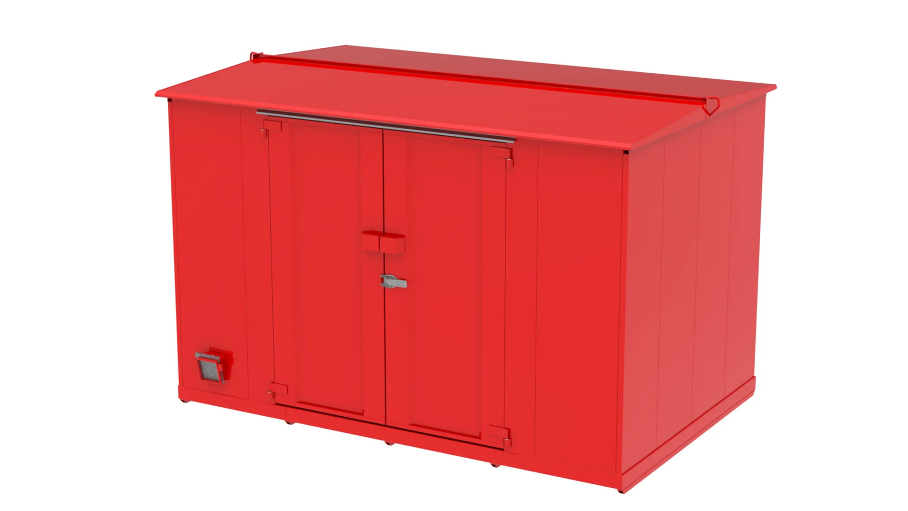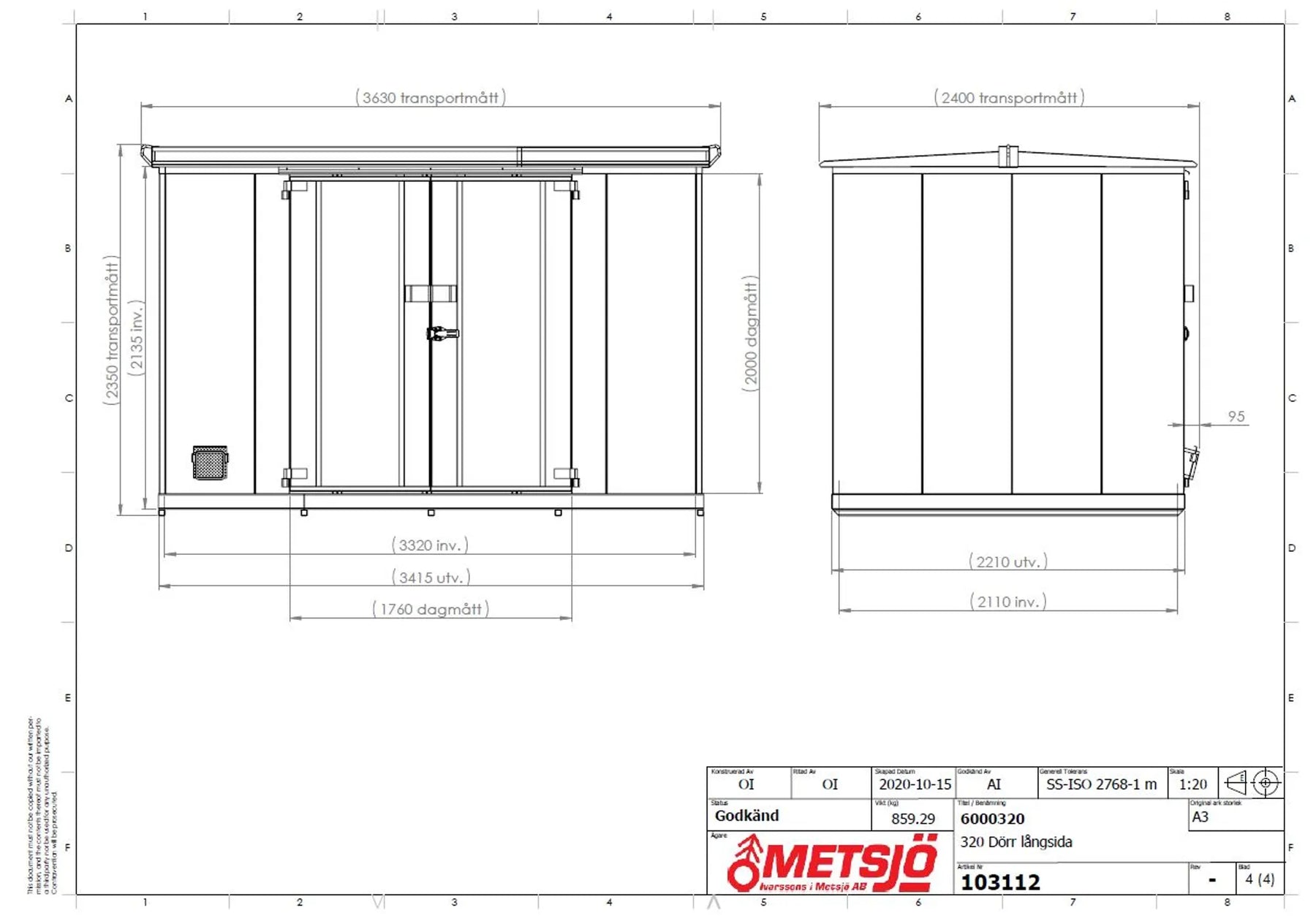 Invändigt mått B.H.D 3320x2135x2110 mm. Transportmått B.H.D 3630x2350x2400 mm. För utomhusbruk. Konstruktion av 1,5 mm stålplåt Intermittent svetsad med slät utsida. Godkänd försäkringsklass 2. Vikt 860 kg. Låses med 1 st snabblås samt hänglås (bygel 14-65). Dörröppning 180°. Gångjärn med avhakningssäkring. Ventilationen är självdrag och 1% av golvytan under taksprång och under dörrblad. Golv av 4mm tårplåt och tårarna i plåten minskar halkrisken. Tråghöjd 95 mm rymd 630 liter. Brandlucka (låsbar). OBS! HYLLOR OCH RAMP INGÅR EJ SOM STANDARD! Ytbehandling enligt ISO 12944: Förbehandling med alkalisk avfettning och blästring Sa 2,5 Kittning sker där konstruktion ej medger helsvetsning C4-Med. Totalskikt ca 200µm. Epoxi grundfärg, Polyuretan täckfärg ger 15 år Inv. skåp C3 enl. Metsjö standard. Bildar en yta som väl bibehåller glans och kulör samt är lätt att rengöra.