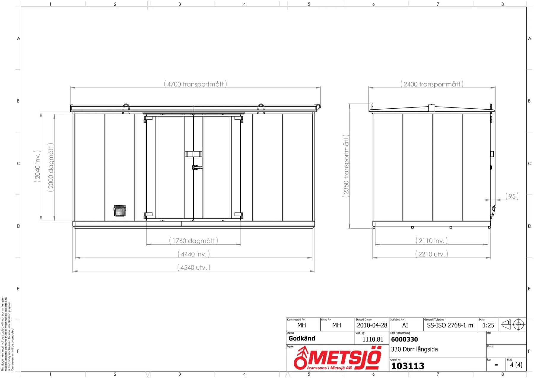 Invändigt mått B.H.D 4440x2135x2110 mm. Transportmått B.H.D 4700x2350x2400 mm. Konstruktion av 1,5 mm stålplåt Intermittent svetsad. Godkänd försäkringsklass 2. Vikt 1100 kg. Låses med 1 st snabblås samt hänglås (bygel 14-65). Dörröppning 180°. Gångjärn med avhakningssäkring. Ventilation är självdrag 1% av golvyta. under taksprång, över och under dörrblad. Golv av 4mm tårplåt och tårarna i plåten minskar halkrisken. Tråghöjd 95 mm rymd 850 liter. Brandlucka (låsbar). OBS! HYLLOR OCH RAMP INGÅR EJ SOM STANDARD! Ytbehandling enligt ISO 12944: Förbehandling med alkalisk avfettning och blästring Sa 2,5 Kittning sker där konstruktion ej medger helsvetsning C4-Med. Totalskikt ca 200µm. Epoxi grundfärg, Polyuretan täckfärg ger 15 år Inv. skåp C3 enl. Metsjö standard. Bildar en yta som väl bibehåller glans och kulör samt är lätt att rengöra.