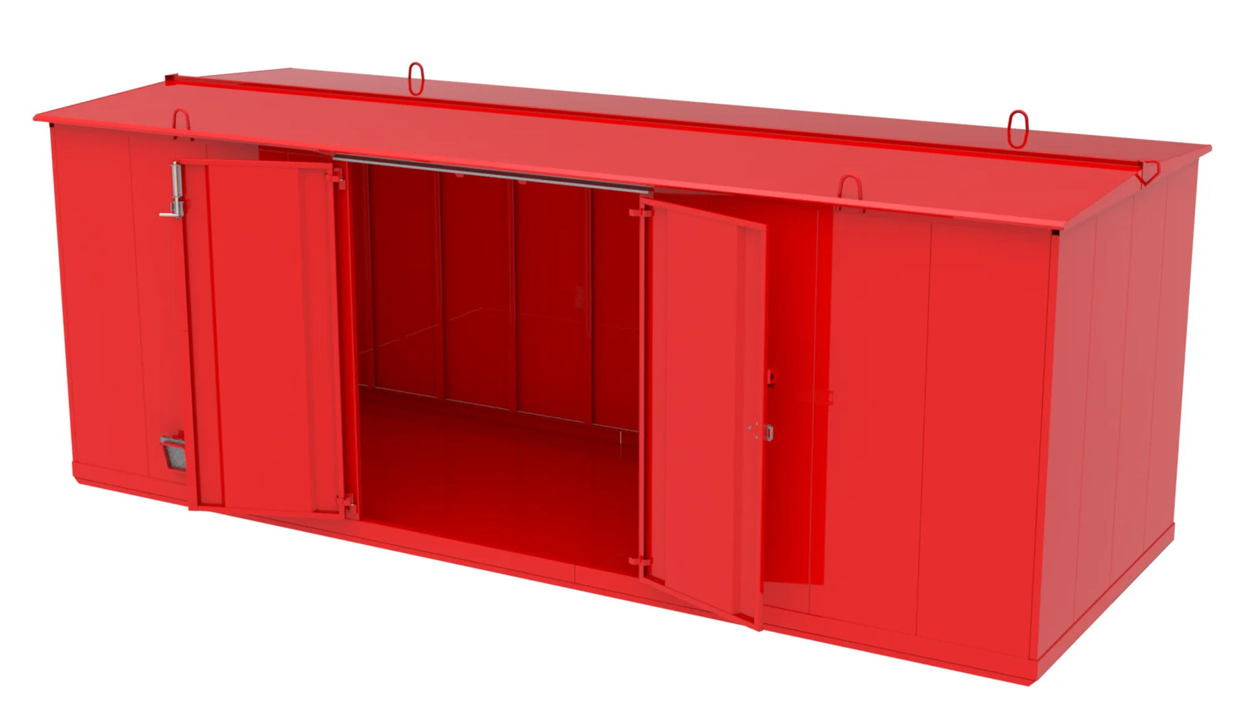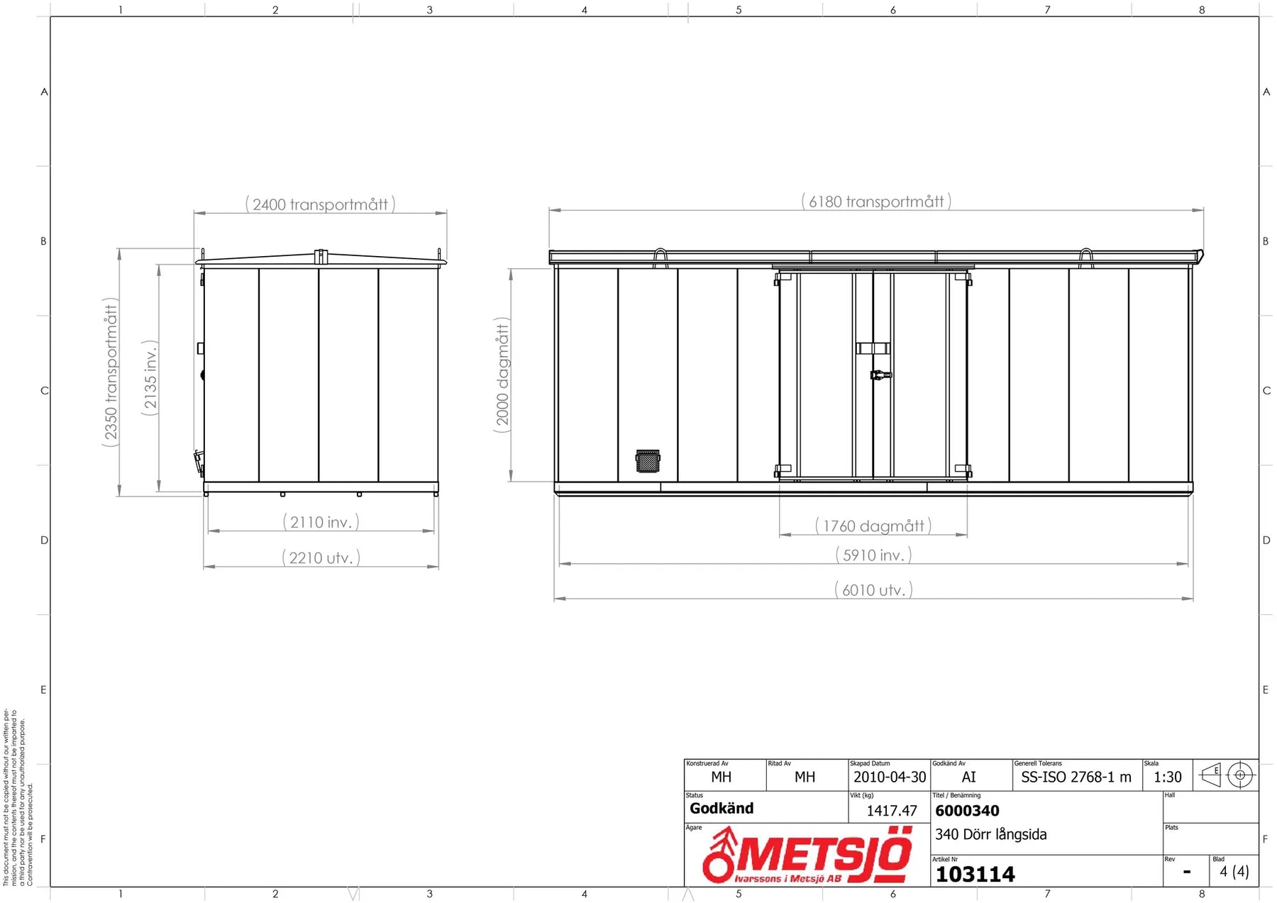 Invändigt mått B.H.D 5910x2135x2110 mm. Transportmått B.H.D 6180x2350x2400 mm. Konstruktion av 1,5 mm stålplåt Intermittent svetsad. Godkänd försäkringsklass 2. Vikt 1400 kg. Låses med 1 st snabblås samt hänglås (bygel 14-65). Dörröppning 180°. Gångjärn med avhakningssäkring. Ventilation är självdrag 1% av golvyta, under taksprång över och under dörrblad. Golv av 4mm tårplåt och tårarna i plåten minskar halkrisken. Tråghöjd 95 mm rymd 1100 liter. Brandlucka (låsbar). OBS! HYLLOR OCH RAMP INGÅR EJ SOM STANDARD! Ytbehandling enligt ISO 12944: Förbehandling med alkalisk avfettning och blästring Sa 2,5 Kittning sker där konstruktion ej medger helsvetsning C4-Med. Totalskikt ca 200µm. Epoxi grundfärg, Polyuretan täckfärg ger 15 år Inv. skåp C3 enl. Metsjö standard. Bildar en yta som väl bibehåller glans och kulör samt är lätt att rengöra.