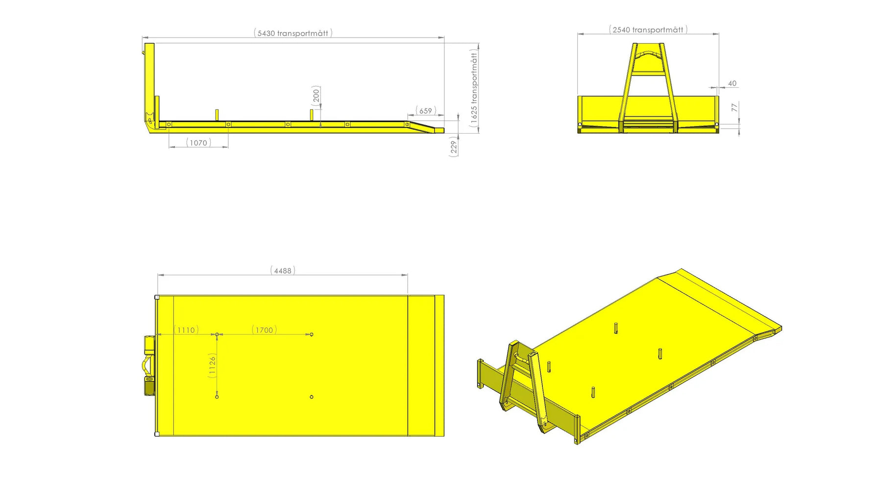 Krokhöjd 1450mm, Rullram standard SIS 3021 Rullram utan rullar bak för lättare uppkörning. Markhöjd 100mm Slitplåt Brinell 450: Tjocklek Botten 6 mm. Plandel 4550mm, Vikramp 650mm, Total 5200mm inkl vikramp Bindpunkter UTV flaklina Stackhylsor infällda i flak 2 rader med 2st. Flakplanet har en strukturerad yta för att minimera halkrisken Lackas Metsjö Gul, karosseri kittas enligt Metsjö standard Vikt 1570 kg