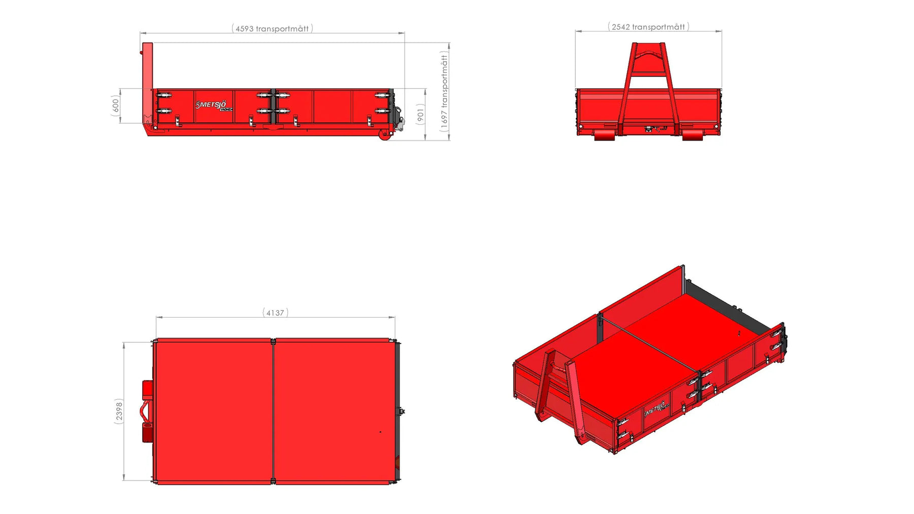 Krokhöjd 1450mm, Rullram standard SIS 3021 Slitplåt Brinell 450: Tjocklek Botten 6 mm, Syfte Grus Slitplåt Brinell 450: Tjocklek Framstam 3 mm Plåt Brinell 355: Tjocklek Sidor 3 mm Bakläm: Hydraulisk schaktläm höjd 300 mm, Hydraullås Sidläm fälls ned. Höjd 600 mm. Sektionslängd 2000 mm Gångjärnsbeslag 2 st, låsbeslag 4 st per sektion Framstam Höjd 600 mm Stabiliseringsstag mellan lämmar Bindningspunkter utsida 6st/sida Hydraulslangar dragna fram till tornet (kräver DV uttag på flakväxlarens torn) Fäste för tillval spridarläm/band Fäste för tillval spannmålskitt Lackas Metsjö Röd, karosseri kittas enligt Metsjö standard Vikt 1670 kg