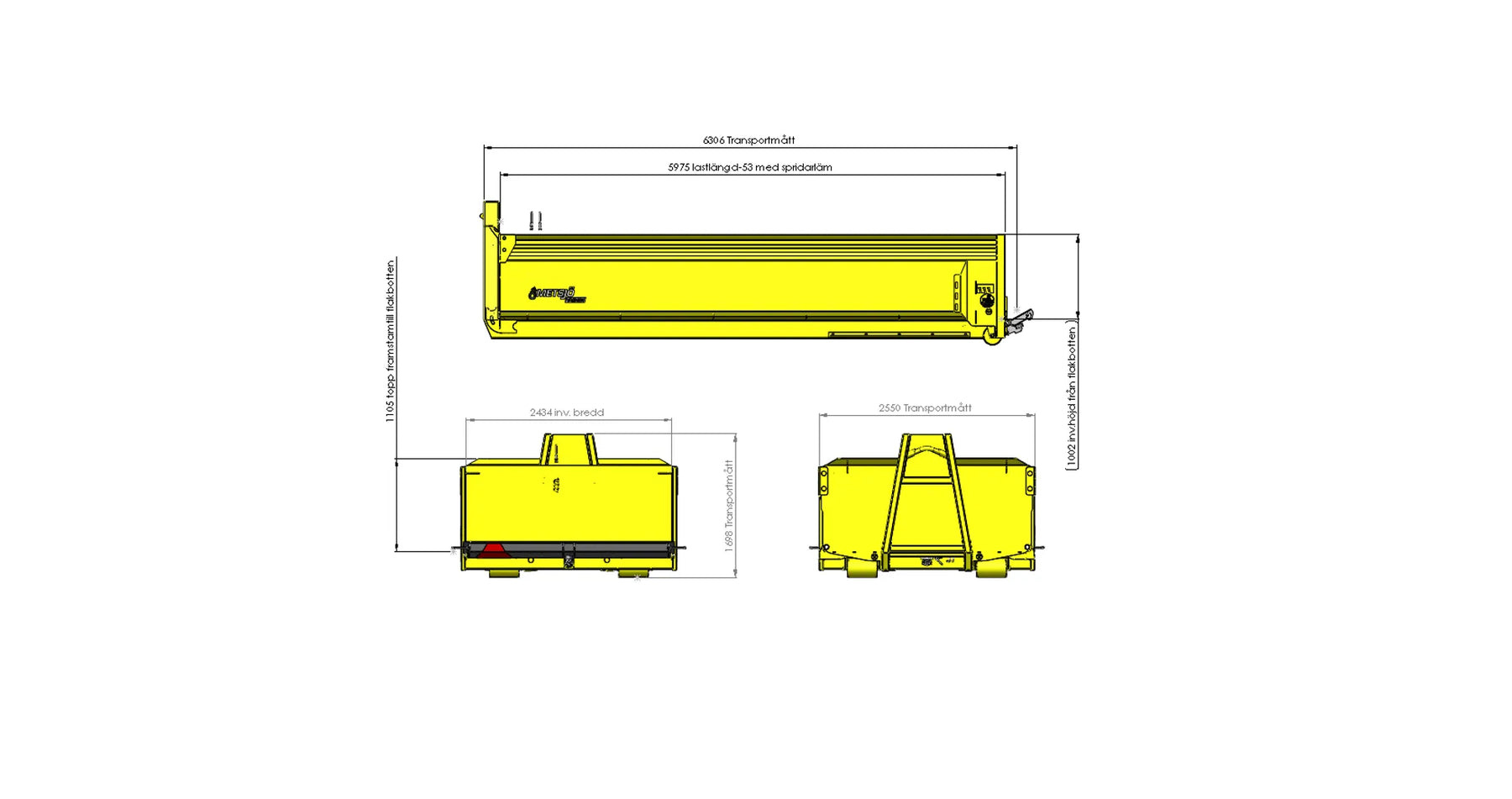 Krokhöjd 1450mm, Rullram standard SIS 3021 6.1 Övergång Sida/flak 3x30" Slitplåt Brinell 450: Tjocklek Botten 4 mm, Sida 4 mm, Syfte Grus Bakläm: Hydraulisk schaktläm höjd 300 mm, Hydraullås Bindningspunkter utsida / Surrningsdon invändigt Hydraulslangar dragna fram till tornet (kräver DV uttag på flakväxlarens torn) Fäste för tillval spridarläm/band Fäste för tillval spannmålskitt Lackas Metsjö Gul, karosseri kittas enligt Metsjö standard Vikt 2132 kg