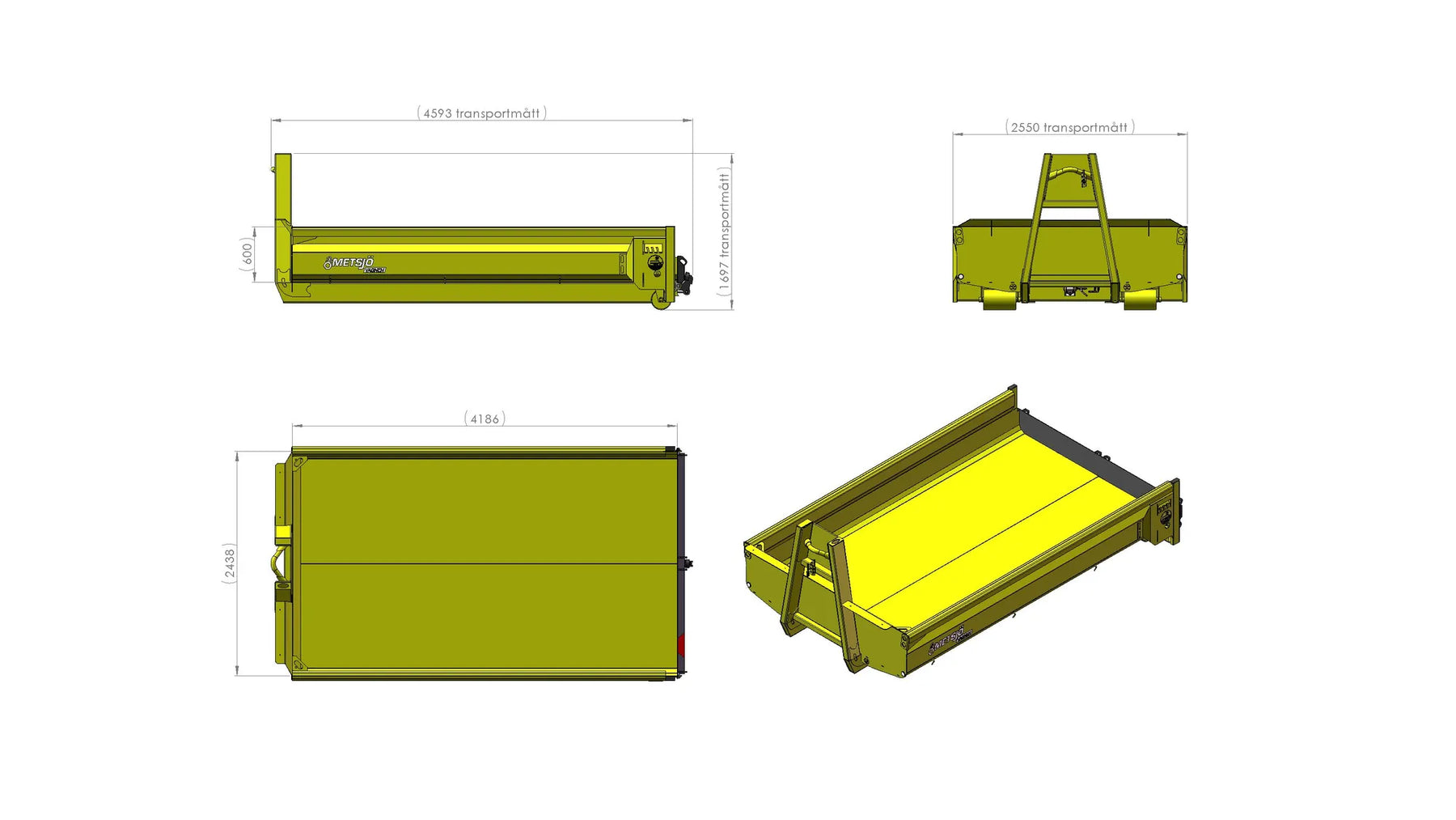 Krokhöjd 1450mm, Rullram standard SIS 3021 6.1 Övergång Sida/flak 3x30" Slitplåt Brinell 450: Tjocklek Botten 6 mm, Sida 6 mm, Syfte Grus Bakläm: Hydraulisk schaktläm höjd 300 mm, Hydraullås Bindningspunkter utsida / Surrningsdon invändigt Hydraulslangar dragna fram till tornet (kräver DV uttag på flakväxlarens torn) Fäste för tillval spridarläm/band Fäste för tillval spannmålskitt Lackas Metsjö Gul, karosseri kittas enligt Metsjö standard Vikt 1640 kg