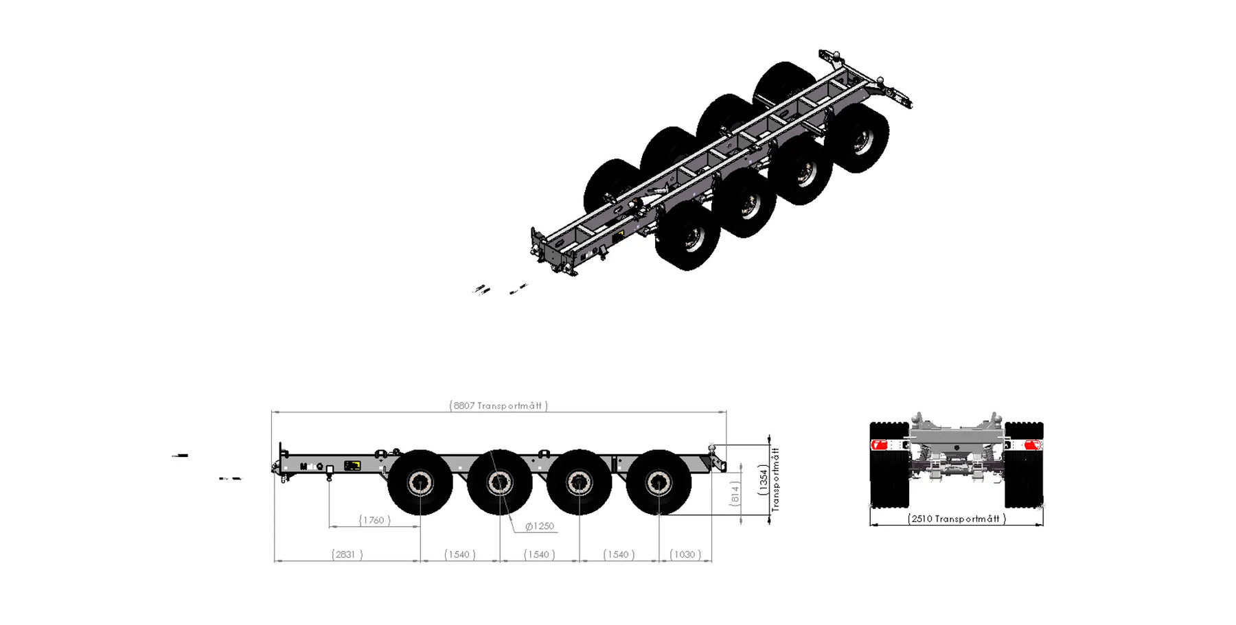 Artikelnummer chassi: 147029 Multikopplingsdraget köps separat Axlar: Hel axelkropp 120x120, Avstånd över navflänsar 2 000 mm Belastning 10,5 ton vid 62 km. Laserriktade. Ytbehandlade enligt KTL- metoden, svart Avstånd mellan boggiaxlar cc 1540 mm. Axelupphängning "Road" Medspårande axel med hydraulisk låsning vid backning (axel 1 och 4) Anslutning 280x335x10 kupolmutter Kommunicerande kärl: Hydrauliskt reglerbart chassi 350 mm vid chassit Bromsstorlek: 410x120. Hydrauliska bromsar på alla hjul - enligt VVFS 2003: 20, 5 Kap. 12 § Automatbromsarmar AGS. Max 110 bar hydraultryck. Skyddsplåt förhindrar smuts i trumma Baktipp. Tippvinkel: 52º. Oljevolym 63L/210 bar. Elsystem 12 Volt Belysning enligt TSV Diod 12/24 Volt 7 pol Automatlämsfäste Fäste för valbart drag Färg Metsjö grå Förberett för valfri påbyggnad MetaQ95 Chassivikt 5 450 kg Teknisk belastning: 45 000 kg, Nyttolast 39 550 kg Ytbehandling: Förbehandling med alkalisk avfettning och blästring Sa 2,5 Karosseri kittas. Lackerat enl. ISO 12944 A3.09. Färgsystem: Epoxiprimer 2 x 70 µm. Täckfärg: Polyuretan 1 x 60 µm totalskikt ca. 200µm. Korrosivitetklass C4 L