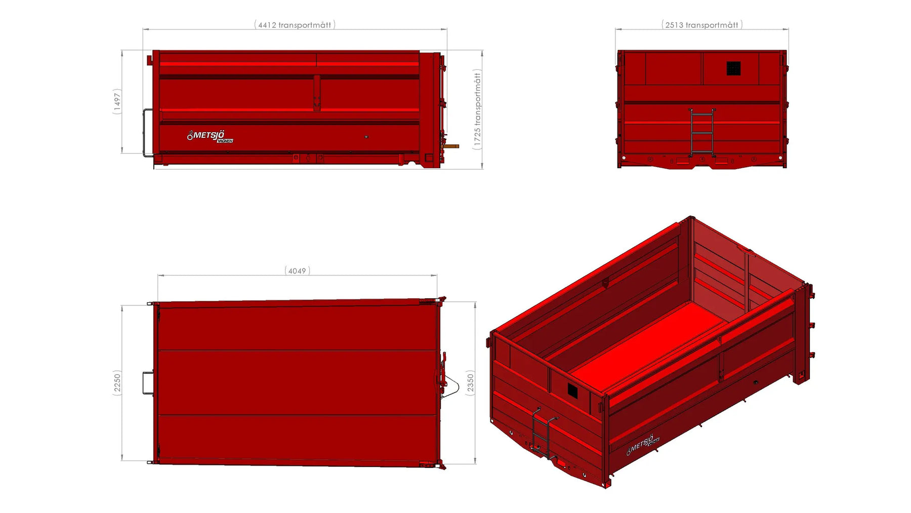 Slitplåt Brinell 450: Tjocklek Botten 3,2 mm Plåt Brinell 355: Tjocklek sidor 2 mm Bakdörrar: öppnas 270". Justerbar dörr öppningsbegränsning Siktläm i framstam 500x2000 perforering inkl. täckplåt Koniskt flak 100mm Bindningspunkter utsida Fästen för redskapsbytarben Lackas Metsjö Röd, karosseri kittas enligt Metsjö standard För Metamid / MetaNo chassi Vikt 1090kg