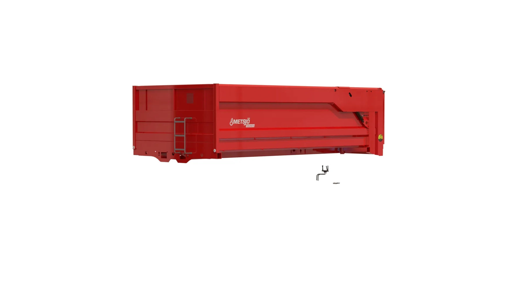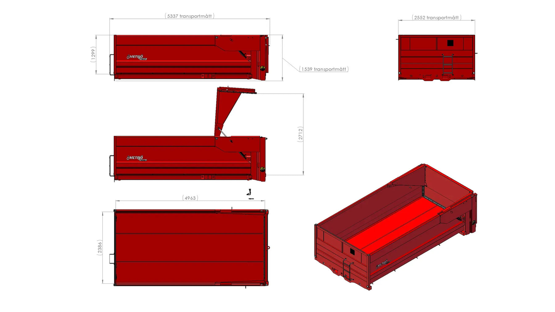 Slitplåt Brinell 450: Tjocklek Botten 3,2 mm, Sida 2 mm Bakläm: Hydraulisk högöppnande 130" H1300. Dropptät Siktläm i framstam 500x2000 perforering inkl. täckplåt Bindningspunkter utsida Fästen för redskapsbytarben Lackas Metsjö Röd, karosseri kittas enligt Metsjö standard För MetaX / Olympia 50 chassi Vikt 1290kg