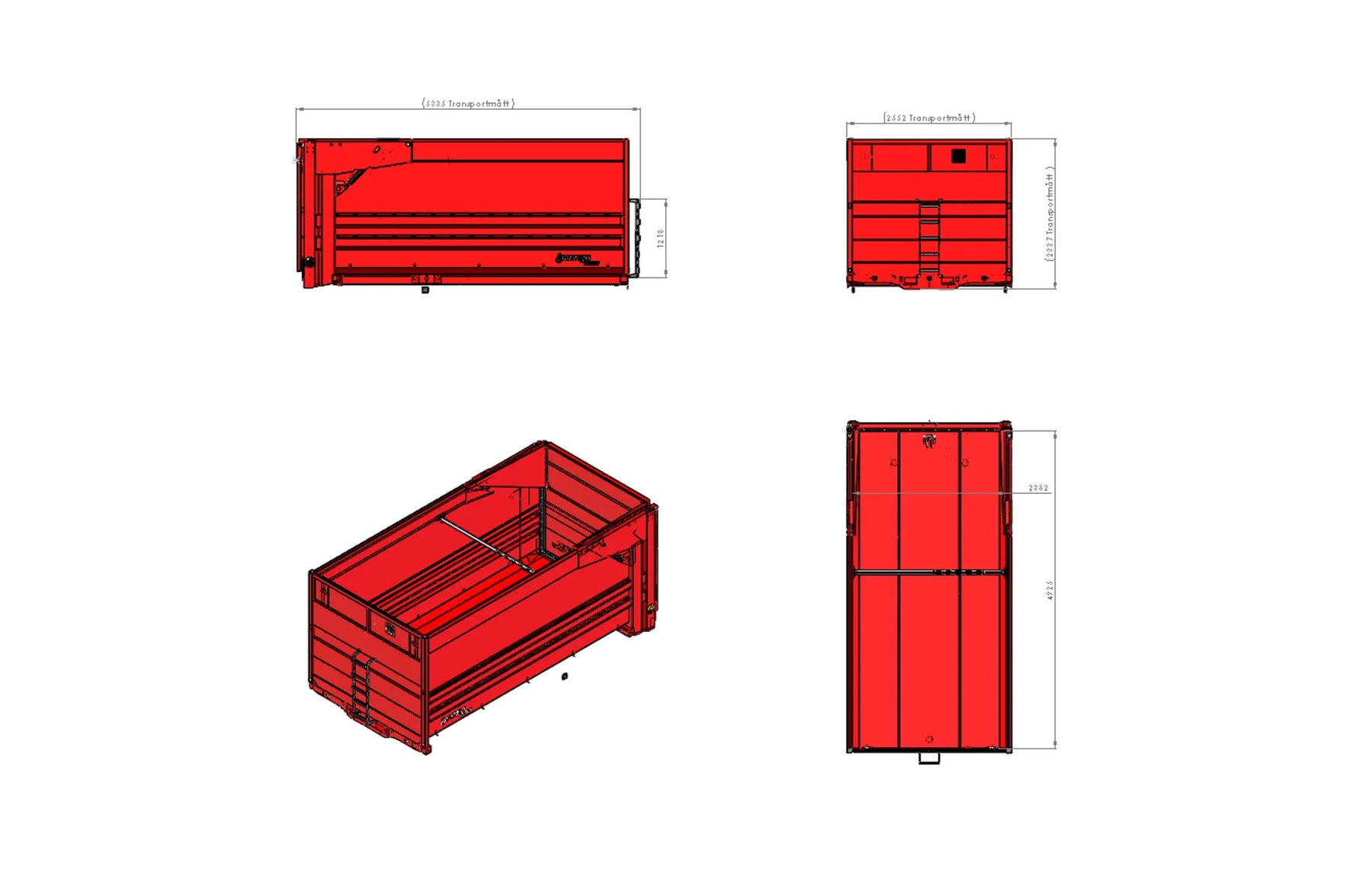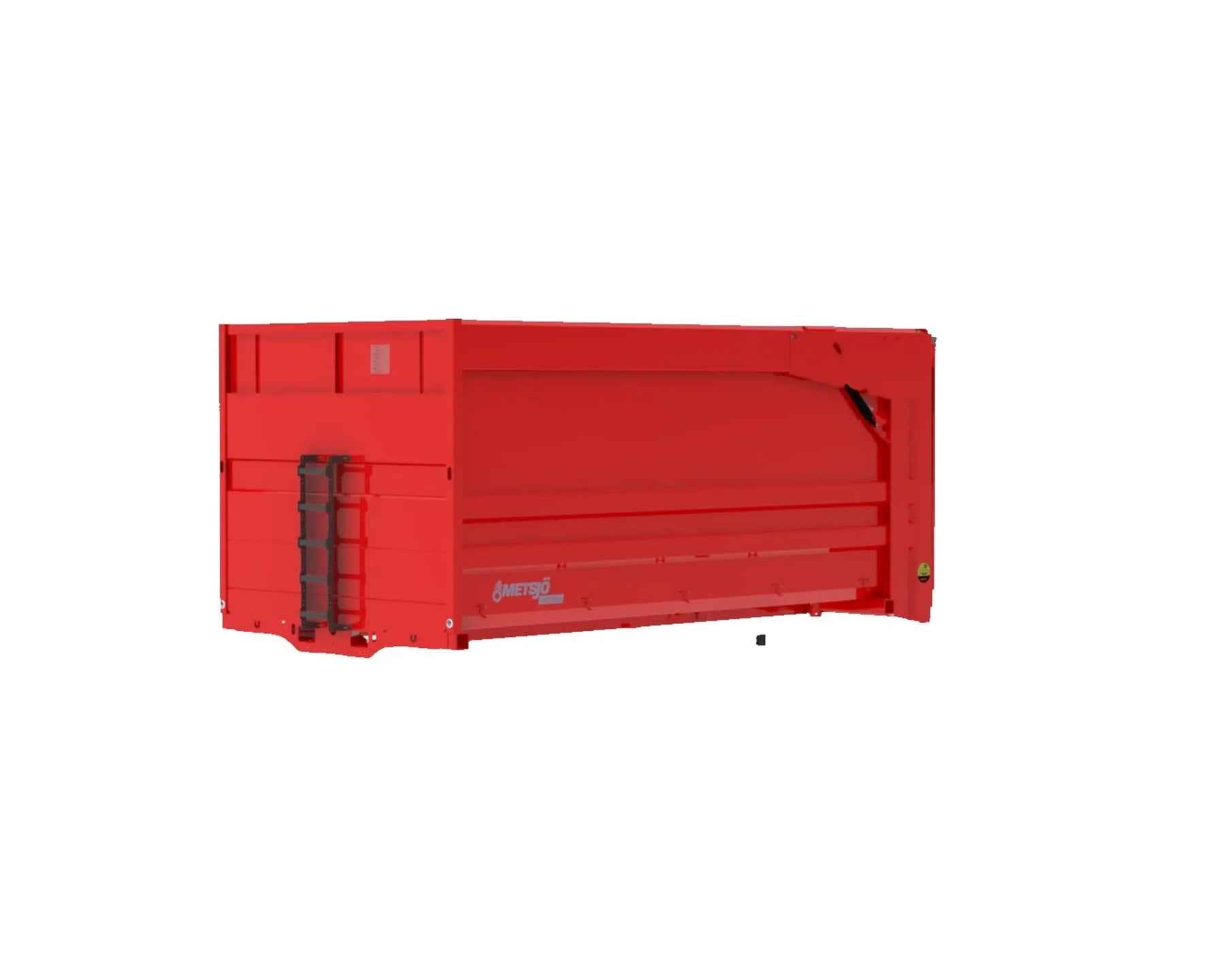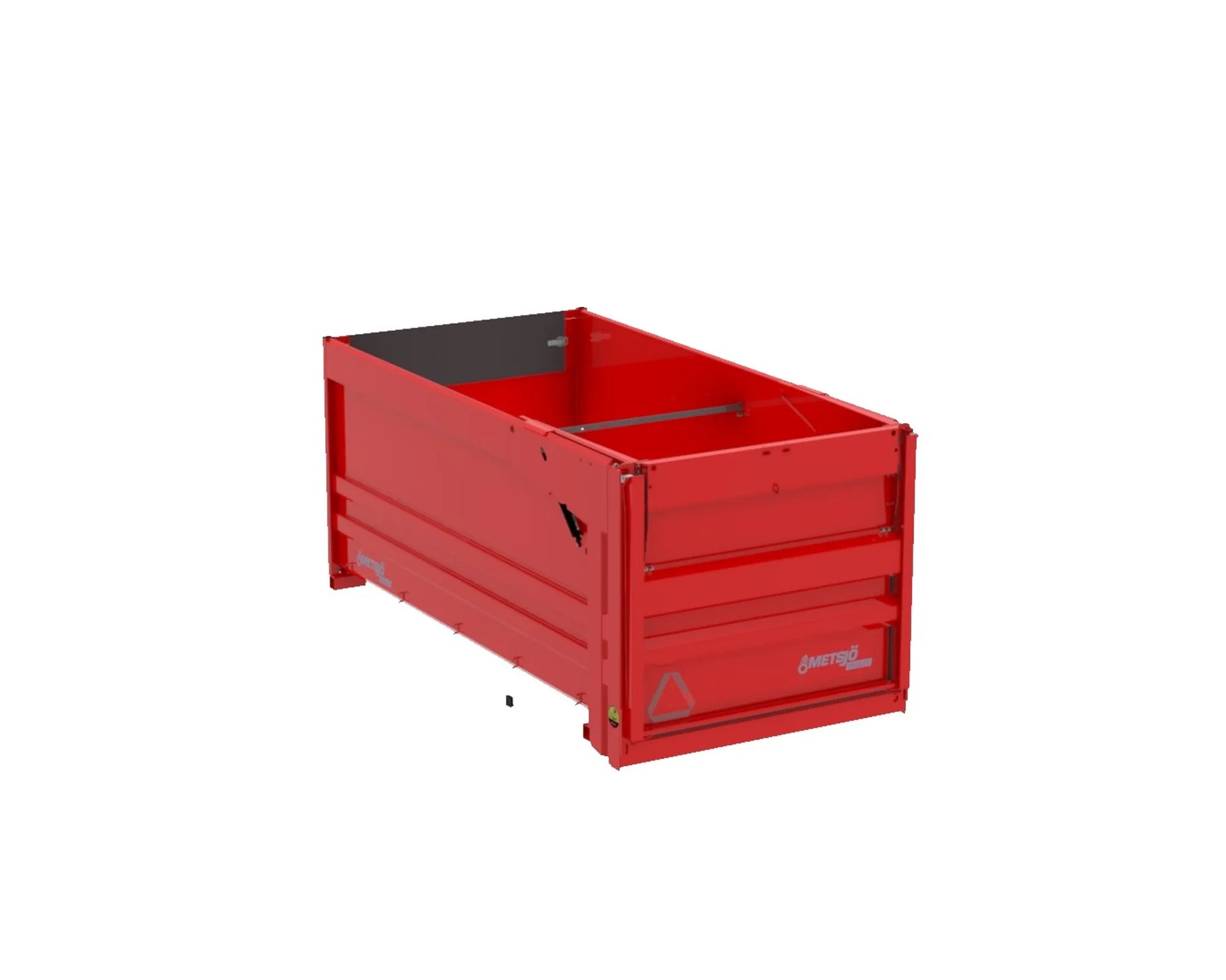 Slitplåt Brinell 450: Tjocklek Botten 3,2 mm, Sida 2 mm Bakläm: Hydraulisk högöppnande 130" H1750. Dropptät Siktläm i framstam 500x2000 perforering inkl. täckplåt Bindningspunkter utsida Fästen för redskapsbytarben Lackas Metsjö Röd, karosseri kittas enligt Metsjö standard För MetaX / Olympia 50 chassi Vikt 1945kg