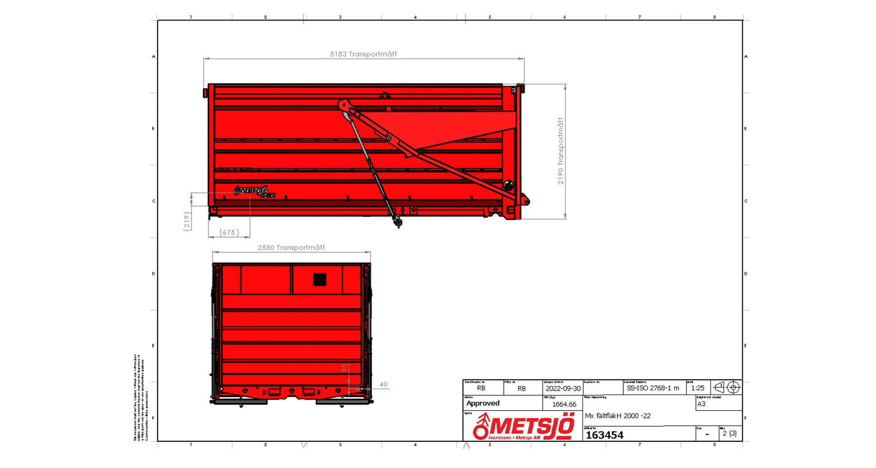 Slitplåt Brinell 450: Tjocklek Botten 3,2 mm Plåt Brinell 450: Tjocklek Sidor 2 mm Bakläm: Automatläm - öppnas när man tippar flaket Möjlighet att välja, med eller utan fördröjning Siktläm i framstam 500x2000 perforering Koniskt flak 100mm Bindningspunkter utsida Fästen för redskapsbytarben Lackas Metsjö Röd, karosseri kittas enligt Metsjö standard För MetaX / Olympia 50 chassi Vikt 1670kg
