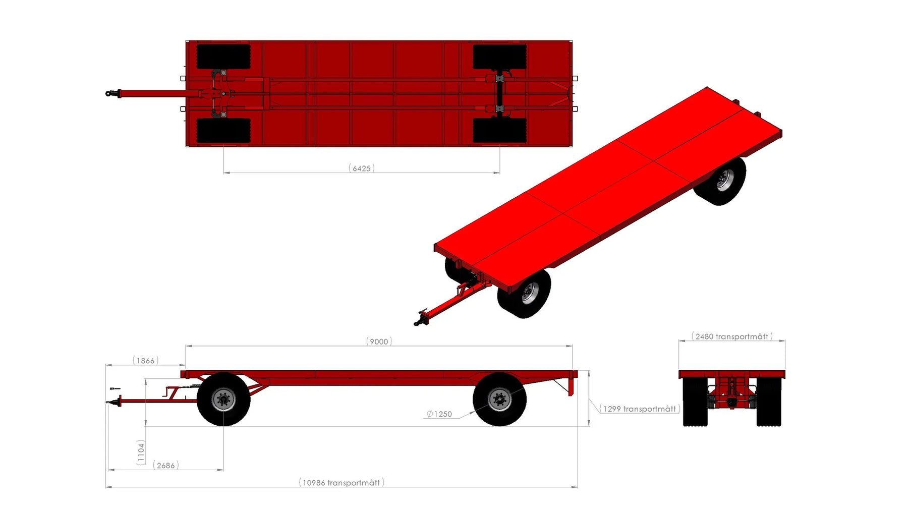 Artikelnummer komplett: 133480 Vagn med bilstyrning och fjäderupptagande hjul/ramverk Syfte: Låg lasthöjd och stabilitet även vid svängd vagn, låg egenvikt Systemet för fält/väg transport förrutsätter radiala hjul Framvagn typ bilstyrning, styrvinkel 65" Justerbar/fjäderhängd dragstång L 2620mm Plåt Brinell 355: Tjocklek Botten 4 mm. Flaklängd 9000mm Pendelboggi cc 6425 mm, Max belastning 9 ton/axel Avstånd över navflänsar 1780 mm. Ytbehandlas enligt KTL- metoden, svart Axel profil 120. Anslutning 220x275x8 mutter öppen Bromsar: hydrauliska på alla hjul - enligt VVFS 2003: 20, 5 Kap. 12 § Automatbromsarmar AGS. Max 110 bar hydraultryck. Skyddsplåt förhindrar smuts i trumma Belysning enligt TSV Diod 12/24 Volt 7 pol Bakdragskonsol 160x100 med fäste Fäste för tillval H-grindar/balbåge/fram- och bakstam/hydr.mooring Fäste för valbart drag Färg Metsjö röd Chassivikt 3200kg, Teknisk belastning 18 000 kg, Nyttolast 14 800 kg Ytbehandling: Förbehandling med alkalisk avfettning och blästring Sa 2,5 Karosseri kittas. Lackerat enl. ISO 12944 A3.09. Färgsystem: Epoxiprimer 2 x 70 µm. Täckfärg: Polyuretan 1 x 60 µm totalskikt ca. 200µm. Korrosivitetklass C4 L