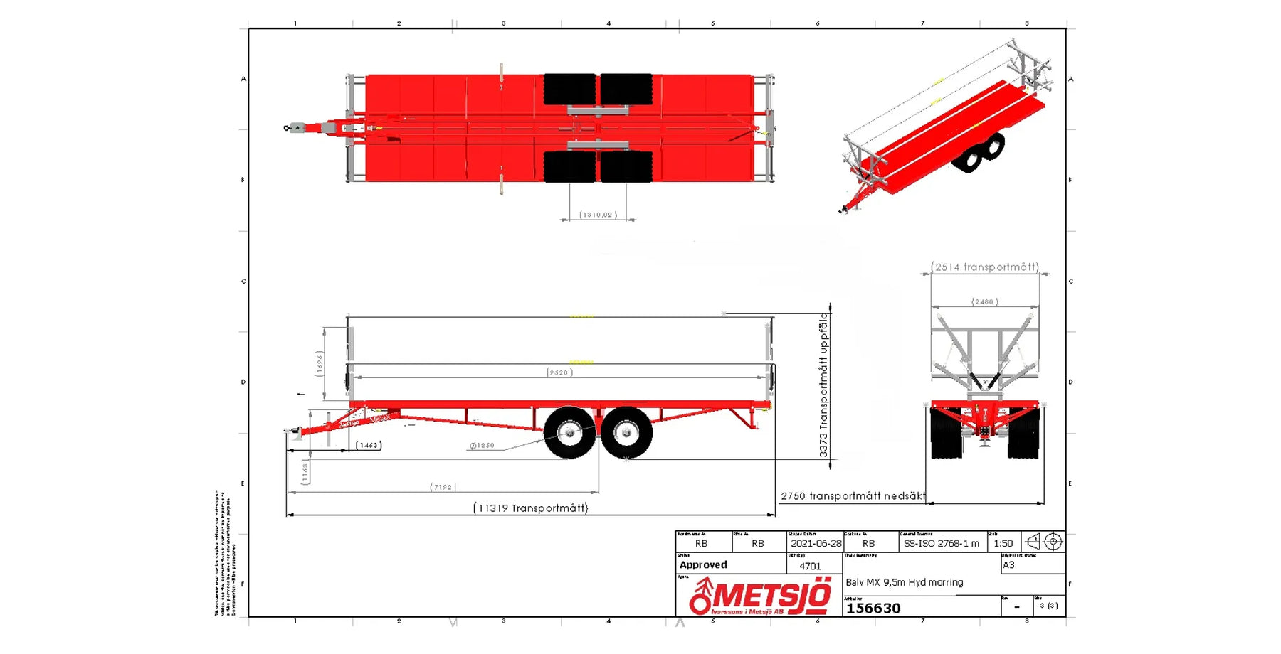 Artikelnummer komplett: 156630 Plåt Brinell 355: Tjocklek Botten 4 mm. Flaklängd 9000mm Hydraulic mooring L9500mm. UTV gripläge 2550mm - 2800mm Möjlighet att välja köra VÄ/HÖ sida (manuell kulventil på dragstång) Greppkraft vid 200 bar - 1300kg per rör Lastsäkring: Förstängdlast sidled 50% ger max sidbelastning 6,5 ton Kräver ett dubbelverkande hydrauliskt uttag Pendelboggi cc 1310 mm, Max belastning 9 ton/axel Avstånd över navflänsar 1780 mm. Ytbehandlas enligt KTL- metoden, svart Axel profil 120. Anslutning 220x275x8 mutter öppen Bromsar: hydrauliska på alla hjul - enligt VVFS 2003: 20, 5 Kap. 12 § Automatbromsarmar AGS. Max 110 bar hydraultryck. Skyddsplåt förhindrar smuts i trumma Belysning enligt TSV Diod 12/24 Volt 7 pol Bakdrag + eluttag 7 pol. Fäste för tillval H-grindar/balbåge/fram- och bakstam/hydr.mooring Fäste för valbart drag Färg Metsjö röd Chassivikt 4720 kg, Teknisk belastning 21 000 kg, Nyttolast 16 280 kg Ytbehandling: Förbehandling med alkalisk avfettning och blästring Sa 2,5 Karosseri kittas. Lackerat enl. ISO 12944 A3.09. Färgsystem: Epoxiprimer 2 x 70 µm. Täckfärg: Polyuretan 1 x 60 µm totalskikt ca. 200µm. Korrosivitetklass C4 L Kringutrustning: Grönfoderfot, 100201