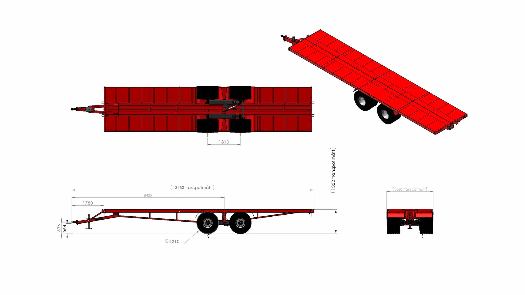 Artikelnummer komplett: 118305 Plåt Brinell 355: Tjocklek Botten 4 mm. Flaklängd 11500mm Pendelboggi cc 1810 mm, Max belastning 9 ton/axel Medspårande axel 2. Styrvinkel 18". Elektrisk låsning vid backning Avstånd över navflänsar 1780 mm. Ytbehandlas enligt KTL- metoden, svart Axel profil 120. Anslutning 220x275x8 mutter öppen Bromsar: hydrauliska på alla hjul - enligt VVFS 2003: 20, 5 Kap. 12 § Automatbromsarmar AGS. Max 110 bar hydraultryck. Skyddsplåt förhindrar smuts i trumma Belysning enligt TSV Diod 12/24 Volt 7 pol Fäste för valbart drag Färg Metsjö röd Chassivikt 4590 kg, Teknisk belastning 21 000 kg, Nyttolast 16 410 kg Ytbehandling: Förbehandling med alkalisk avfettning och blästring Sa 2,5 Karosseri kittas. Lackerat enl. ISO 12944 A3.09. Färgsystem: Epoxiprimer 2 x 70 µm. Täckfärg: Polyuretan 1 x 60 µm totalskikt ca. 200µm. Korrosivitetklass C4 L