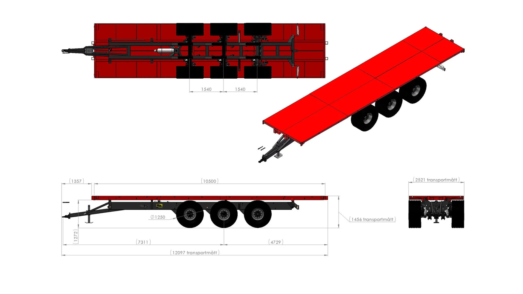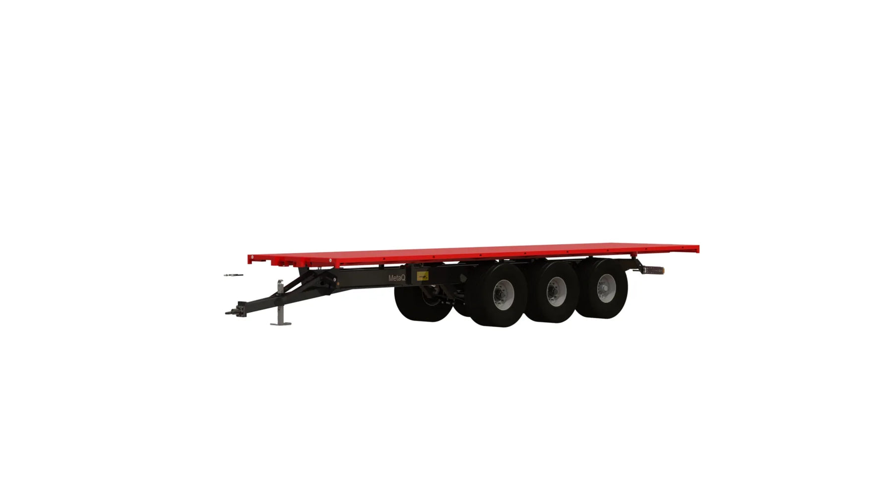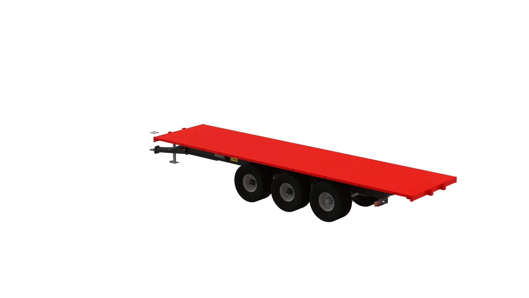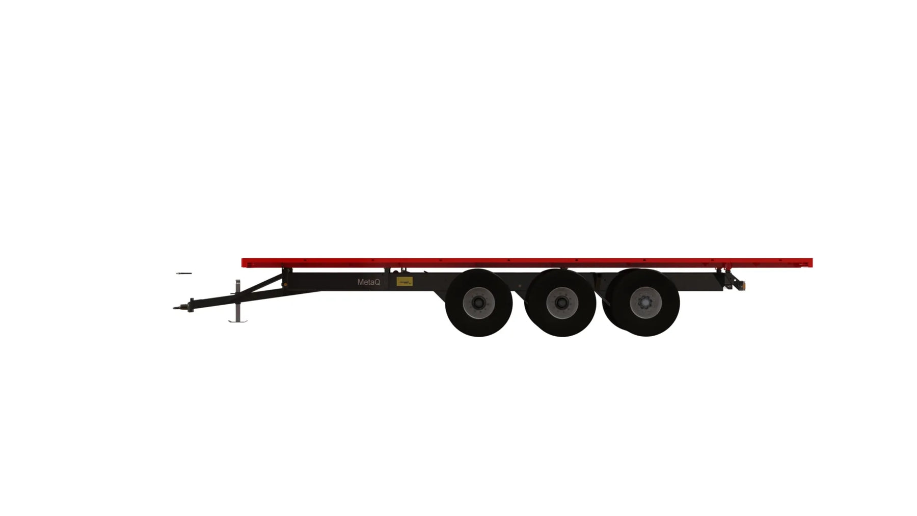 Artikelnummer chassi: 130357 Axlar: Hel axelkropp 150x150, Avstånd över navflänsar 2 000 mm Belastning 12 ton vid 62 km. Laserriktade. Ytbehandlade enligt KTL- metoden, svart Avstånd mellan boggiaxlar cc 1540 mm. Axelupphängning "Road" Medspårande axel med hydraulisk låsning vid backning (axel 3) Anslutning 280x335x10 kupolmutter Kommunicerande kärl: Hydrauliskt reglerbart chassi 350 mm vid chassit Bromsstorlek: 410x180. Hydrauliska bromsar på alla hjul - enligt VVFS 2003: 20, 5 Kap. 12 § Automatbromsarmar AGS. Max 110 bar hydraultryck. Skyddsplåt förhindrar smuts i trumma Baktipp. Tippvinkel: 52º. Oljevolym 63L/210 bar. Elsystem 12 Volt Belysning enligt TSV Diod 12/24 Volt 7 pol Automatlämsfäste Fäste för valbart drag Färg Metsjö grå Förberett för valfri påbyggnad MetaQ95 Chassivikt 4 800 kg Teknisk belastning: 39 000 kg Artikelnummer flak: 105693 Transport/Balflak MQ95 L10500 B2550 Plåt Brinell 355: Tjocklek Botten 4 mm Avstånd framstam / dragögel 1400 mm Stödvikt 20% (stödvikt på standard tippflak 60 %) Vid lastning måste föraren av ekipaget förvissa sig om att erforderlig stödlast finns för säker transport i rådande förhållande Går ej att serie hänga Går att tippa Bindpunkter UTV flaklina Fäste för tillval H-grindar/balbåge/fram- och bakstam Fästen för redskapsbytarben Lackas Metsjö Röd, karosseri kittas enligt Metsjö standard För MetaQ 95 / Olympia 95 chassi Vikt 1800 kg Vagns vikt 6600 kg, Nyttolast 32 400 kg Ytbehandling: Förbehandling med alkalisk avfettning och blästring Sa 2,5 Karosseri kittas. Lackerat enl. ISO 12944 A3.09. Färgsystem: Epoxiprimer 2 x 70 µm. Täckfärg: Polyuretan 1 x 60 µm totalskikt ca. 200µm. Korrosivitetklass C4 L