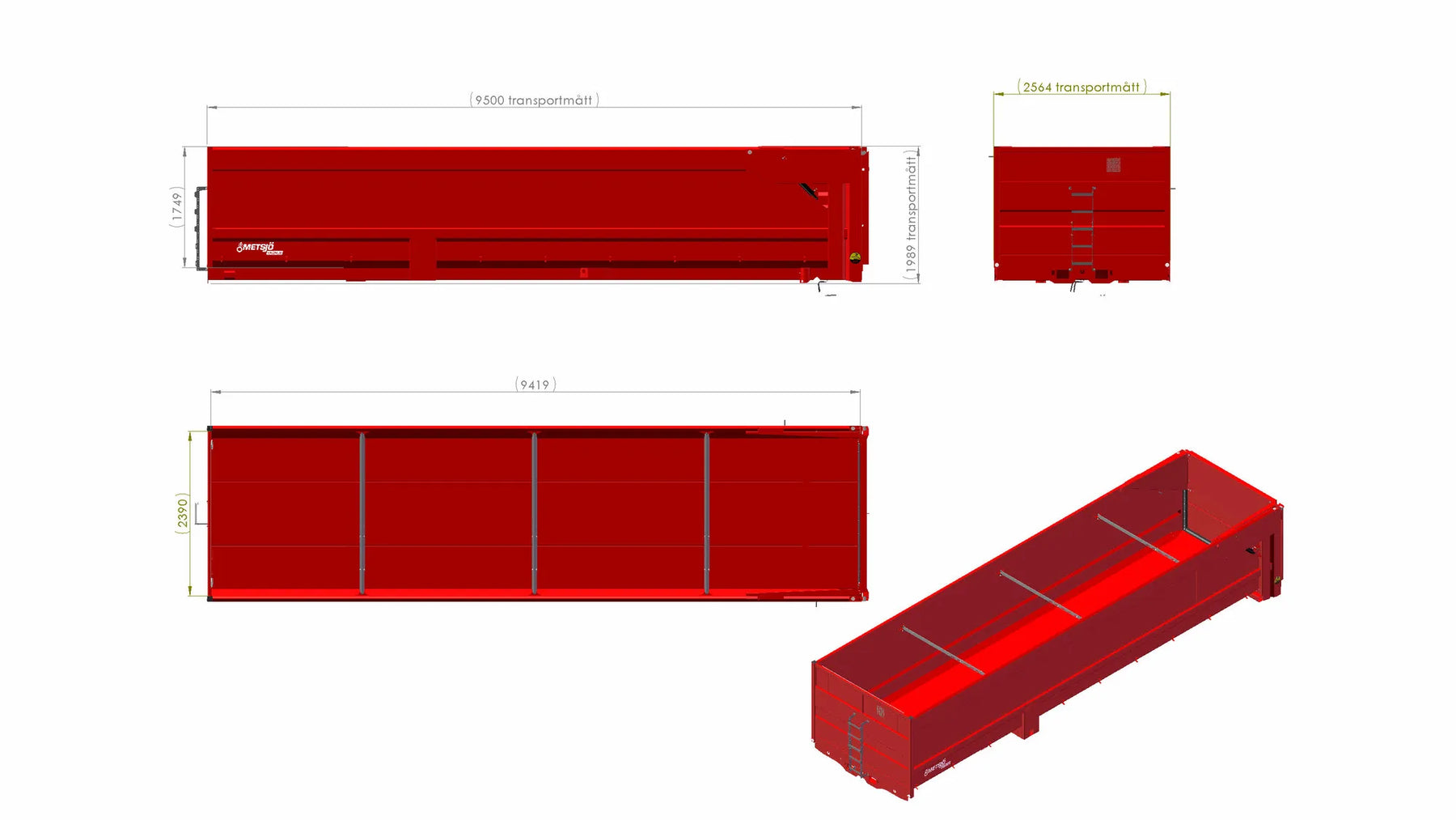 Slidplade Brinell 450: Tykkelse Bund 3,2 mm, Side 2 mm Bagklap: Hydraulisk højåbning 130" H1750. Drypsikker Skærmdør i frontkarm 500x2000 perforering inkl. dækplade Eksterne bindingspunkter Beslag til værktøjsskifterben Malet Metsjö Rød, karrosserispartel i henhold til Metsjö standard Til MetaQ 95 ..4aksel 144354/ Olympia 95 chassis Vægt 2820 kg