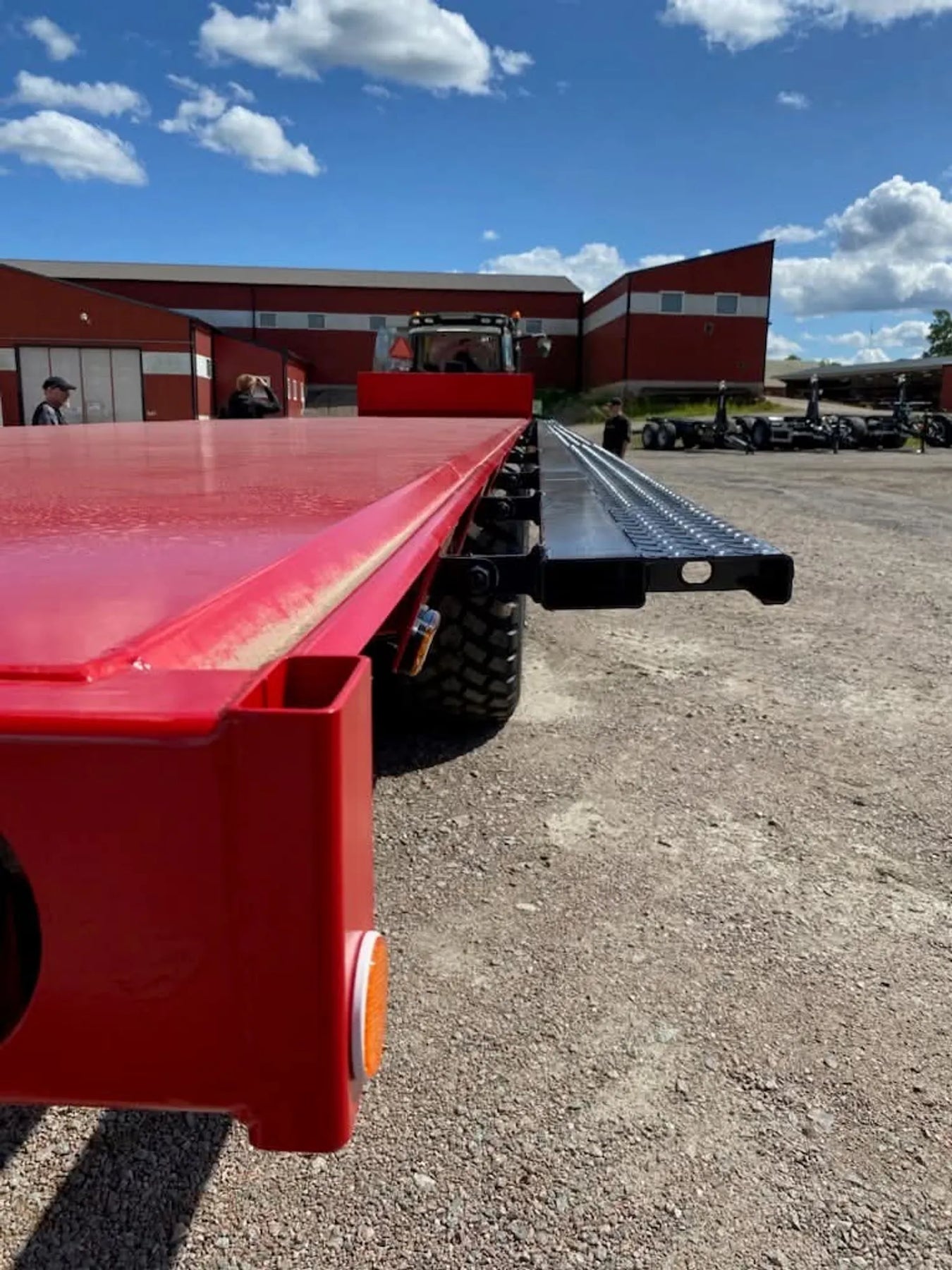 Komplet artikelnummer: 168301 Platformhøjde 1292mm Platformlængde 13700 mm Bredde 2515mm Plade Brinel 450: Tykkelse Bund 4 mm (hardox) Aksler: Helakselhus 120x120, Afstand over navflanger 2.000 mm Sporaksel med hydraulisk låsning ved bakning (aksel 3) Last 10,5 tons ved 62 km. Laserstyret. Overfladebehandlet efter KTL metoden, sort Afstand mellem bogieaksler cc 1540 mm (24 tons). Akselaffjedring "Road" Tilslutning 280x335x10 kuppelmøtrik Kommunikationsbeholder: Hydraulisk justerbart chassis 350 mm ved chassis Bremsestørrelse: 410x120. Hydrauliske bremser på alle hjul - ifølge VVFS 2003: 20, 5 Kap. Afsnit 12 Automatiske bremsegreb AGS. Max 110 bar hydraulisk tryk. Beskyttelsesplade forhindrer snavs i at trænge ind i tromlen Belysning iht. TSV Diode 12/24 Volt 7 polet Beslag til valgfri trækning Konstruktion giver mulighed for hjulvalg min dia 1200 max dia1400 Bredde 800 Bindepunkter UTV flad linje Beslag til valgfri H-porte/ballebue/for- og bagstamme/hydr.fortøjning Farve Metsjö rød Chassisvægt 6000 kg Teknisk belastning: 34.000 kg Nyttelast 28.000 kg Overfladebehandling: Forbehandling med alkalisk affedtning og blæsning Sa 2,5 Karrosseriet er spartlet. Malet iflg ISO 12944 A3.09. Malingssystem: Epoxy primer 2 x 70 µm. Topcoat: Polyurethan 1 x 60 µm samlet lag ca. 200 µm. Korrosivitetsklasse C4 L