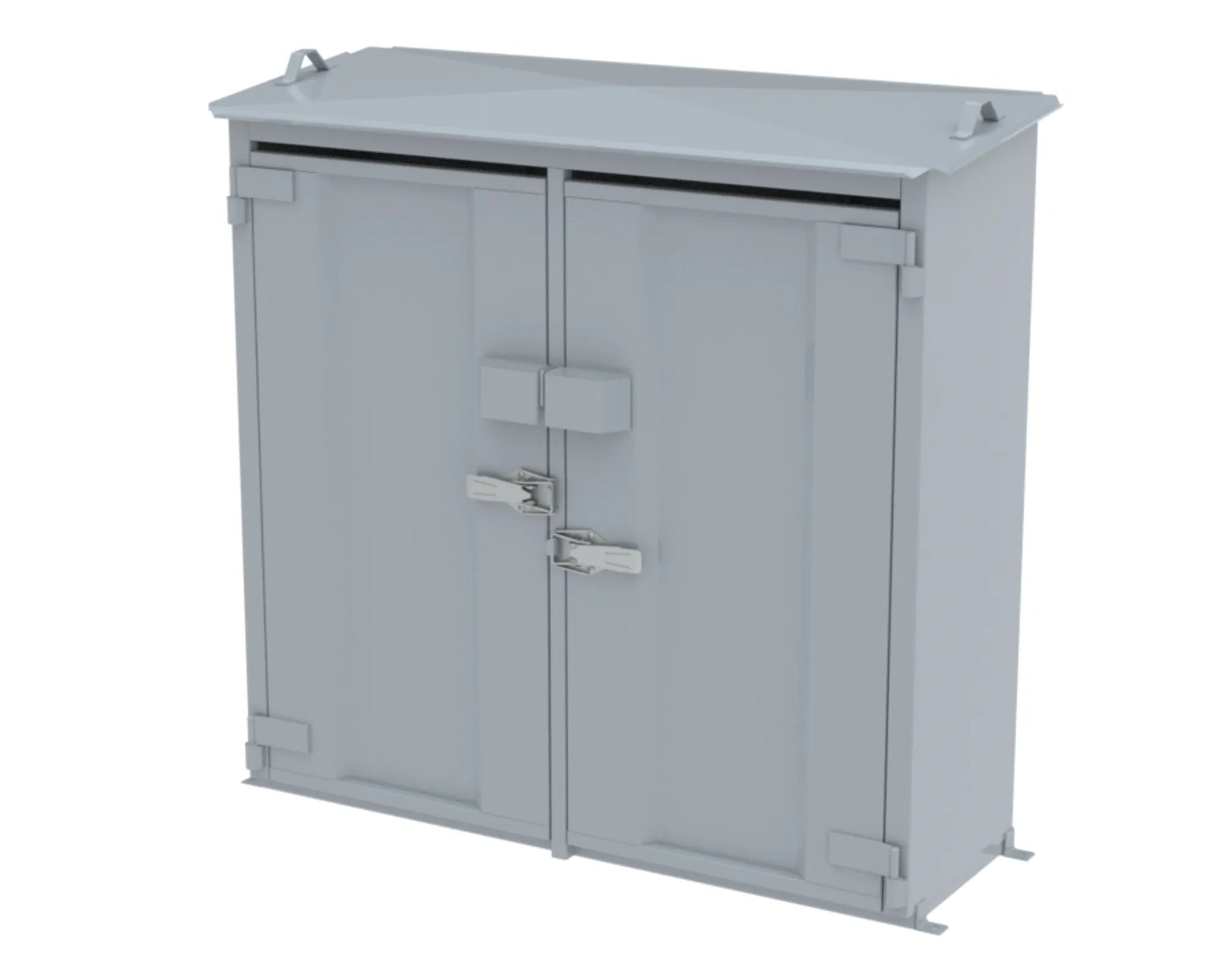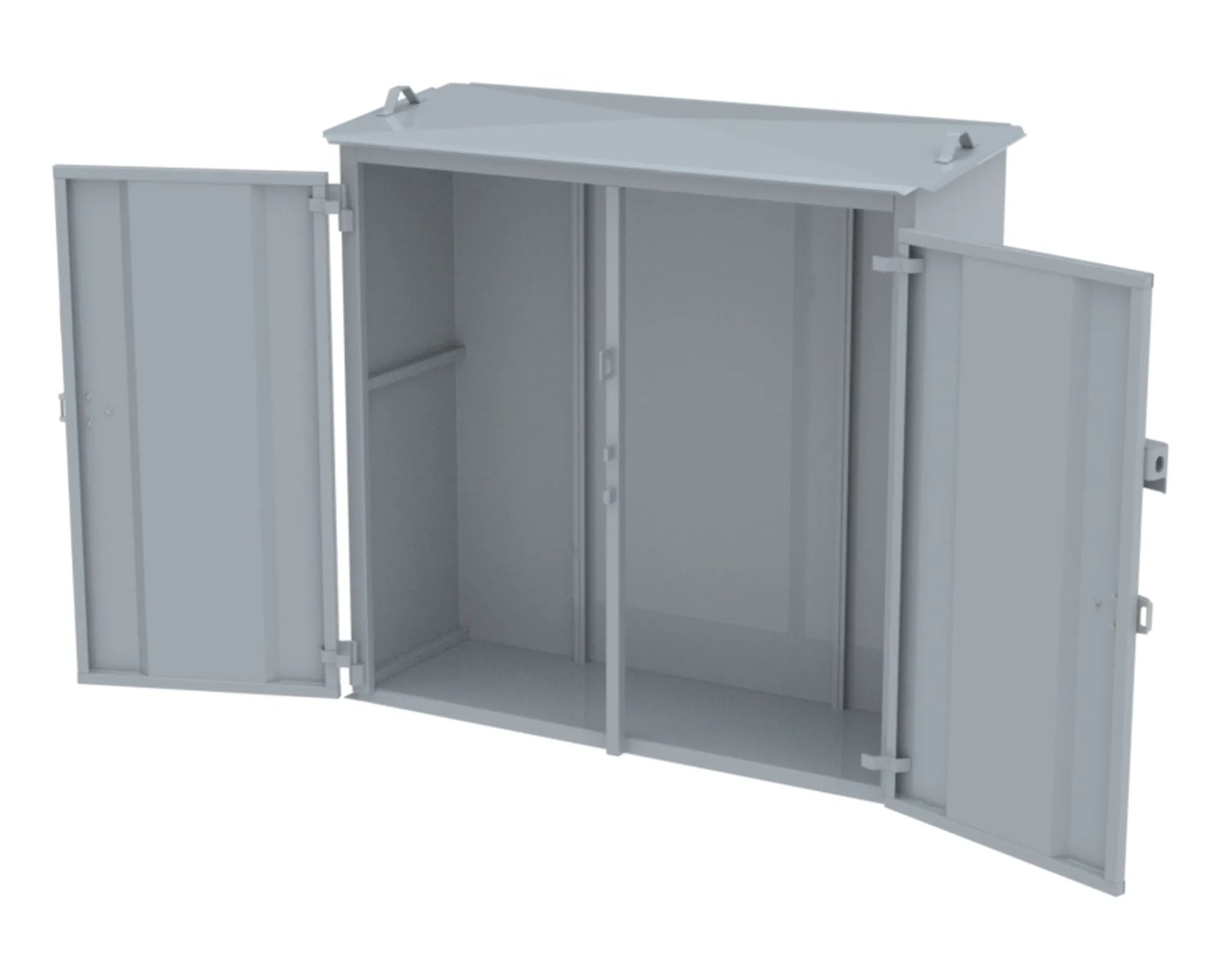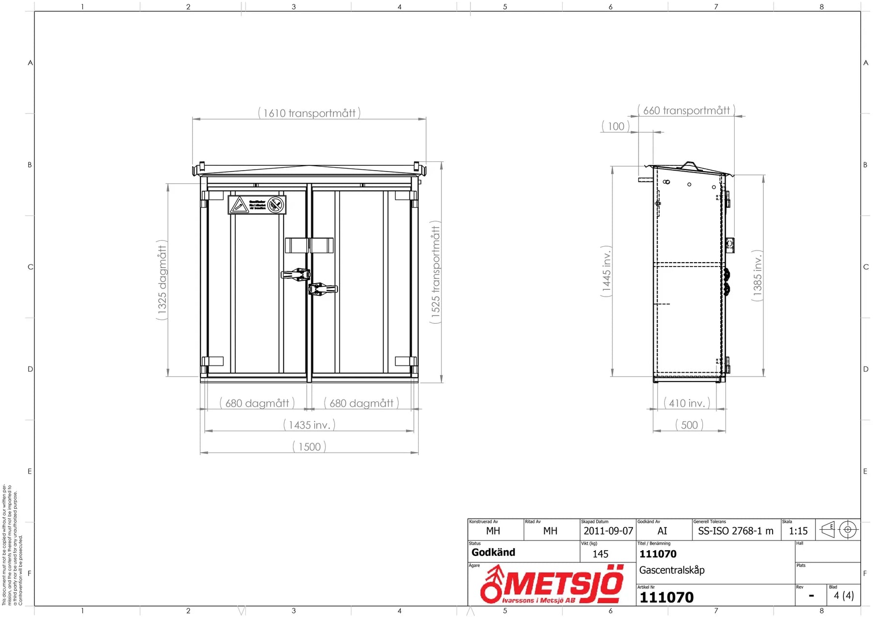 Invändigt mått B.H.D 1435x1385x410 mm. Transportmått B.H.D 1610x1525x660 mm. Konstruktion av 1,5 mm stålplåt intermittent svetsad. Vikt 145 kg. Godkänd försäkringsklass 2. Låses med 2 st snabblås samt hänglås (bygel 14-65). Dörröppning 180º, gångjärn med avhakningssäkring. Ventilation “självdrag” 1% av golvyta, över och under dörrblad. Takrila för vattenavledning åt höger och vänster sida. Invändigt placerad armaturbalk för montering av gasutrustning. Tippskydd (förankring i vägg). SKOTTGENOMGÅNG ELLER HÅLTAGNING ÄR TILLVAL OCH MÅSTE ANGES VID BESTÄLLNING OBS! Ytbehandling enligt ISO 12944: Förbehandling med alkalisk avfettning och blästring Sa 2,5 Kittning sker där konstruktion ej medger helsvetsning C4-Med. Totalskikt ca 200µm. Epoxi grundfärg, Polyuretan täckfärg ger 15 år Inv. skåp C3 enl. Metsjö standard. Bildar en yta som väl bibehåller glans och kulör samt är lätt att rengöra.