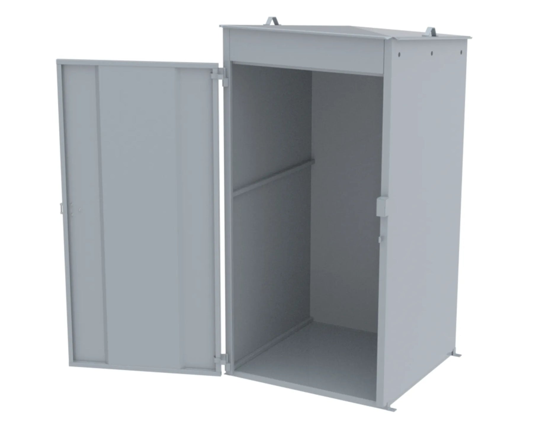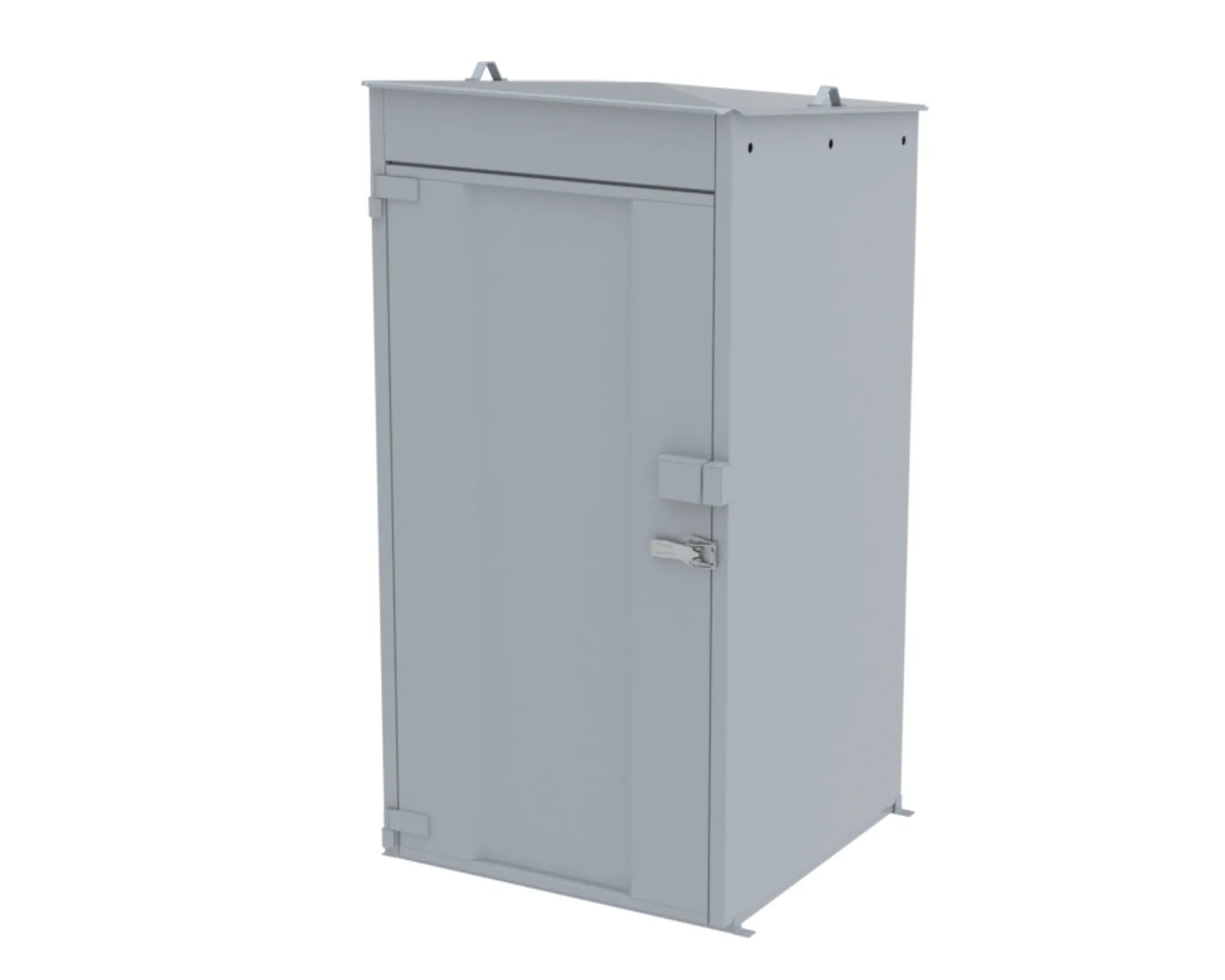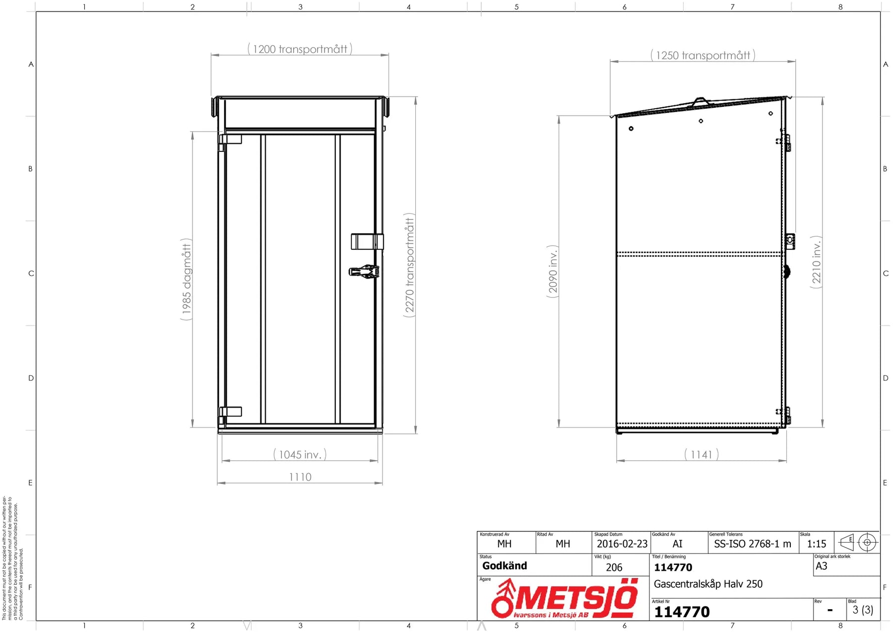 Invändigt mått B.H.D 1045x2090x1035 mm Transportmått B.H.D 1200x2270x1250 mm Konstruktion av 1,5 mm stålplåt intermittent svetsad. Godkänd försäkringsklass 2. Vikt 210 kg. Låses med 1 st snabblås samt hänglås (bygel 14-65) Dörröppning 180º. Gångjärn med avhakningssäkring. Ventilation “självdrag”, 1% av hela golvytan och dörrbladets översida.under taksprång och dörrblad. Takrila för vattenavledning åt höger och vänster sida. SKOTTGENOMGÅNG ELLER HÅLTAGNING ÄR TILLVAL OCH MÅSTE ANGES VID BESTÄLLNING OBS! ÄVEN ARMATURBALK ÄR TILLVAL OBS! Ytbehandling enligt ISO 12944: Förbehandling med alkalisk avfettning och blästring Sa 2,5 Kittning sker där konstruktion ej medger helsvetsning C4-Med. Totalskikt ca 200µm. Epoxi grundfärg, Polyuretan täckfärg ger 15 år Inv. skåp C3 enl. Metsjö standard. Bildar en yta som väl bibehåller glans och kulör samt är lätt att rengöra.