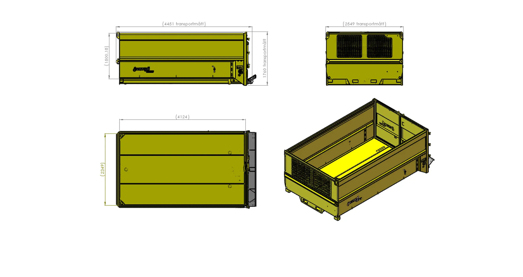 Abschrägung zur Pritsche 2x45"; Volumen 13m3 Hydraulische Schwerlastheckklappe H 300 mm Innere Heckklappe Türen 270" an der Längsseite eingehakt. Angepasst für Kräne Netzsichtfenster (Material 13-32x4) Verschleißblech Brinell 450 Stärke Boden 3,2 mm, Seiten 3,2 mm Passt für Sand und Pakrmaterial Universalhaken zur Ladesicherung aussen/innen Befestigungspunkten für einen Leiter innen/aussen Befestigungspunkten für einen Schaufel/Stange Halter Befestigungspunkten für Standbeine der Mulde Farbe Gelb, lackiert gemäß Metsjö Standard Passt auf MetaMid und MetaNo Fahrgestell Gewicht 1440 kg