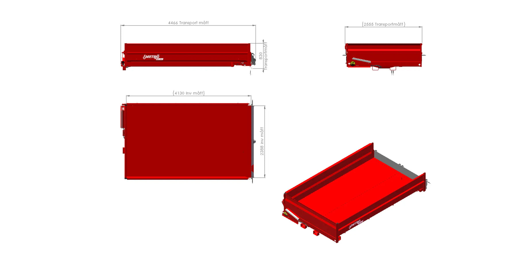 Verschleißblech Brinell 450 Stärke Boden 4 mm Verschleißblech Brinell 450 Stärke Vorderwand 3 mm Verschleißblech Brinell 450 Stärke Seiten 3 mm Passt für Kies Hydraulische Schwerlastheckklappe H 300 mm Die rechte Seite sind ist hydraulsich unten klappbar, Höhe 600mm, Länge der Seiten 4000mm Scharnierbeschlägen 4 St., Schnallen 4 St. pro Sektion Vorderwandhöhe 600mm Befestigungspunkten für verschiedene Heckklappen Befestigungspunkten für Standbeine der Mulde Farbe Rot, lackiert gemäß Metsjö Standard Passt auf MetaMid und MetaNo Fahrgestell Gewicht 1 330 kg