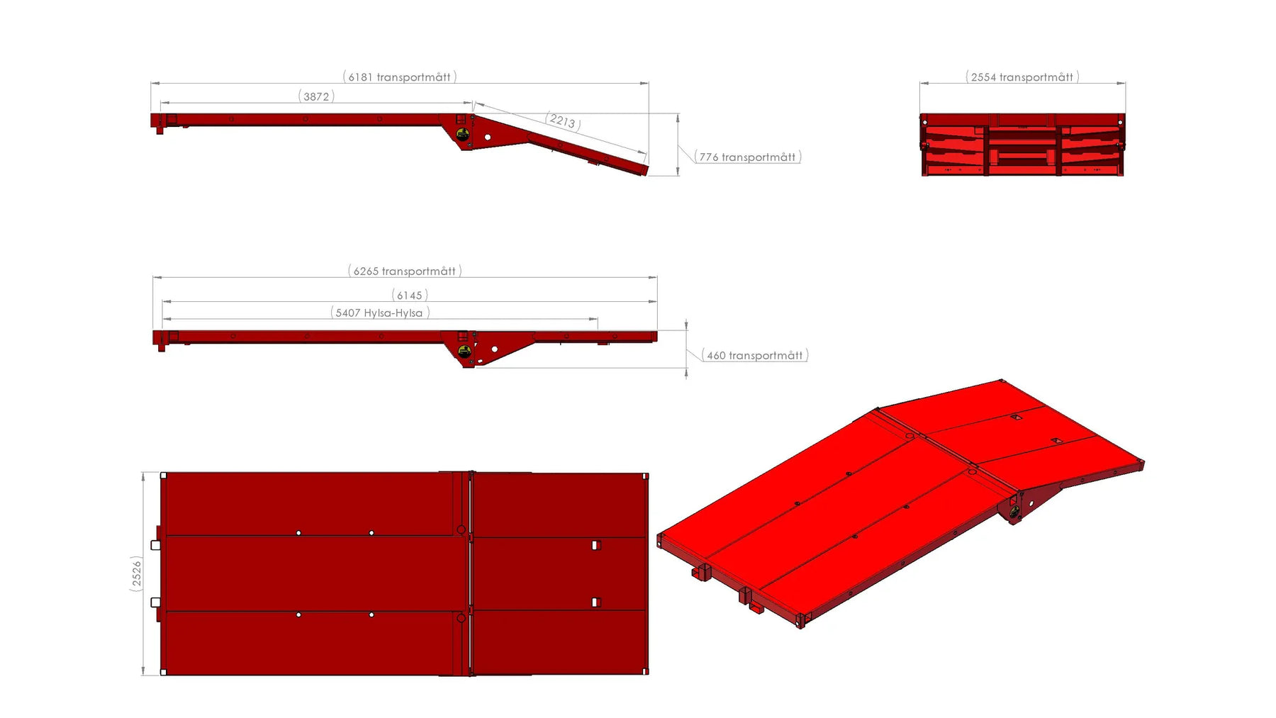 Verschleißblech Brinell 450 Stärke Boden 2 mm Länge 6 265 mm, Flachteil 3925 mm, gependelte Rampe 2340mm Versenkte LED Beleuchtungsarmaturen 12/24V in Hecktraverse Universalhaken zur Ladesicherung aussen Abstand 900mm Löcher für Sicherung der Ladung 2+2 (Flachteil montiert) Abstand 1015mm Befestigungspunkten für verschiedene Zubehöre für Ballentransport 5420mm Befestigungspunkten für Zubehör "Rutschgefahrschutz 500x1000" Befestigungspunkten für Standbeine der Mulde Farbe Rot, lackiert gemäß Metsjö Standard Passt auf MetaMid und MetaNo Fahrgestell Man kan Ballen, Maschine und Kasten transportieren. Nur für Maschine mit einer Gummibereifung. Das Wechseln zwischen Ballen/Maschinentransport ist mit der Kippfunktion gemacht. Die Bolzen wegnehmen und bis Boden mit der Plattform fahren. Wann die Plattform ganz flach ist, montiert man wieder die Bolzen. Achten Sie, dass sie eine erforderlige Belastung auf dem Schlepper haben. Prüfen Sie die Kompletthöhe beim Maschinentransport Gewicht 910 kg