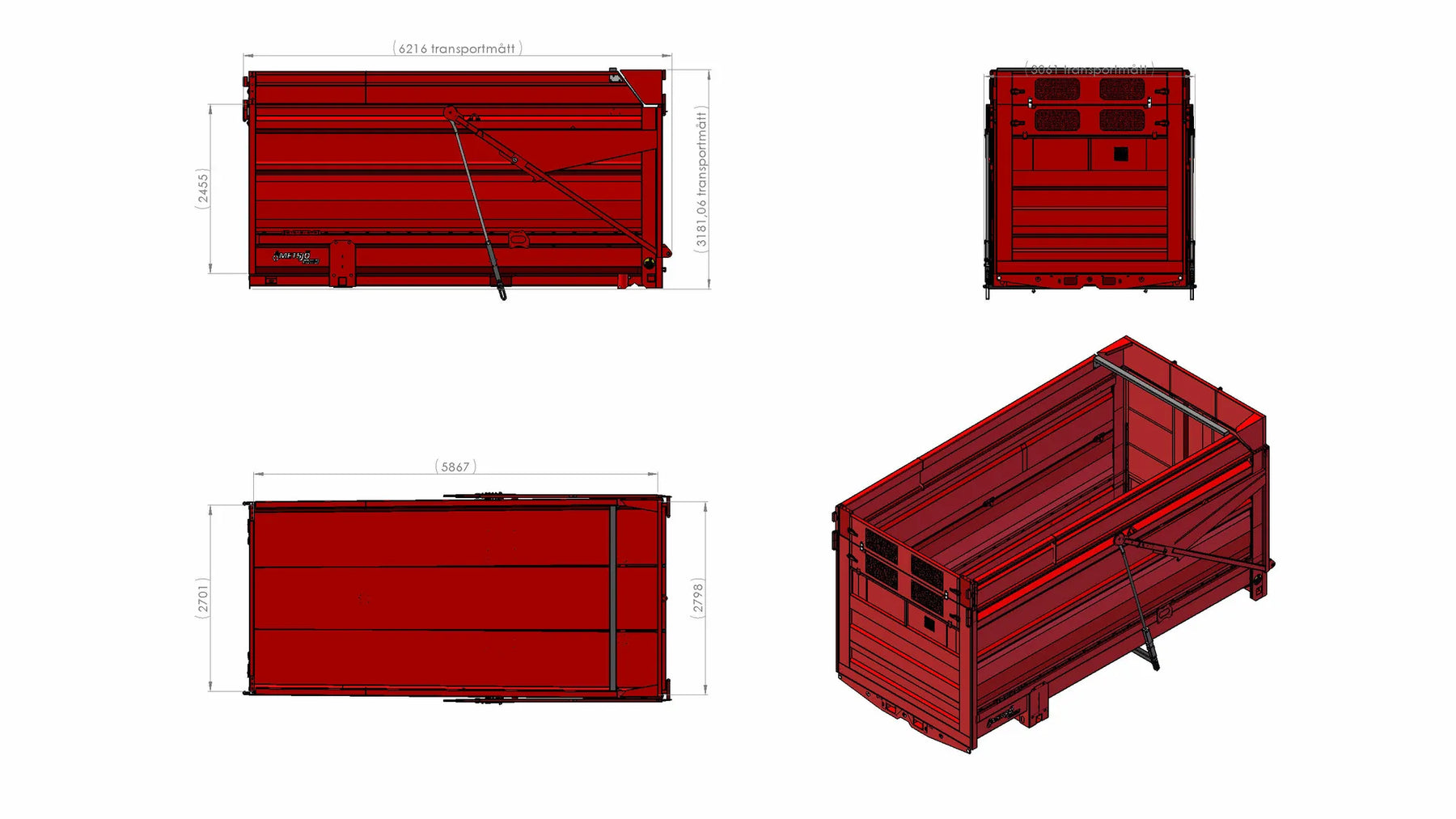 Verschleißblech Brinell 450 Stärke Boden 3,2 mm, Seiten 2mm Abschrägung zur Pritsche 2x45" Automatische Heckklappe - beim Kippen automatisch geöffnet Möglichkeit das Öffnen der Heckklappe zu verzögern Das Oberteil der Vorderwand ist demontierbar 450mm klappbar Ladebereich=Höhe 3000mm (bei Reifenwahl mit Durchmesser 1400mm, Total Höhe 4,5m) Konische Mulde 100mm Standard ohne Dach Befestigungspunkten für Zubehör "Dichtung der Heckklappe" Befestigungspunkten für Zubehör "hydraulische Öffnung der Heckklappe" Befestigungspunkten für ein Dach/Aufsatz Befestigungspunkten für Standbeine der Mulde Farbe Rot, lackiert gemäß Metsjö Standard Passt auf MetaQ60 und Olympia 60 Fahrgestell Gewicht 2 760 kg Ausgestattet mit: Demontierbare Vorderwand H450, 139997-Röd