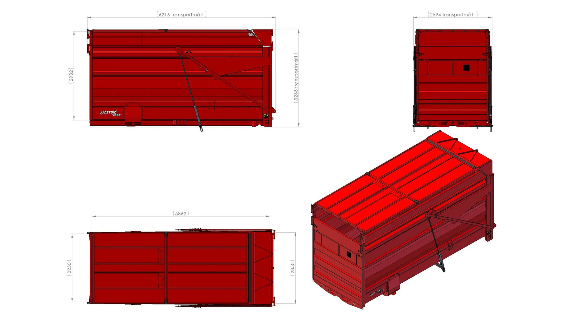 Verschleißblech Brinell 450 Stärke Boden 3,2 mm, Seiten 2mm Abschrägung zur Pritsche 2x45" Automatische Heckklappe - beim Kippen automatisch geöffnet Möglichkeit das Öffnen der Heckklappe zu verzögern Das Oberteil der Vorderwand ist demontierbar 450mm Ladebereich=Höhe 3000mm (bei Reifenwahl mit Durchmesser 1400mm, Total Höhe 4,5m) Konische Mulde 100mm Standard mit Dach Befestigungspunkten für Zubehör "Dichtung der Heckklappe" Befestigungspunkten für Zubehör "hydraulische Öffnung der Heckklappe" Befestigungspunkten für ein Dach/Aufsatz Befestigungspunkten für Standbeine der Mulde Farbe Rot, lackiert gemäß Metsjö Standard Passt auf MetaQ60 und Olympia 60 Fahrgestell Gewicht 2 710 kg Ausgestattet mit: Demontierbare Vorderwand H450, 124625-Röd