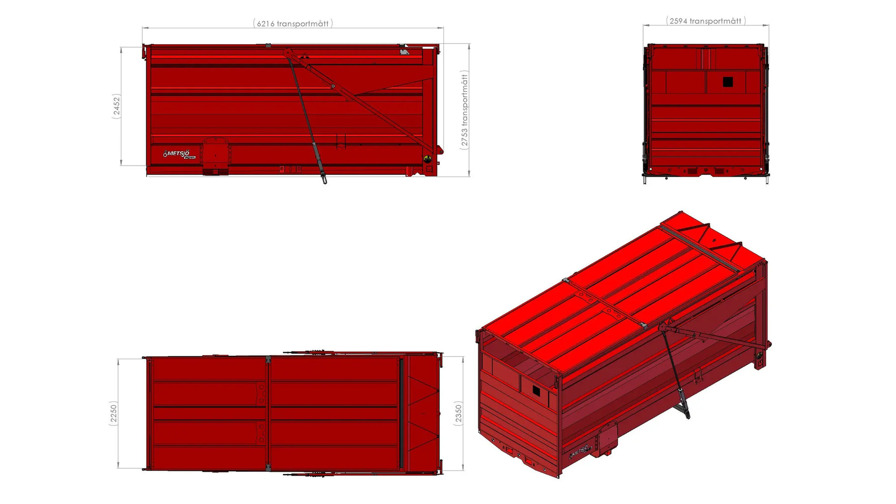 Verschleißblech Brinell 450 Stärke Boden 3,2 mm, Seiten 2mm Abschrägung zur Pritsche 2x45" Automatische Heckklappe - beim Kippen automatisch geöffnet Möglichkeit das Öffnen der Heckklappe zu verzögern Das Oberteil der Vorderwand ist demontierbar 450mm Ladebereich=Höhe 2500mm (bei Reifenwahl mit Durchmesser 1400mm, Total Höhe 4m) Konische Mulde 100mm Standard mit Dach Befestigungspunkten für Zubehör "Dichtung der Heckklappe" Befestigungspunkten für Zubehör "hydraulische Öffnung der Heckklappe" Befestigungspunkten für ein Dach/Aufsatz Befestigungspunkten für Standbeine der Mulde Farbe Rot, lackiert gemäß Metsjö Standard Passt auf MetaQ60 und Olympia 60 Fahrgestell Gewicht 2 500 kg Ausgestattet mit: Demontierbare Vorderwand H450, 124625-Röd