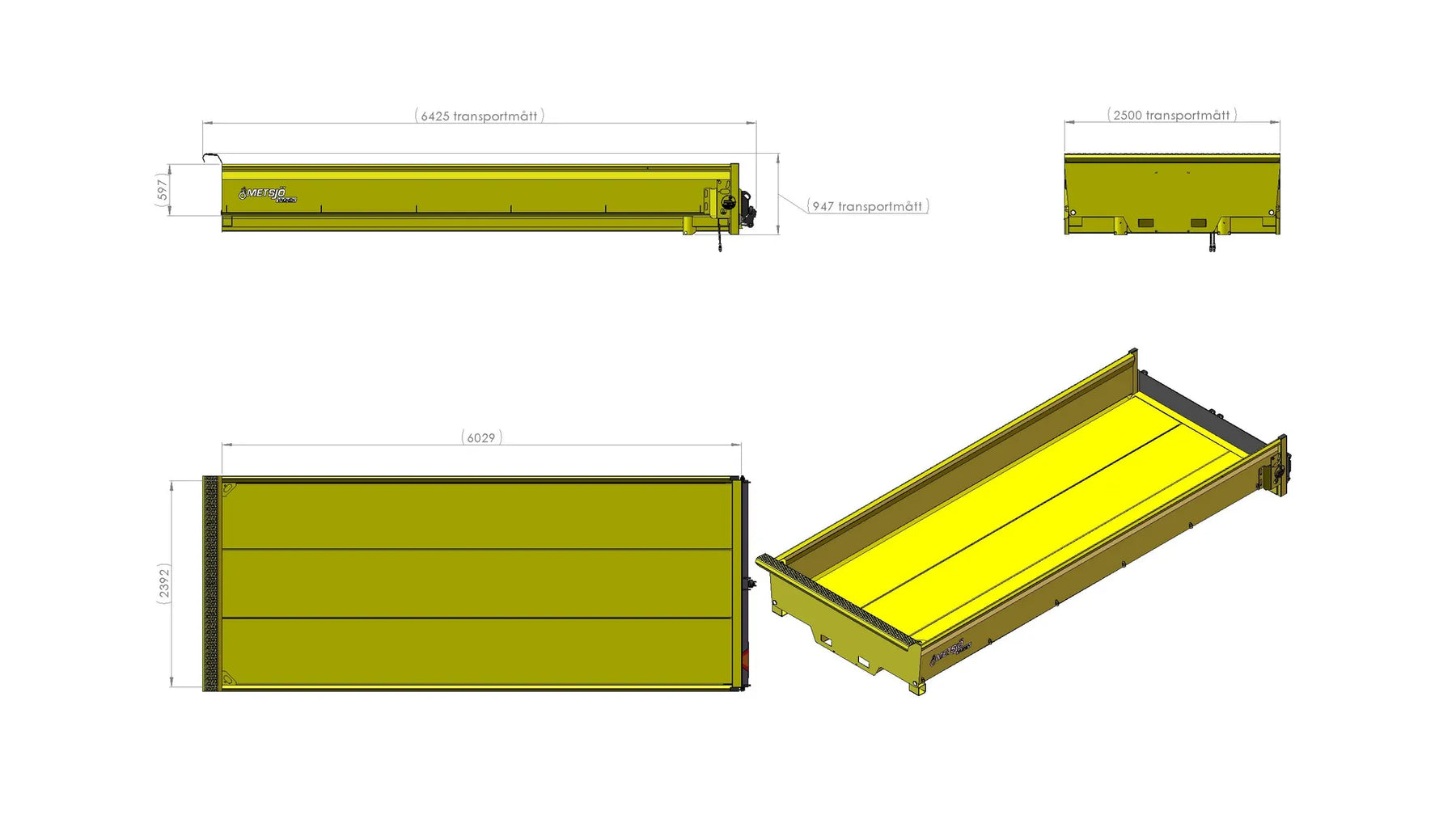 Abschrägung zur Pritsche 2x45" Hydraulische Schwerlastheckklappe H 300 mm Verschleißblech Brinell 450 Stärke Boden 3,2 mm, Seiten 3,2 mm Passt für Sand Universalhaken zur Ladesicherung aussen/innen Befestigungspunkten für verschiedene Heckklappen Befestigungspunkten für einen Getreideaufsatz Befestigungspunkten für Standbeine der Mulde Farbe Gelb, lackiert gemäß Metsjö Standard Passt auf MetaQ60 und Olympia 60 Fahrgestell Gewicht 1090 kg