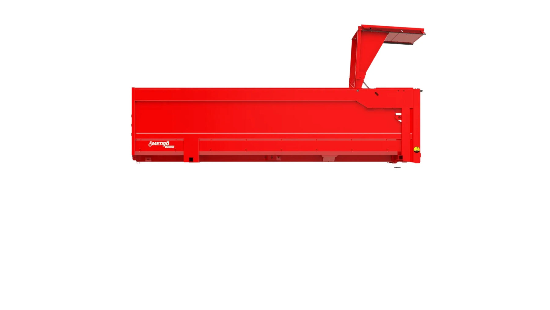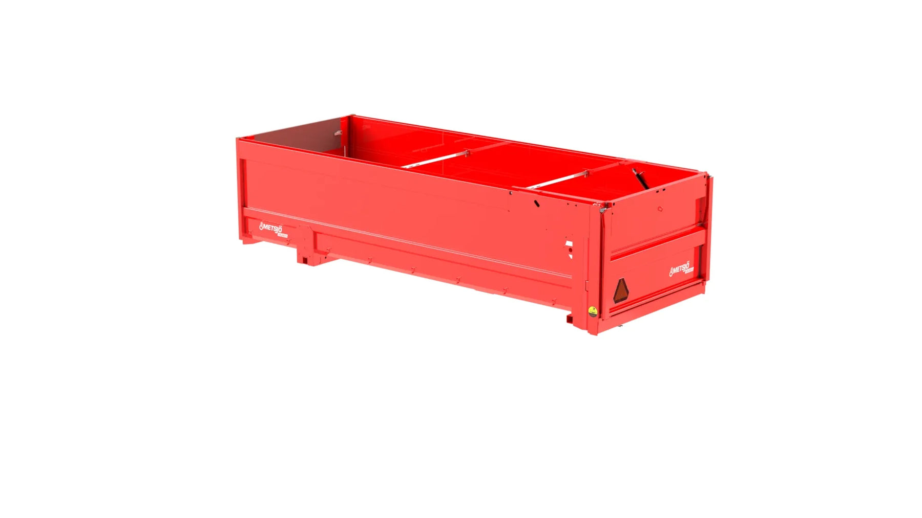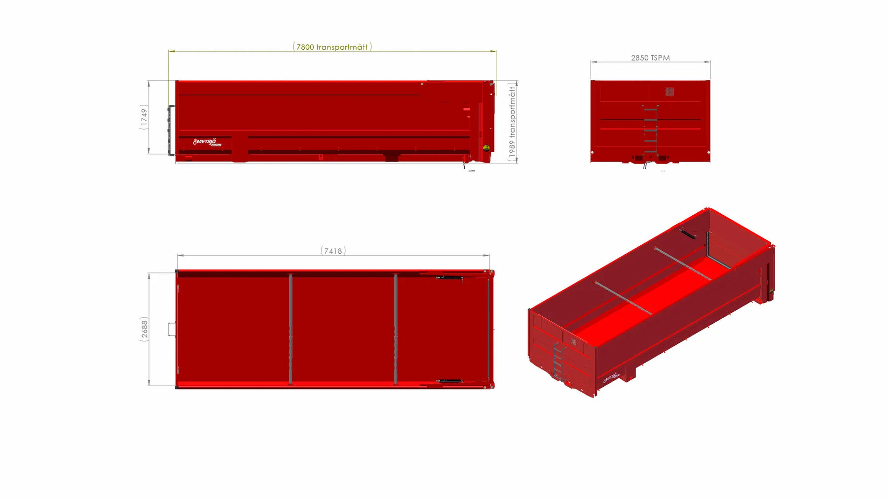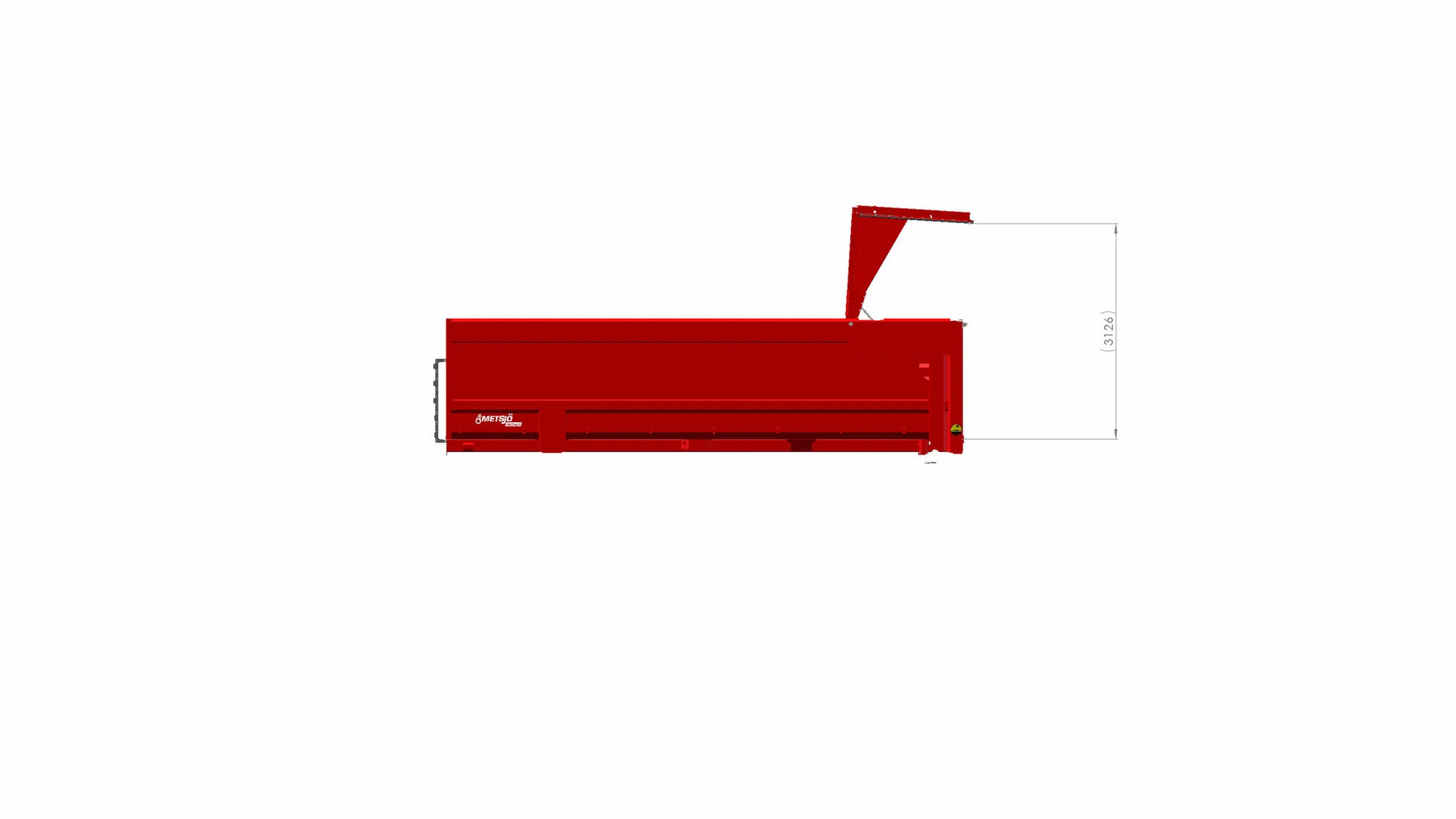 Verschleißblech Brinell 450 Stärke Boden 3,2 mm, Seiten 2 mm Hydraulische Heckklappe H1750, Öffnungswinkel 130". Tropfsicher Sichtfenster in der Vorderwand 500x2000 (perforiert) inkl. Abdeckplatte Universalhaken zur Ladesicherung aussen Befestigungspunkten für Standbeine der Mulde Farbe Rot, lackiert gemäß Metsjö Standard Passt auf MetaQ75 und Olympia 75 Fahrgestell Gewicht 2 500 kg