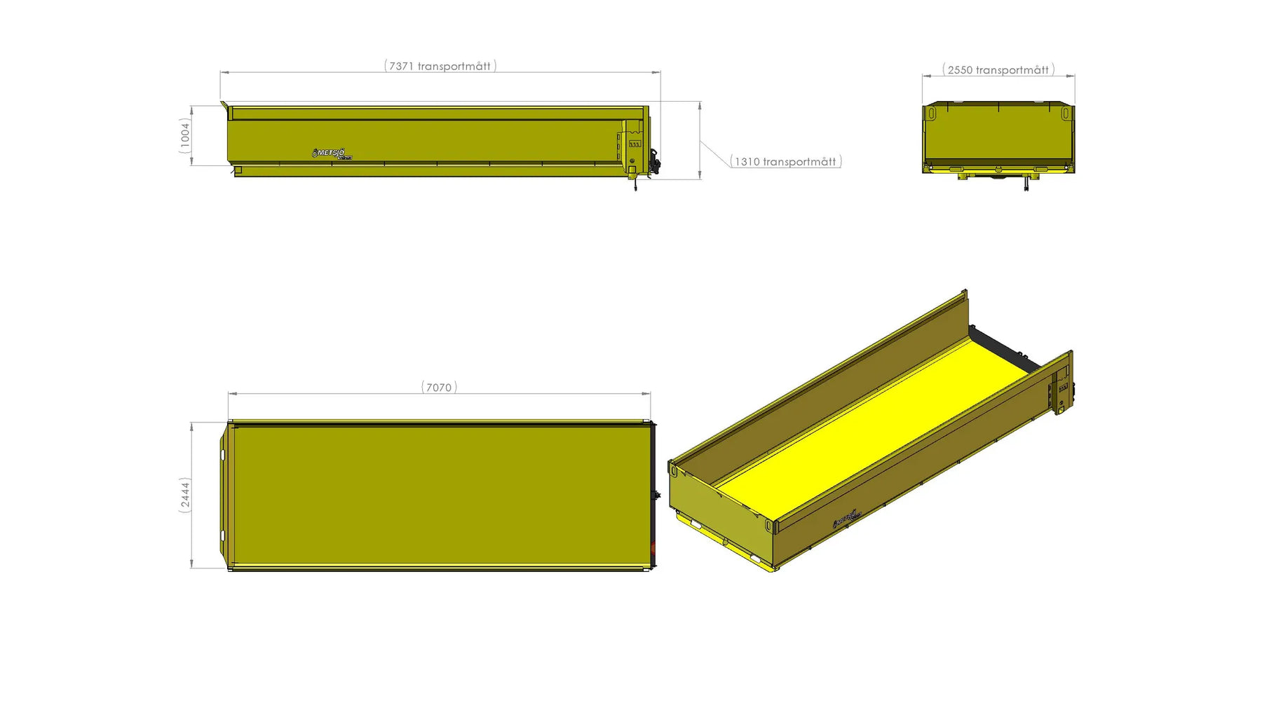 Abschrägung zur Pritsche 3x30" Hydraulische Schwerlastheckklappe H 300 mm Verschleißblech Brinell 450 Stärke Boden 6 mm, Seiten 3 mm Passt für Kies Universalhaken zur Ladesicherung aussen/innen Befestigungspunkten für verschiedene Heckklappen Befestigungspunkten für Standbeine der Mulde Farbe Gelb, lackiert gemäß Metsjö Standard Passt auf MetaQ75 und Olympia 75 Fahrgestell Gewicht 2 370 kg
